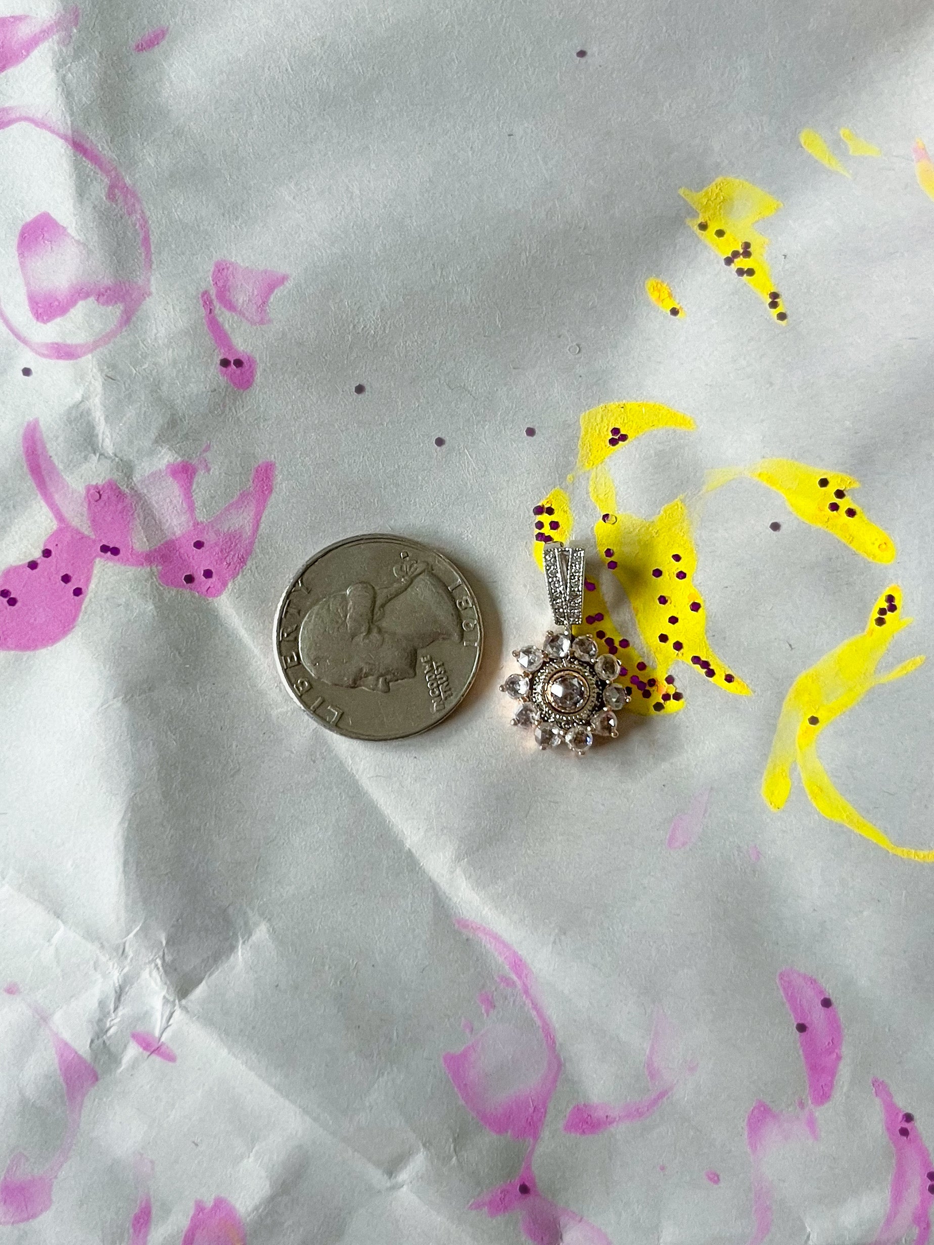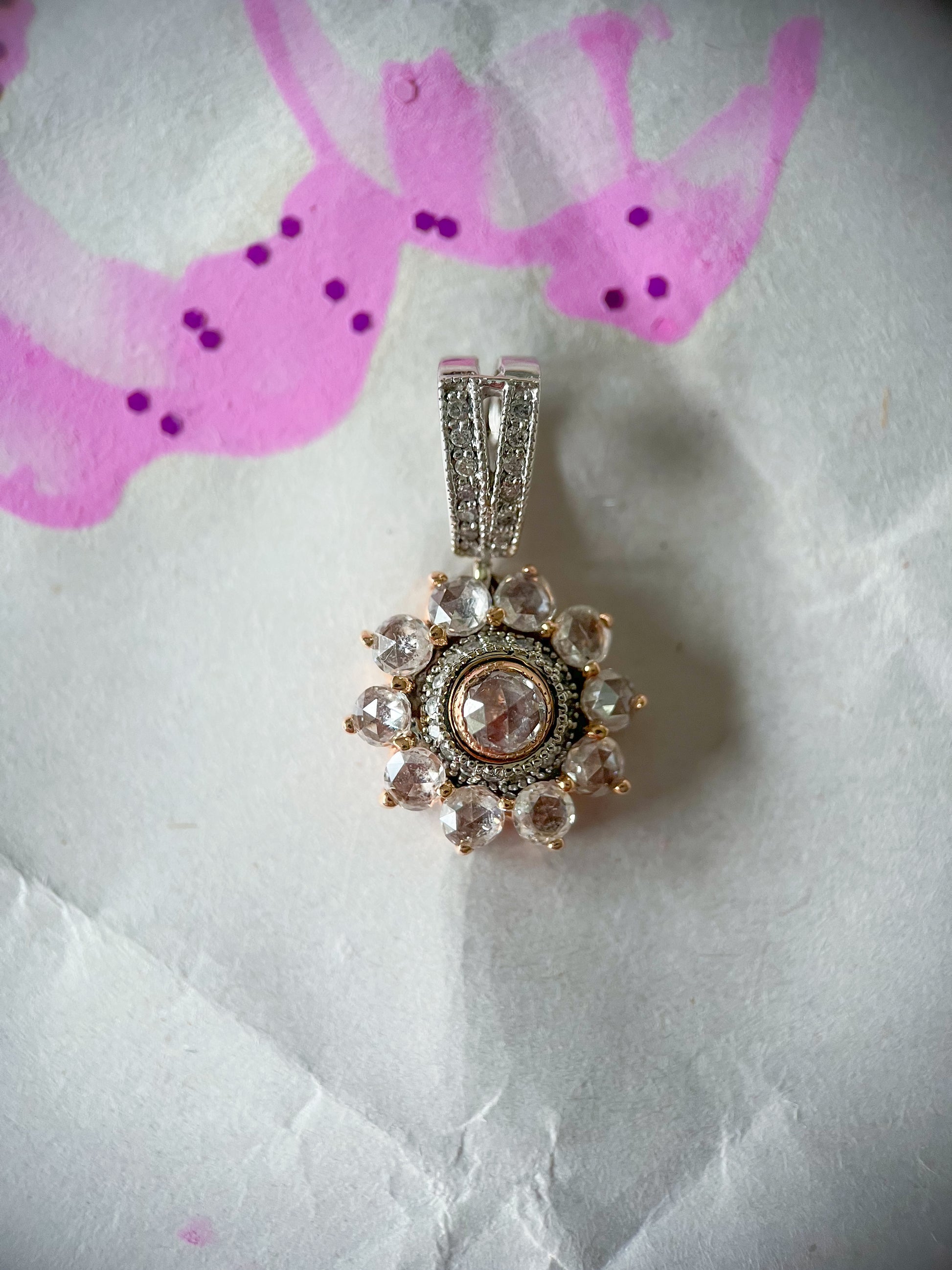Really unique, 14k rose and white gold pendant featuring rose cut light pink diamonds. This piece weighs 3.48 grams and has approximately 1.20 carats of diamonds.