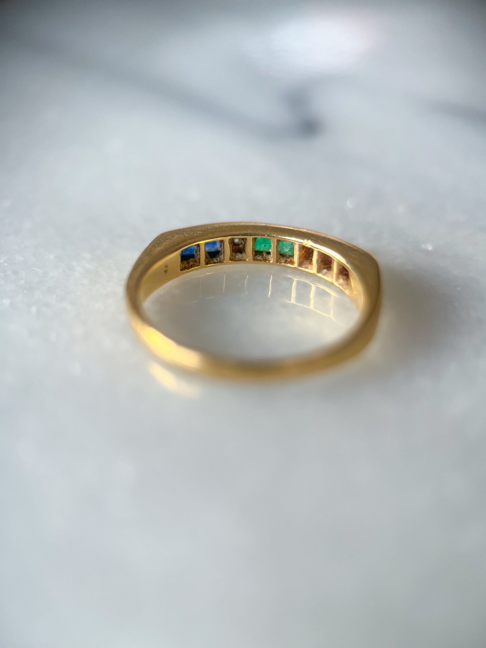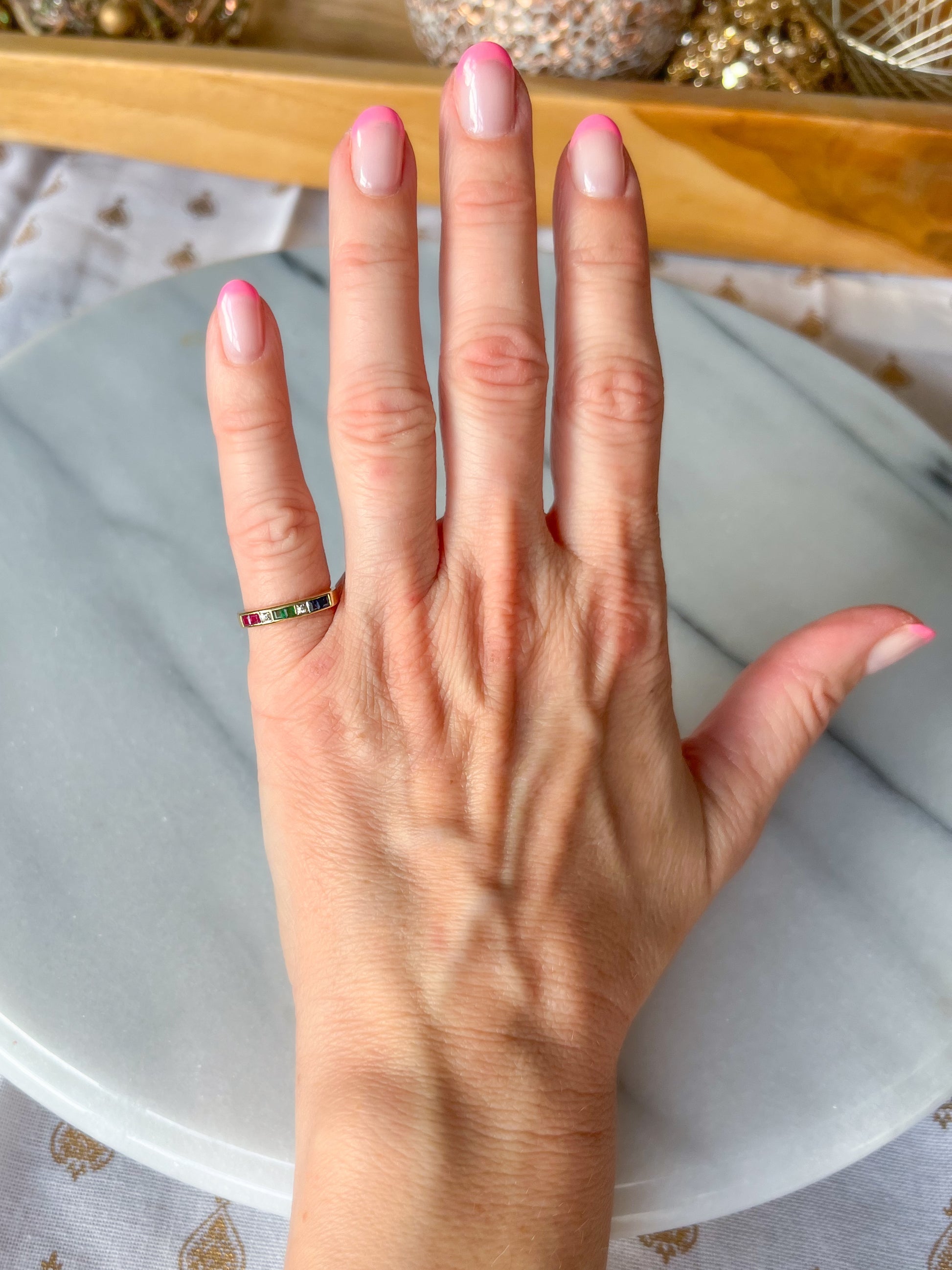 In love with this 14k yellow gold and natural diamonds, rubies, sapphires and emeralds band. This ring can be resized at your local jeweler.