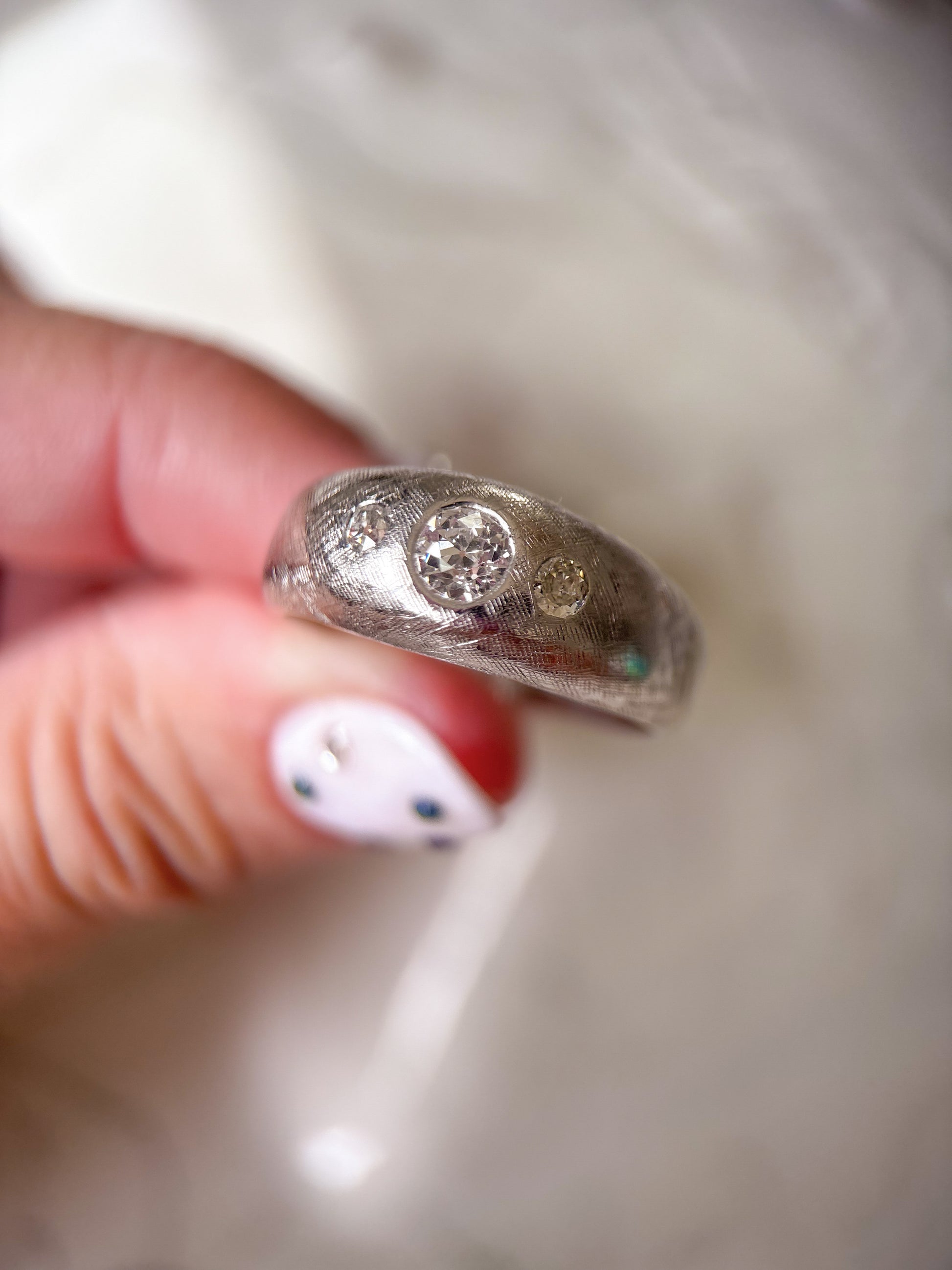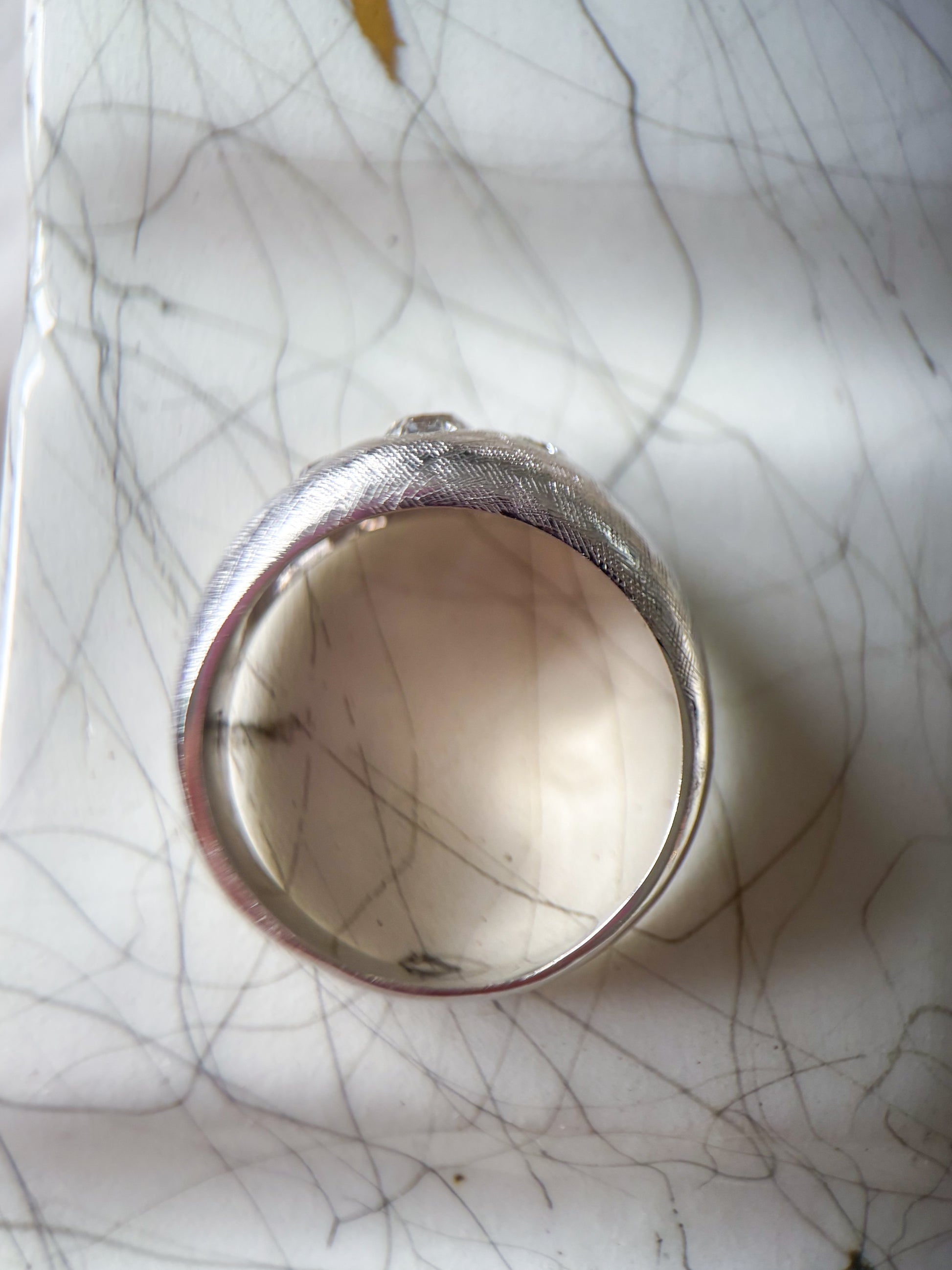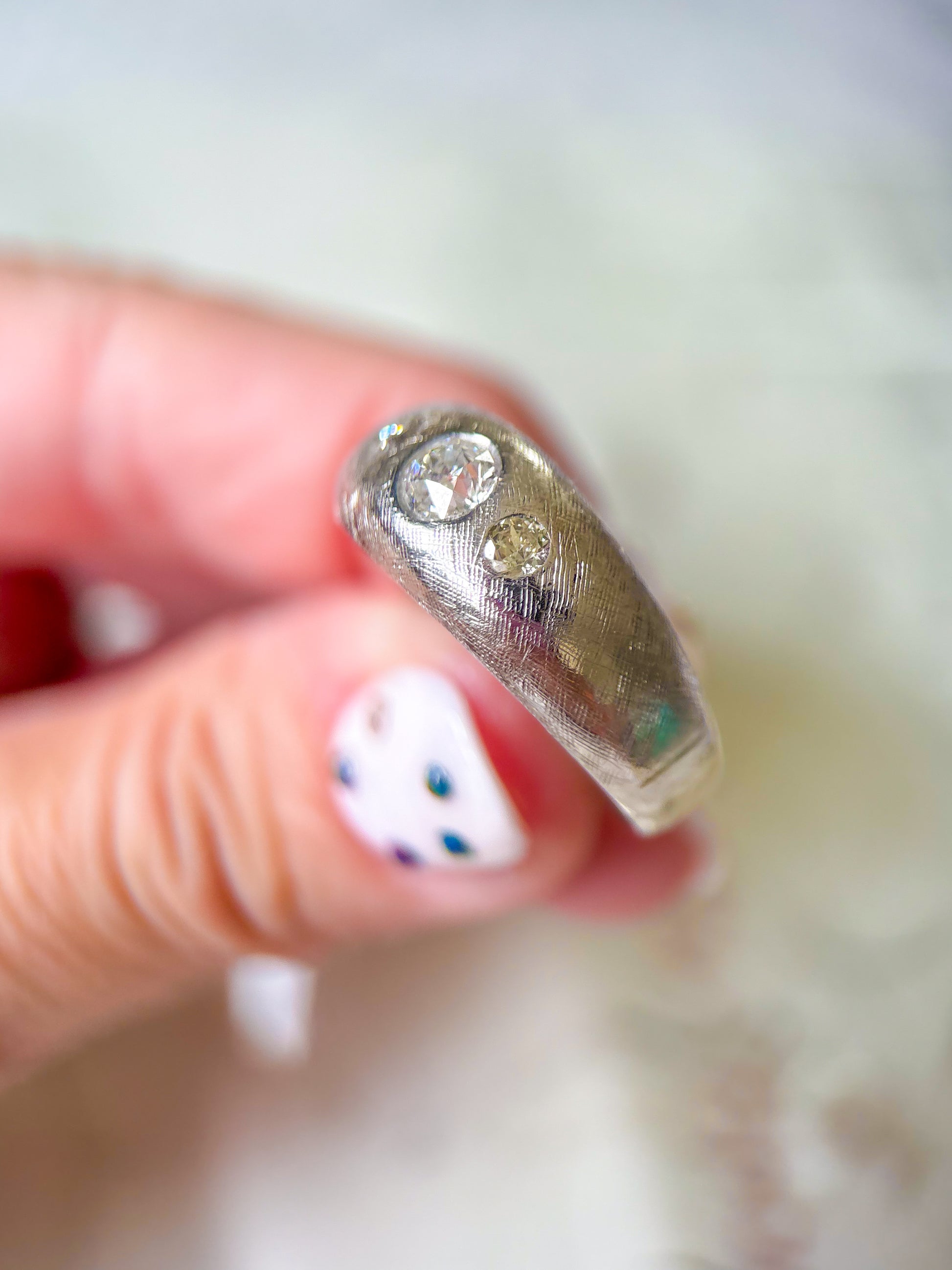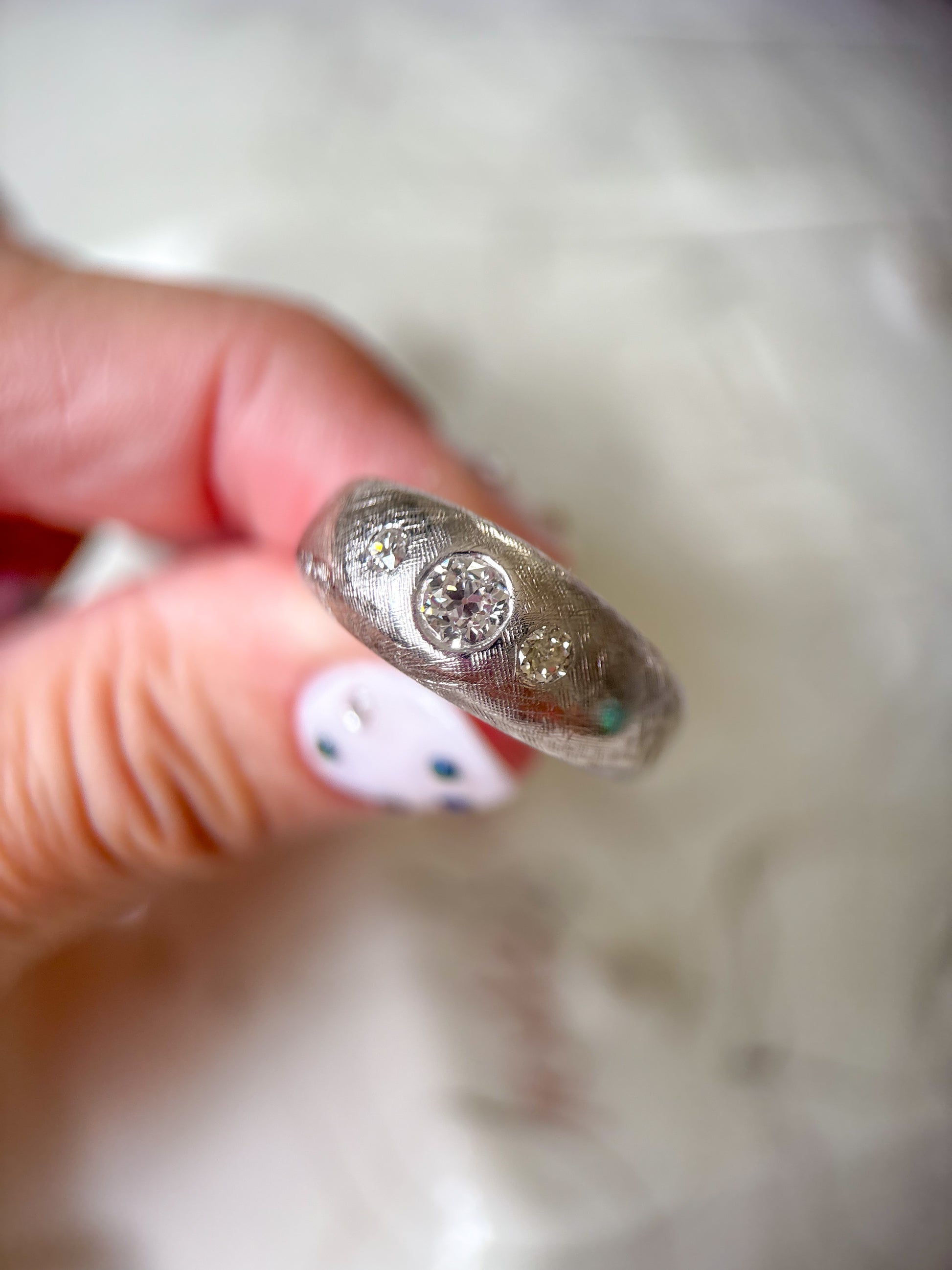 I LOVE this ring!!! Absolutely stunning, vintage, 14k white gold etched 3 diamond mens ring. Just beautiful! Ring is a size 10 3/4 and can be resized at your local jeweler.
