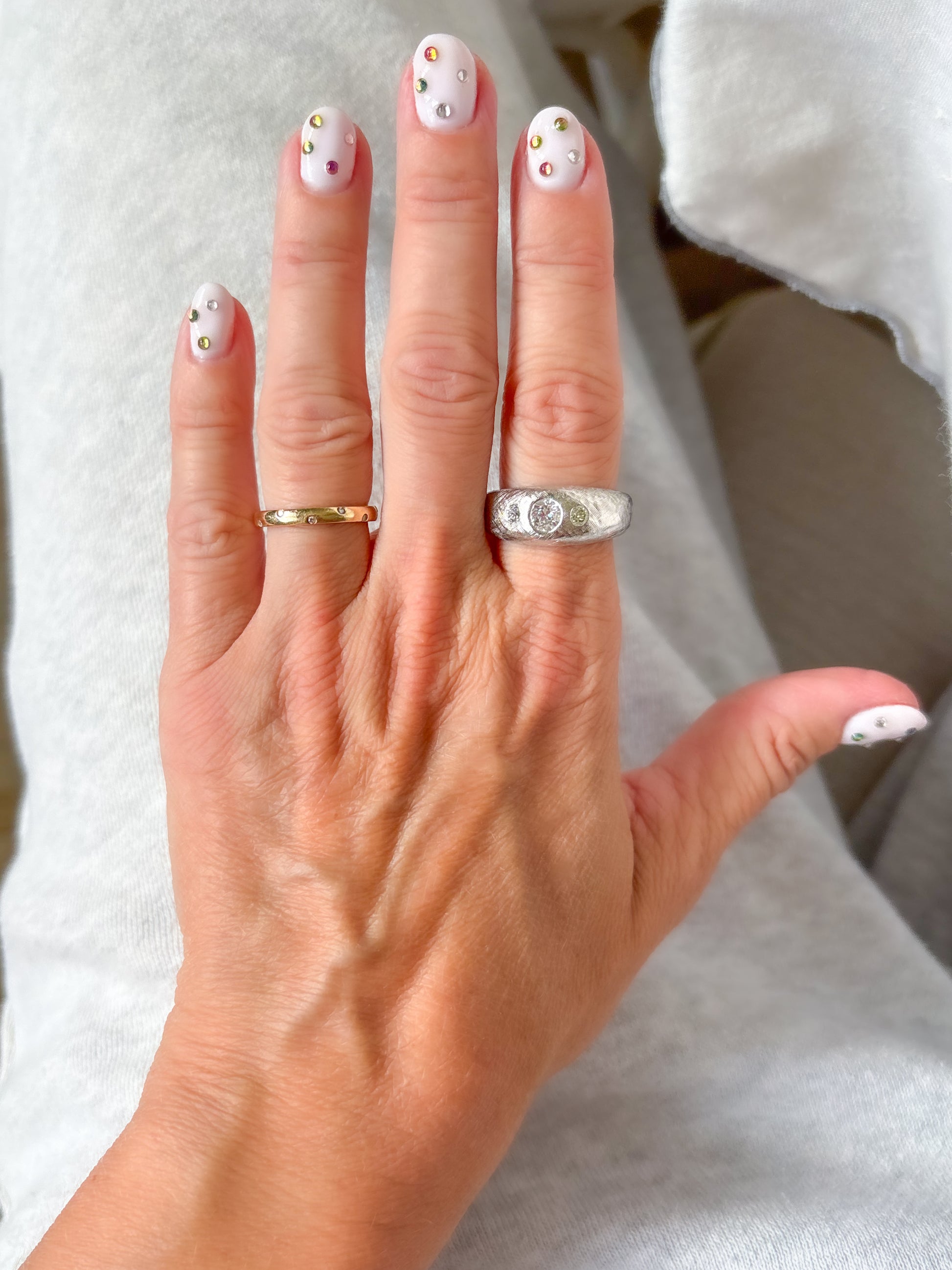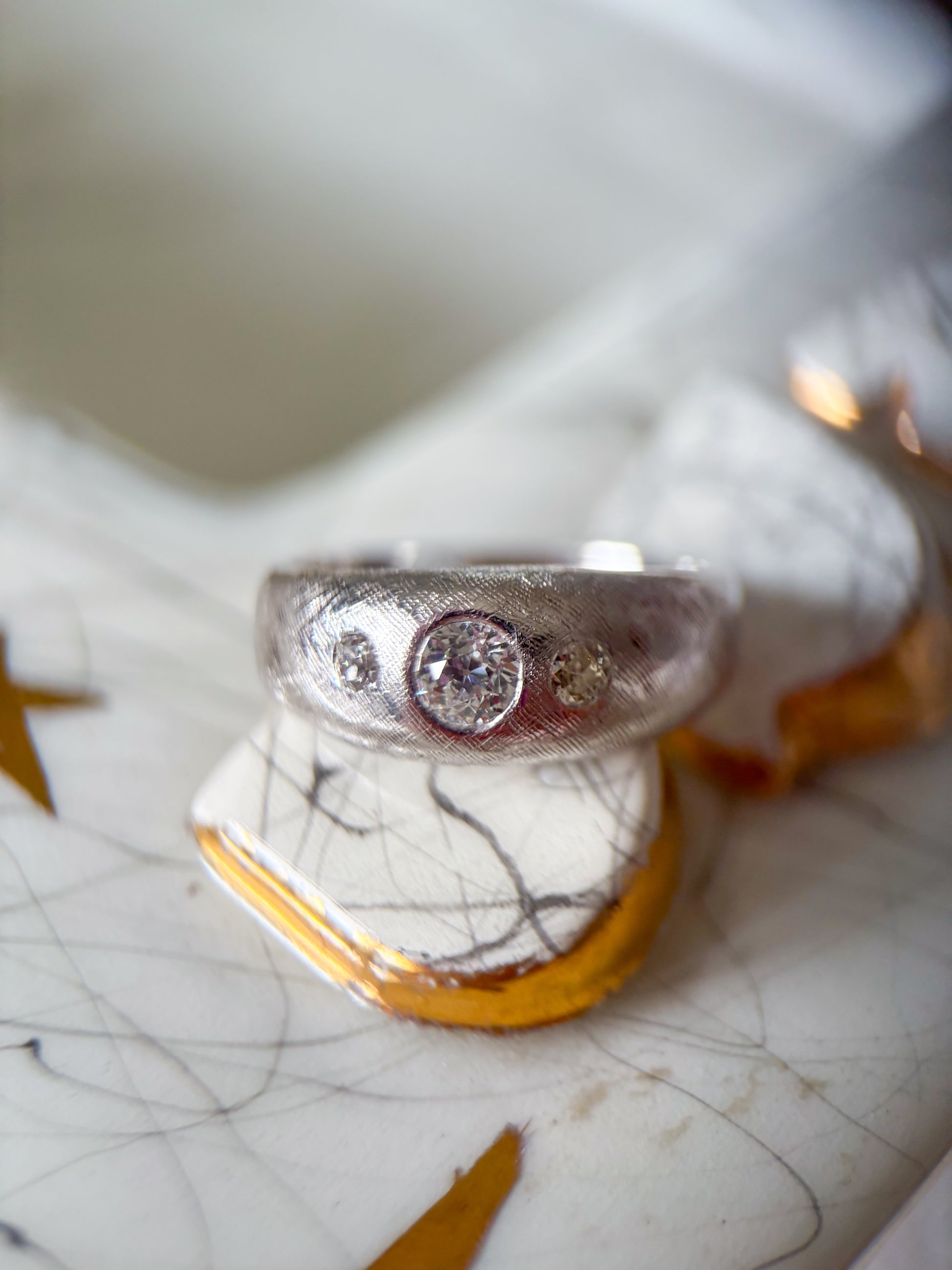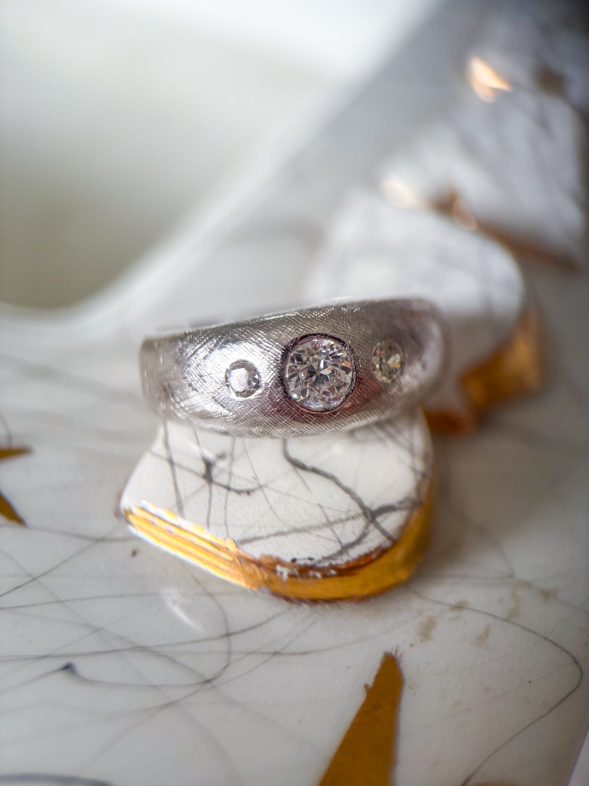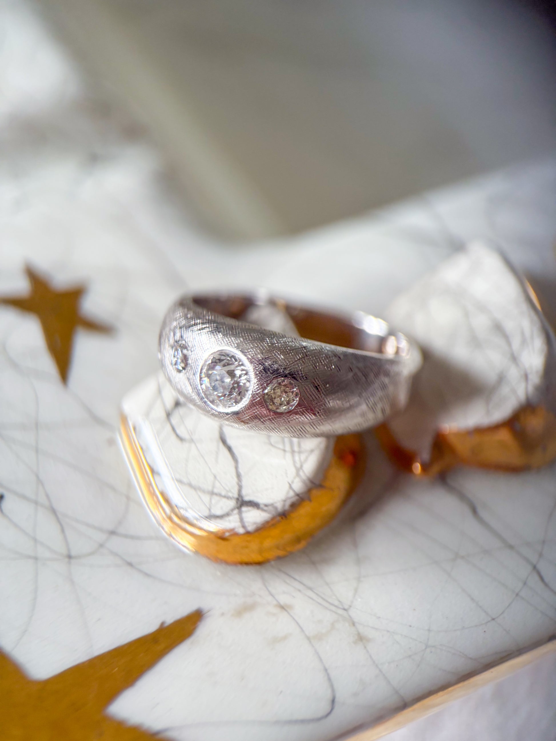 I LOVE this ring!!! Absolutely stunning, vintage, 14k white gold etched 3 diamond mens ring. Just beautiful! Ring is a size 10 3/4 and can be resized at your local jeweler.
