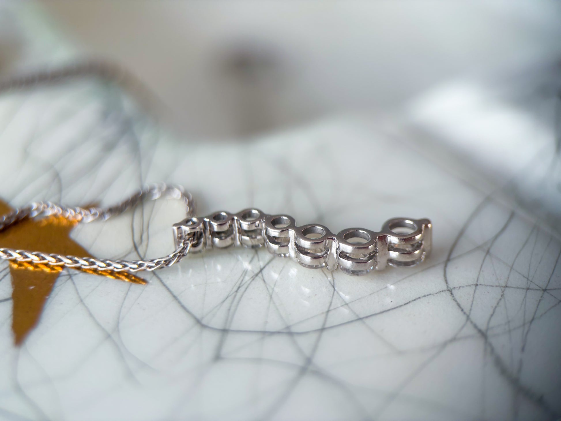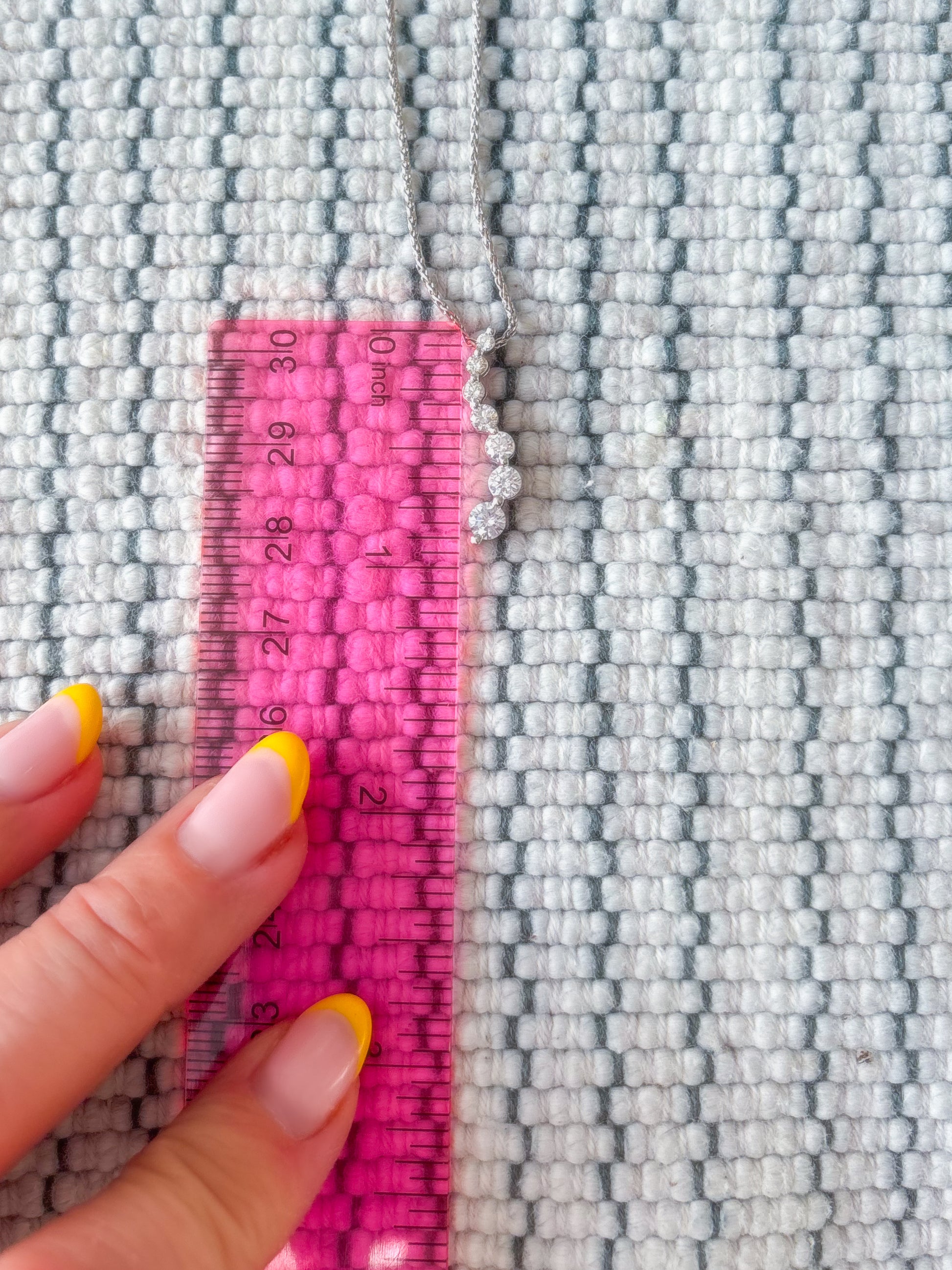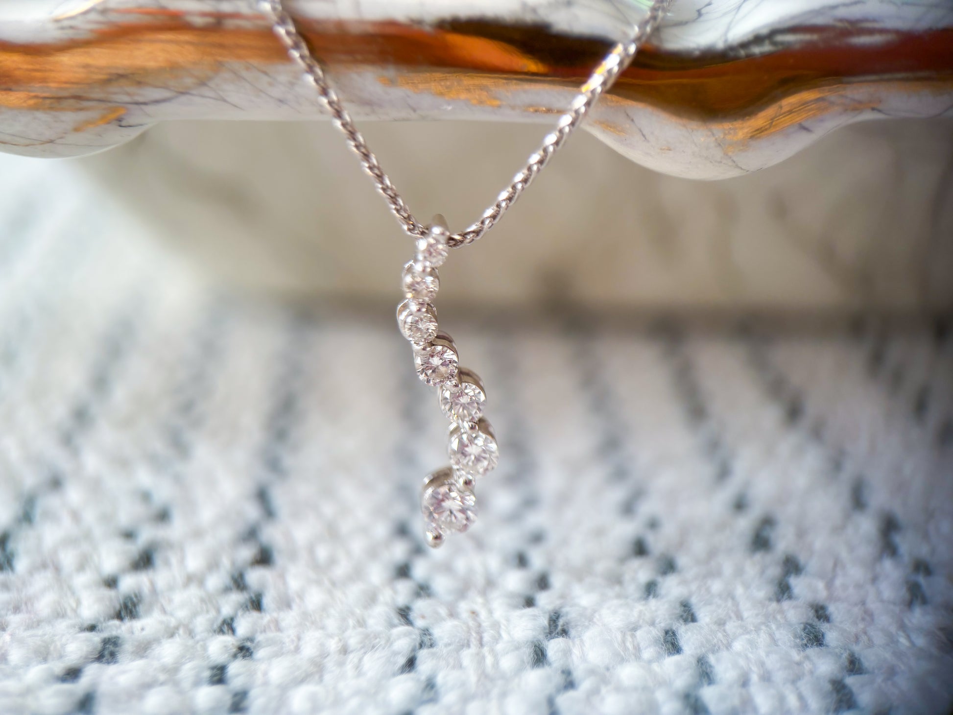 Really stunning, 7 diamond drop pendant featuring natural round diamonds. Pendant is attached to a 14k white gold chain. Total piece weighs over 4 grams and total diamonds is 0.58 cttw. Really beautiful piece!