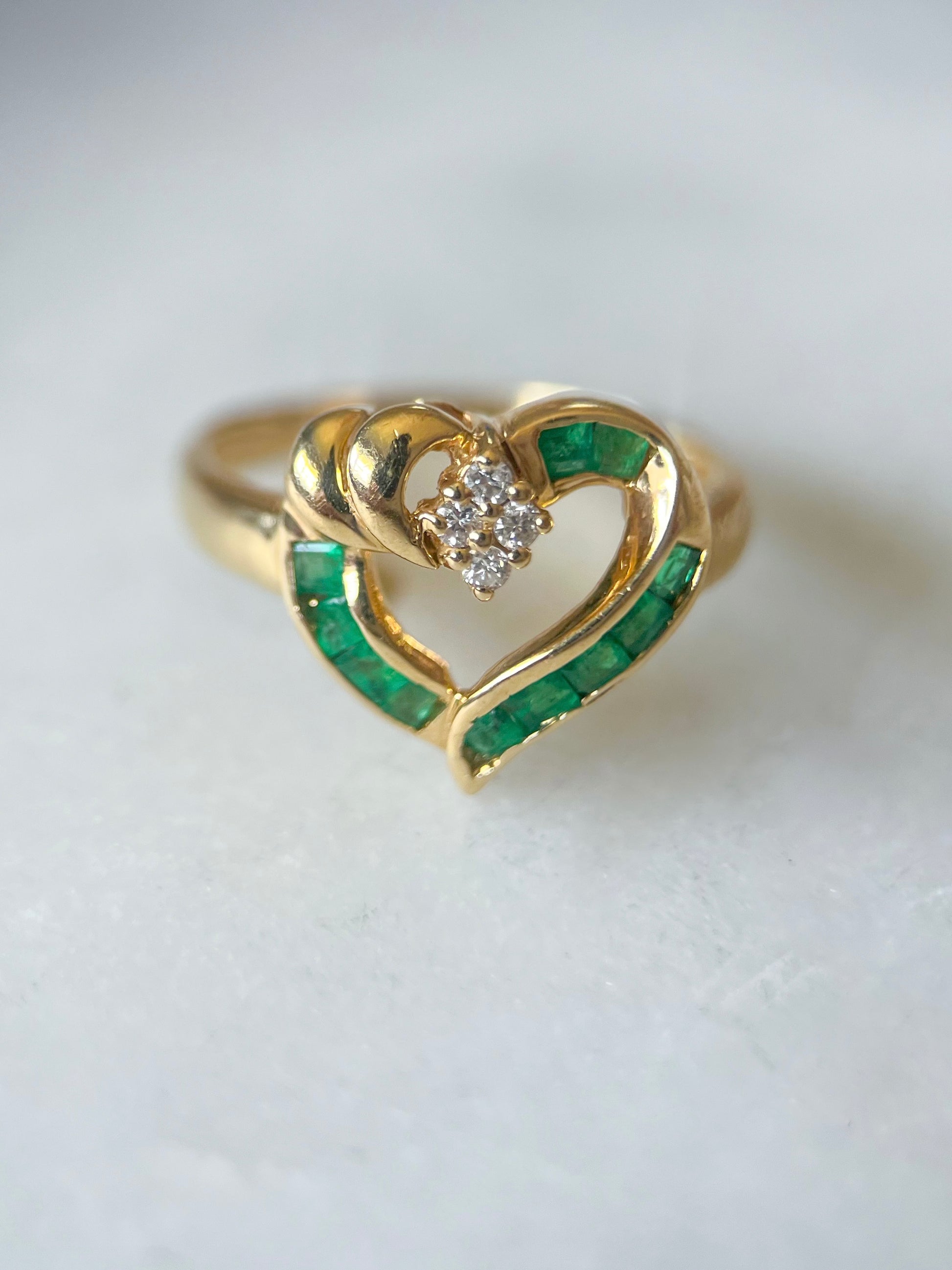 Square cut emeralds and four round diamonds shaped into a heart with a tapered shank in 14k yellow gold. This ring is a size 4 1/2 and can be resized at your local jeweler.