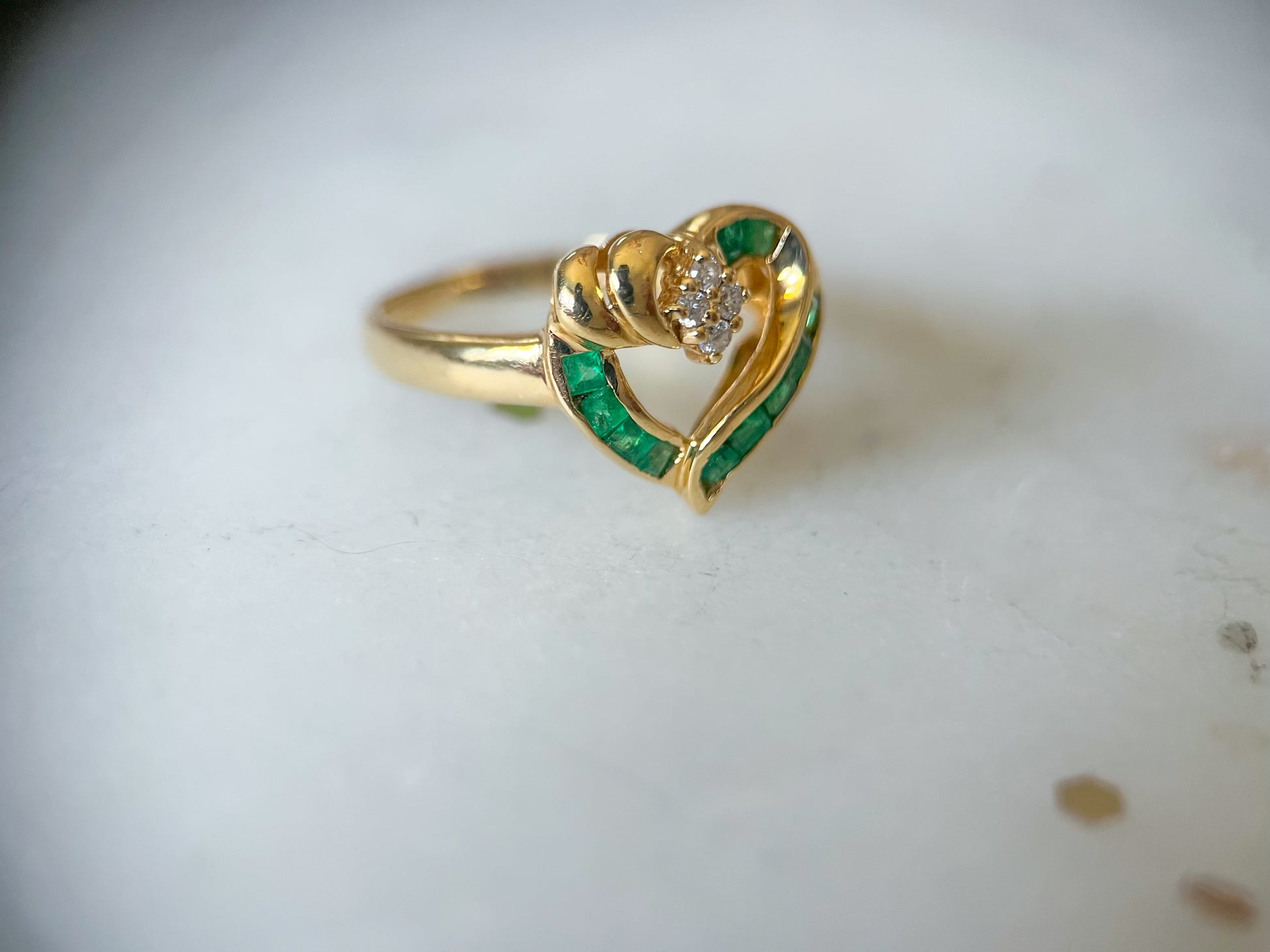 Vintage Natural Emerald and Natural Diamond Heart 14k Yellow Gold Ring