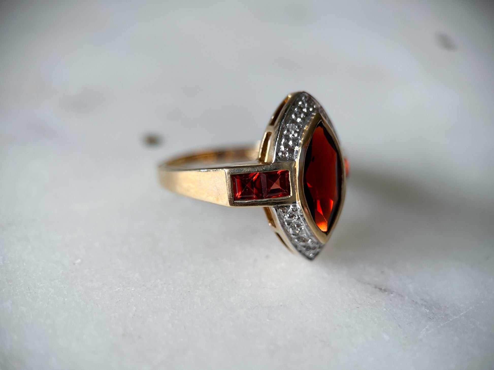 Vintage Natural Marquise Garnet and Diamond 10k Yellow Gold Ring