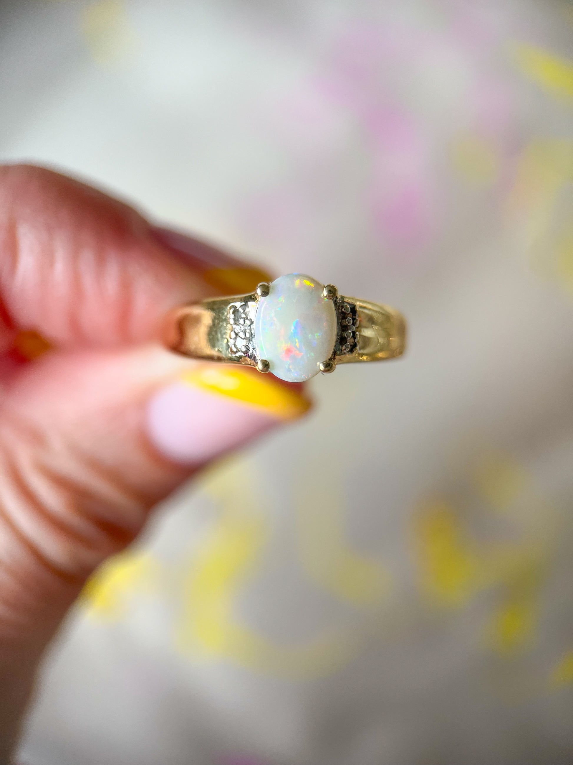 In love with this vintage, 10k yellow gold, natural oval opal and natural diamond ring! It is a size 7 and can be resized at your local jeweler.
