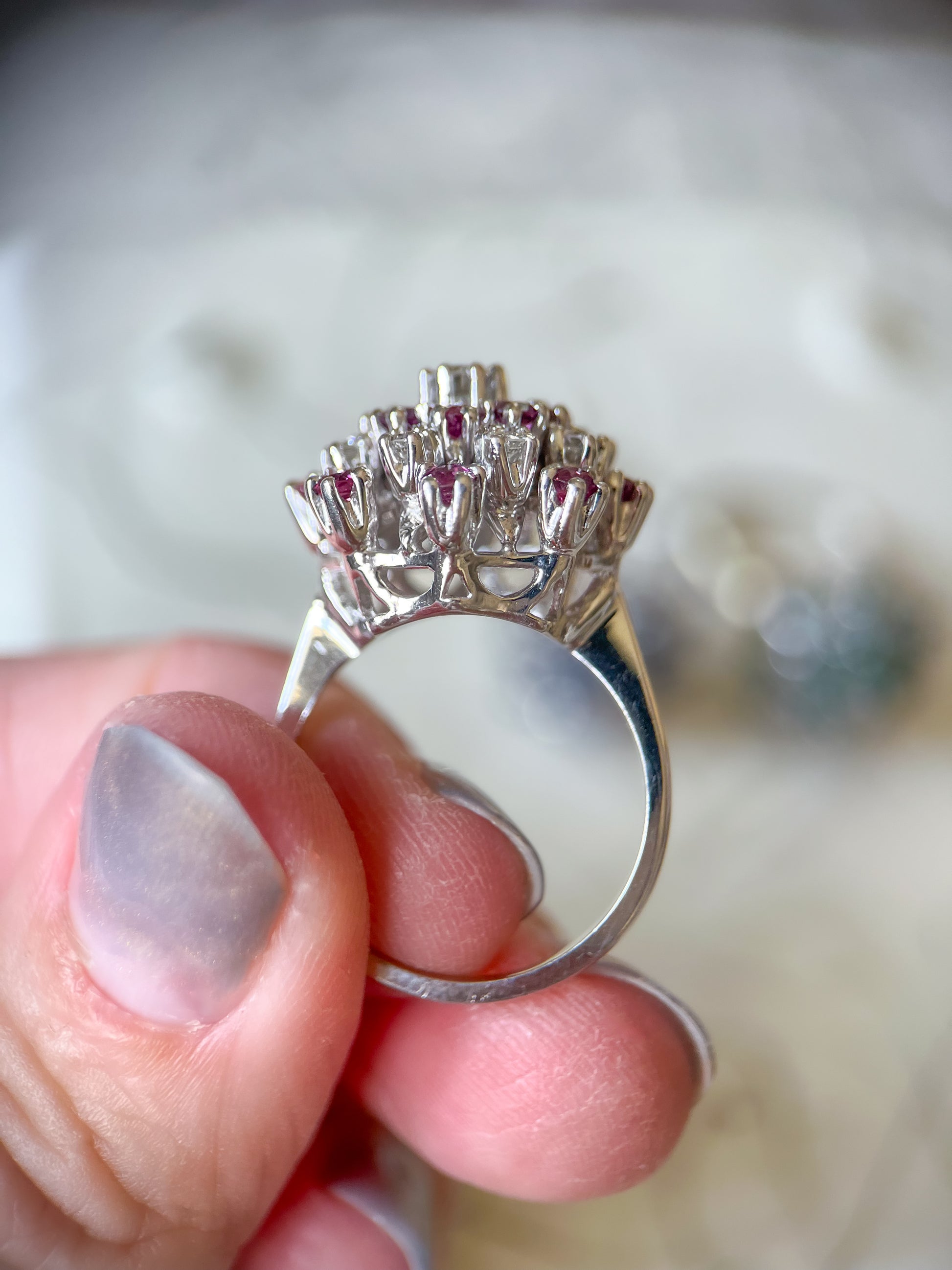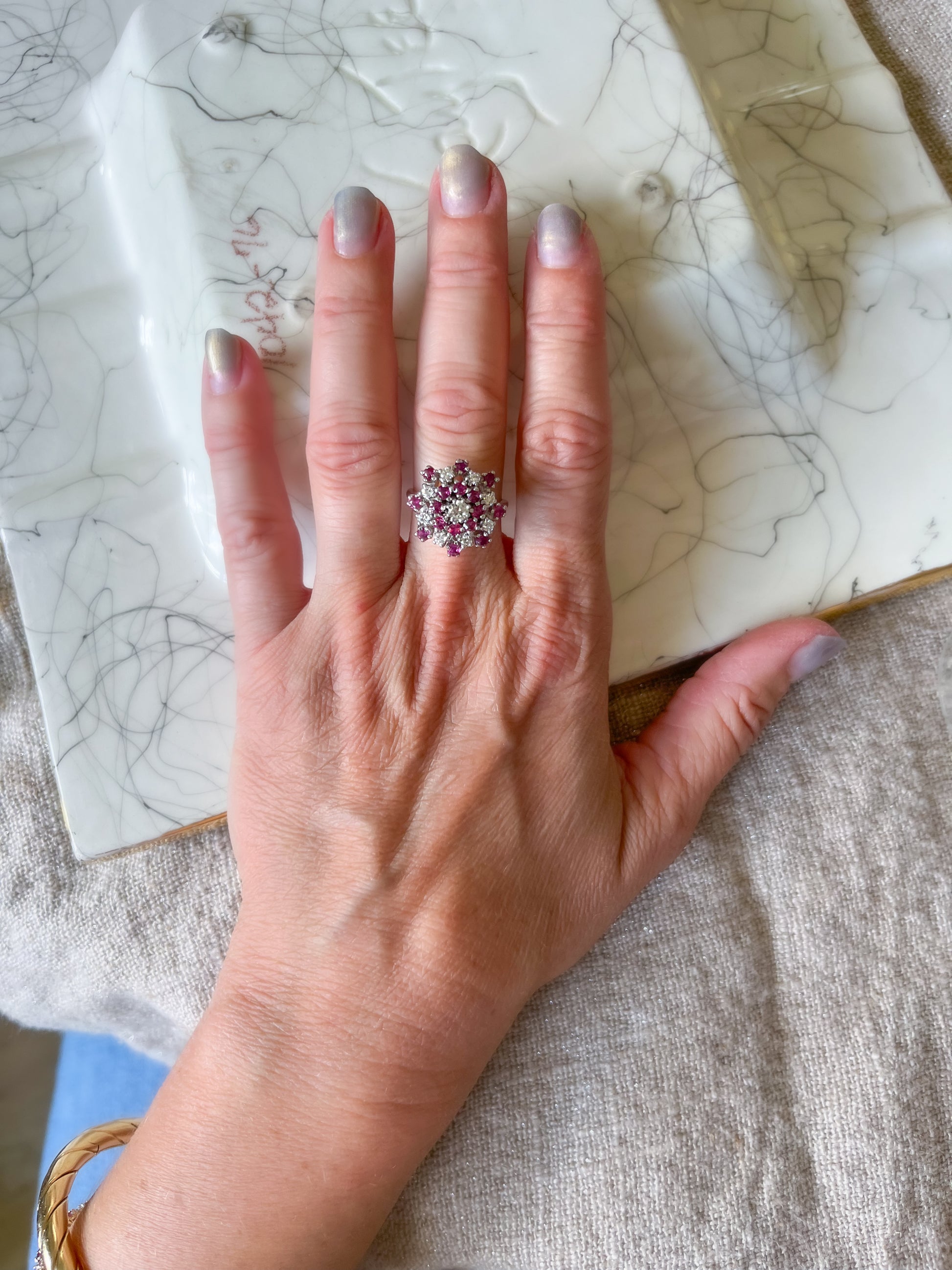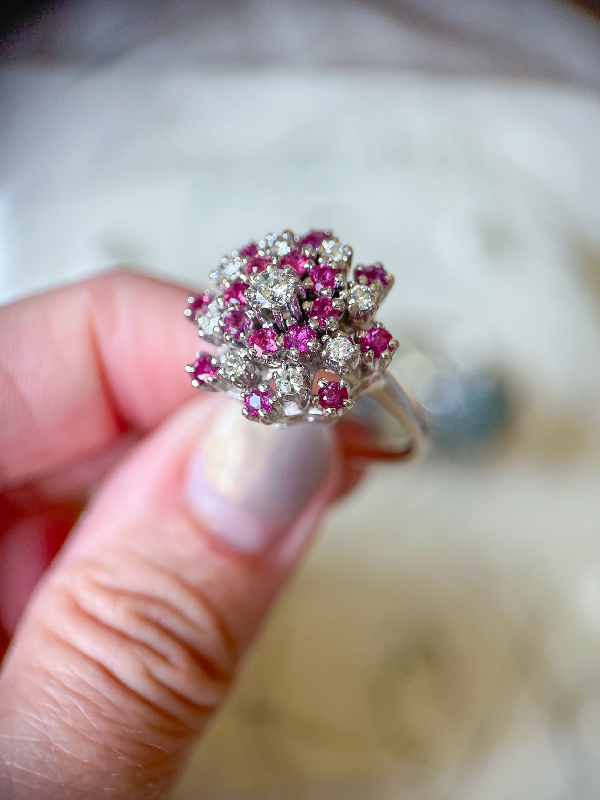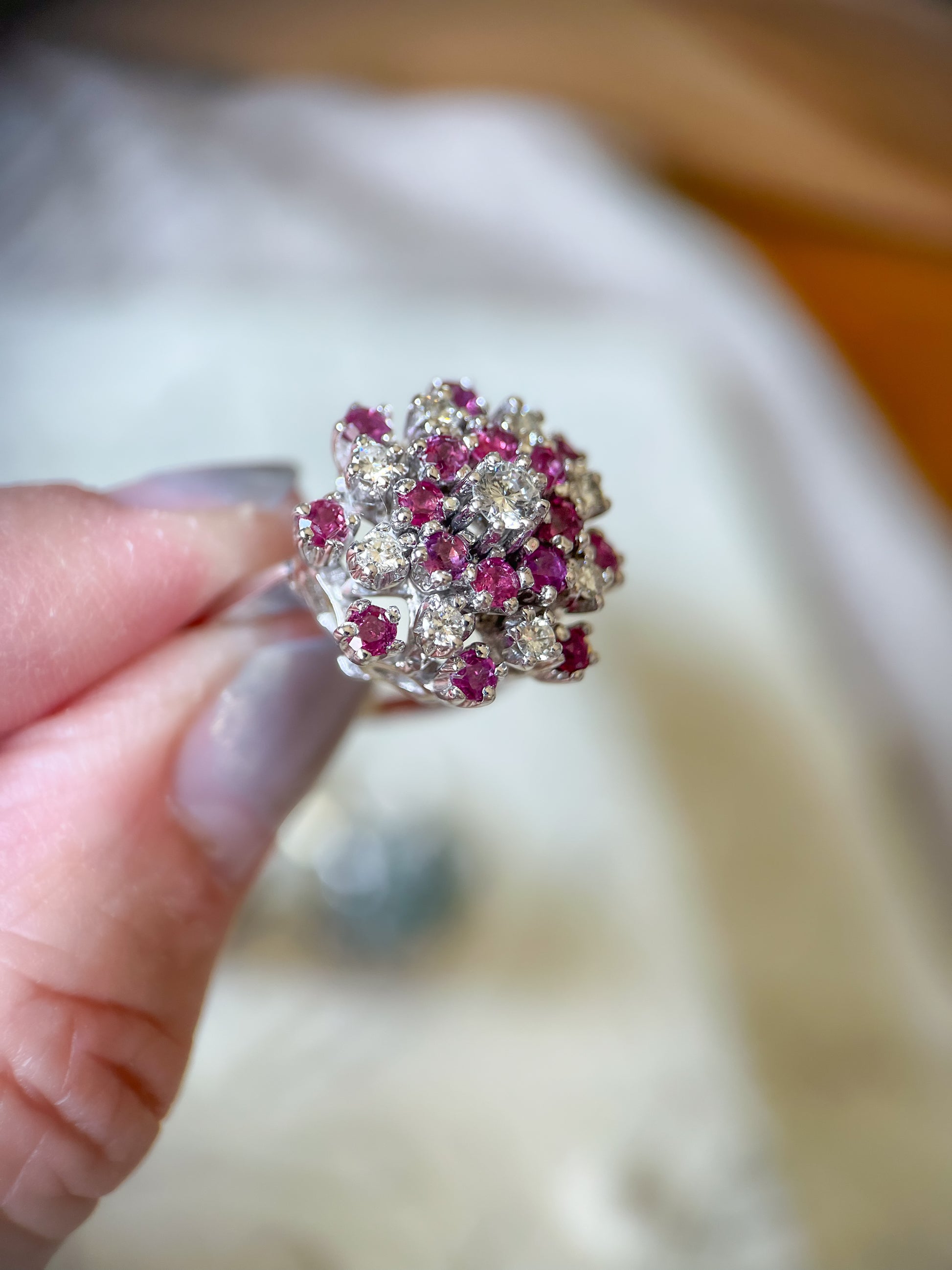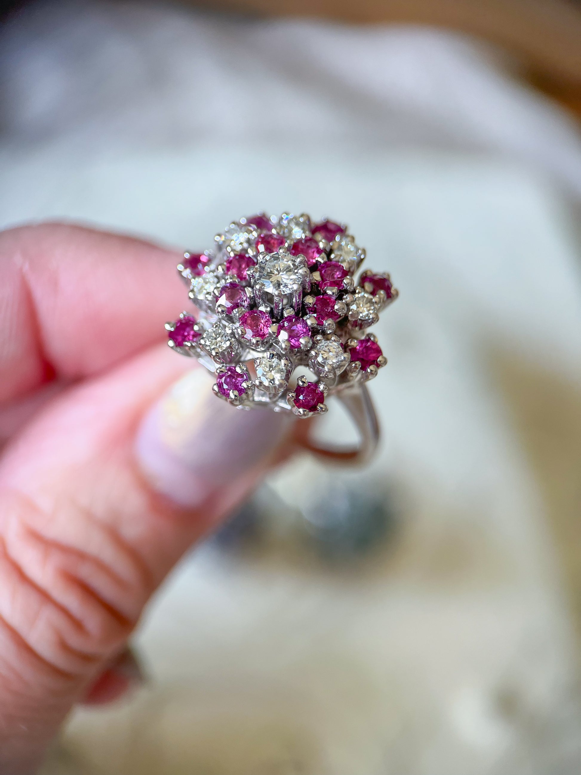 Vintage Natural Ruby and Diamonds 14k White Gold Statement Ring