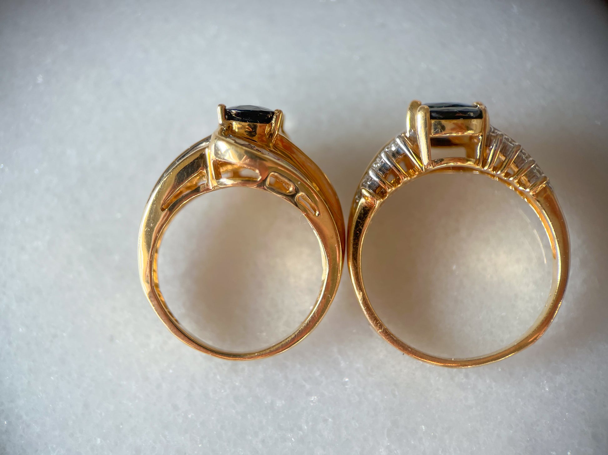 Two awesome, vintage, 14k yellow gold, natural diamond and natural sapphire rings. Can be resized at your local jeweler.