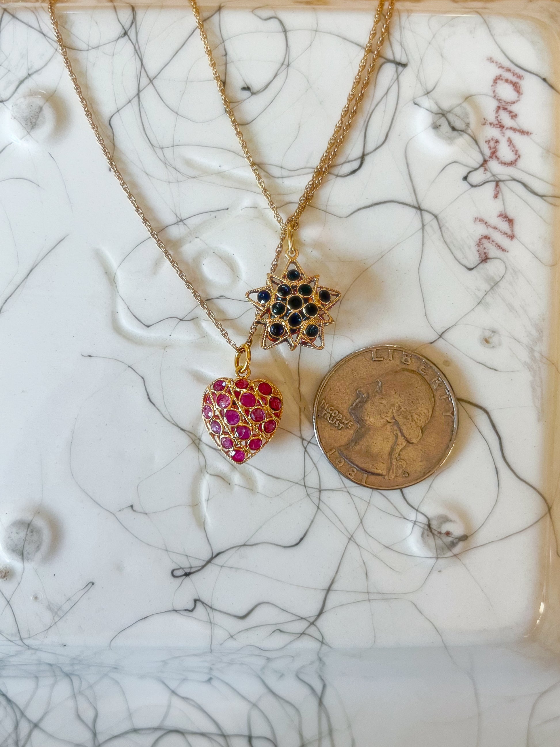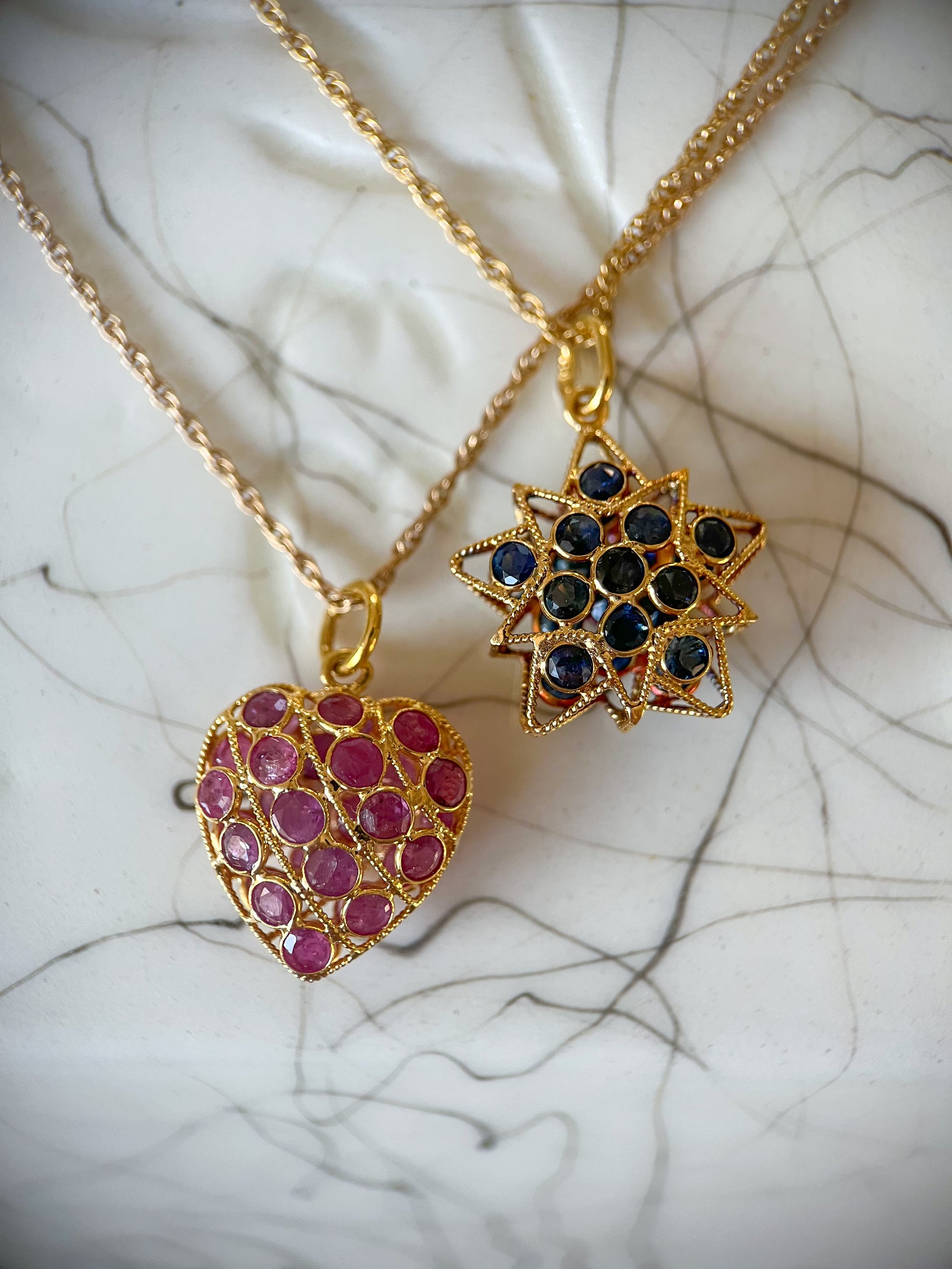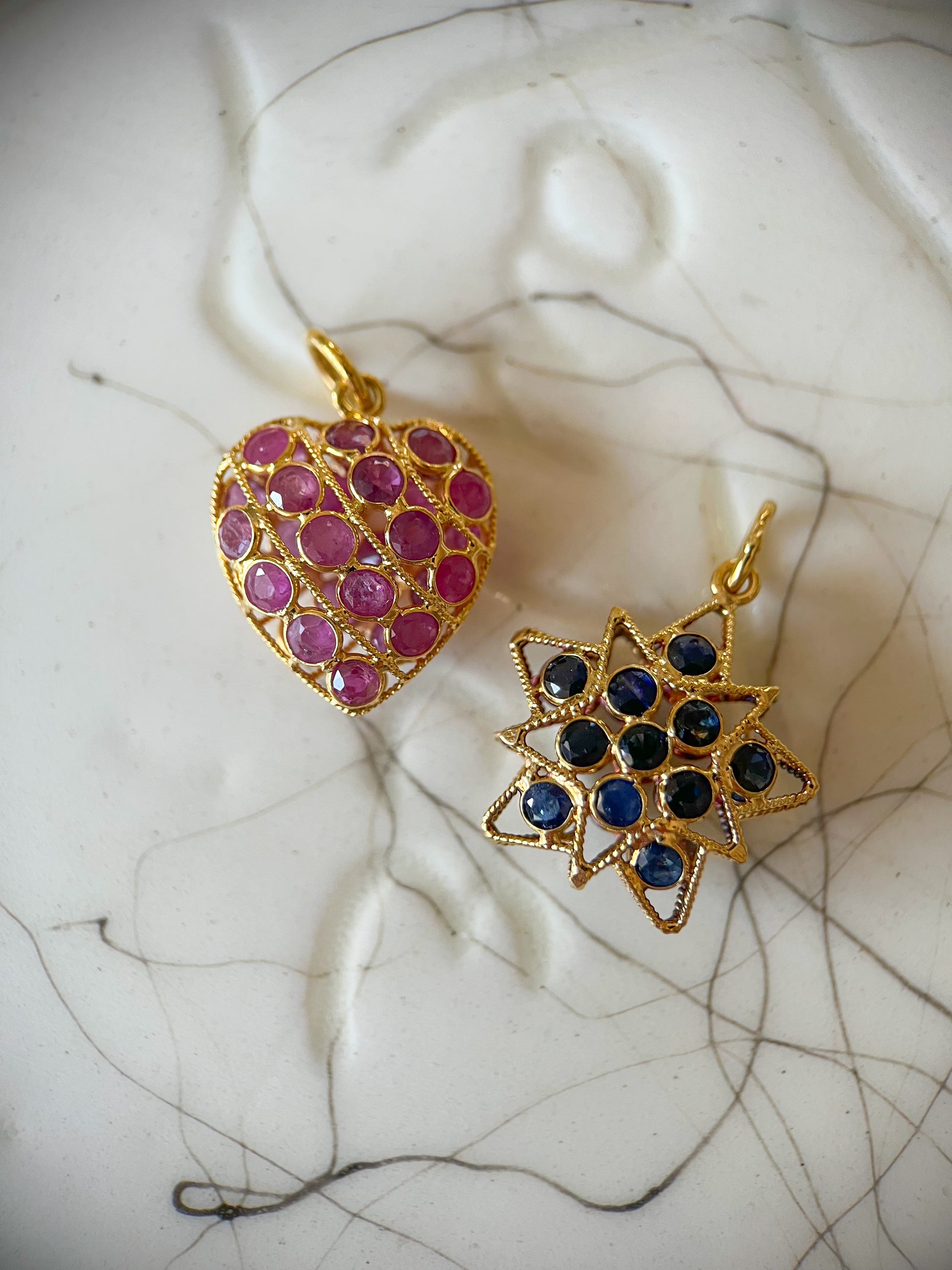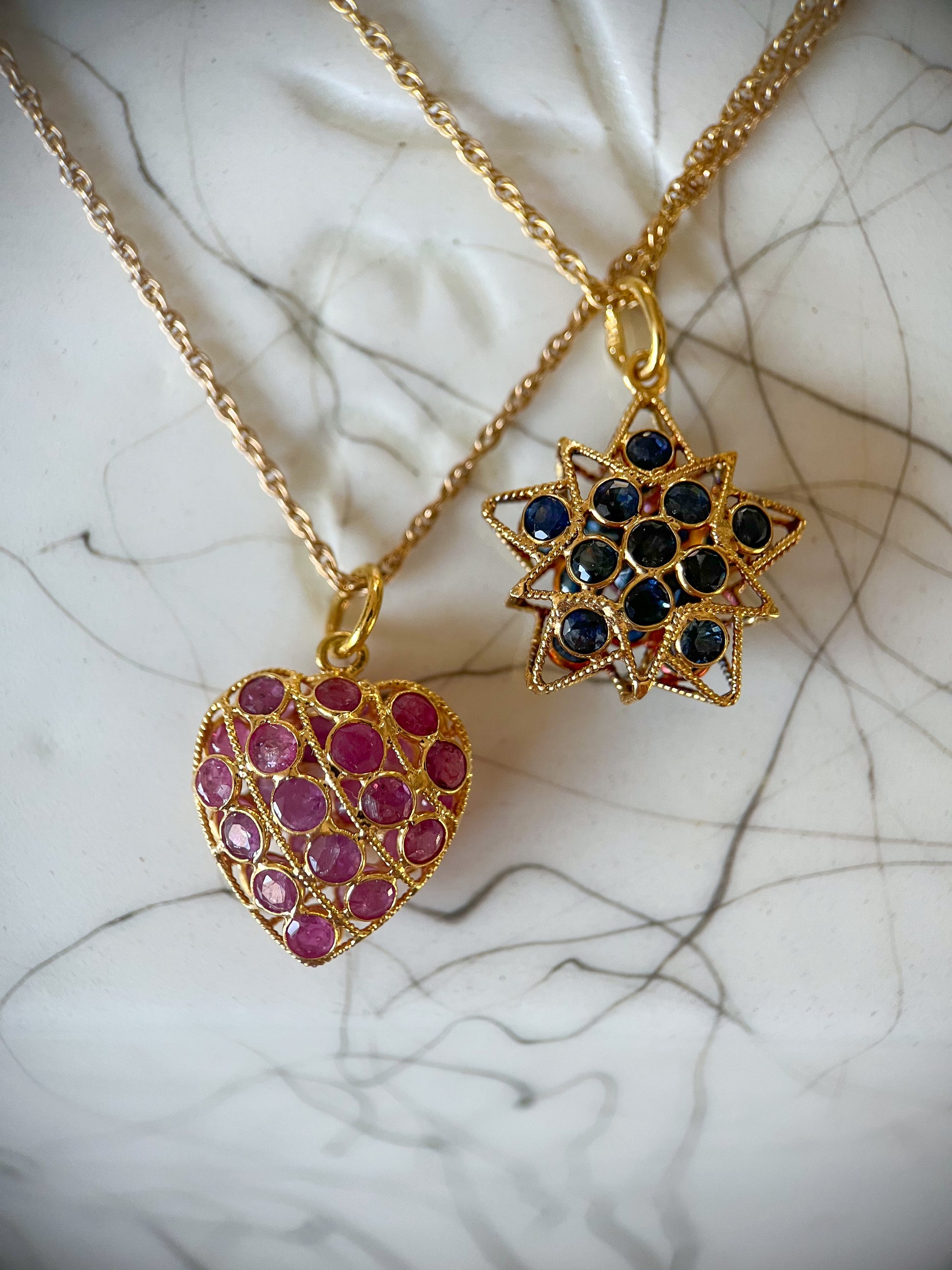 The heart is made of 18k yellow gold and natural round rubies. The star is made of 18k yellow gold and natural round sapphires. Both incredibly stunning! Chains not included.