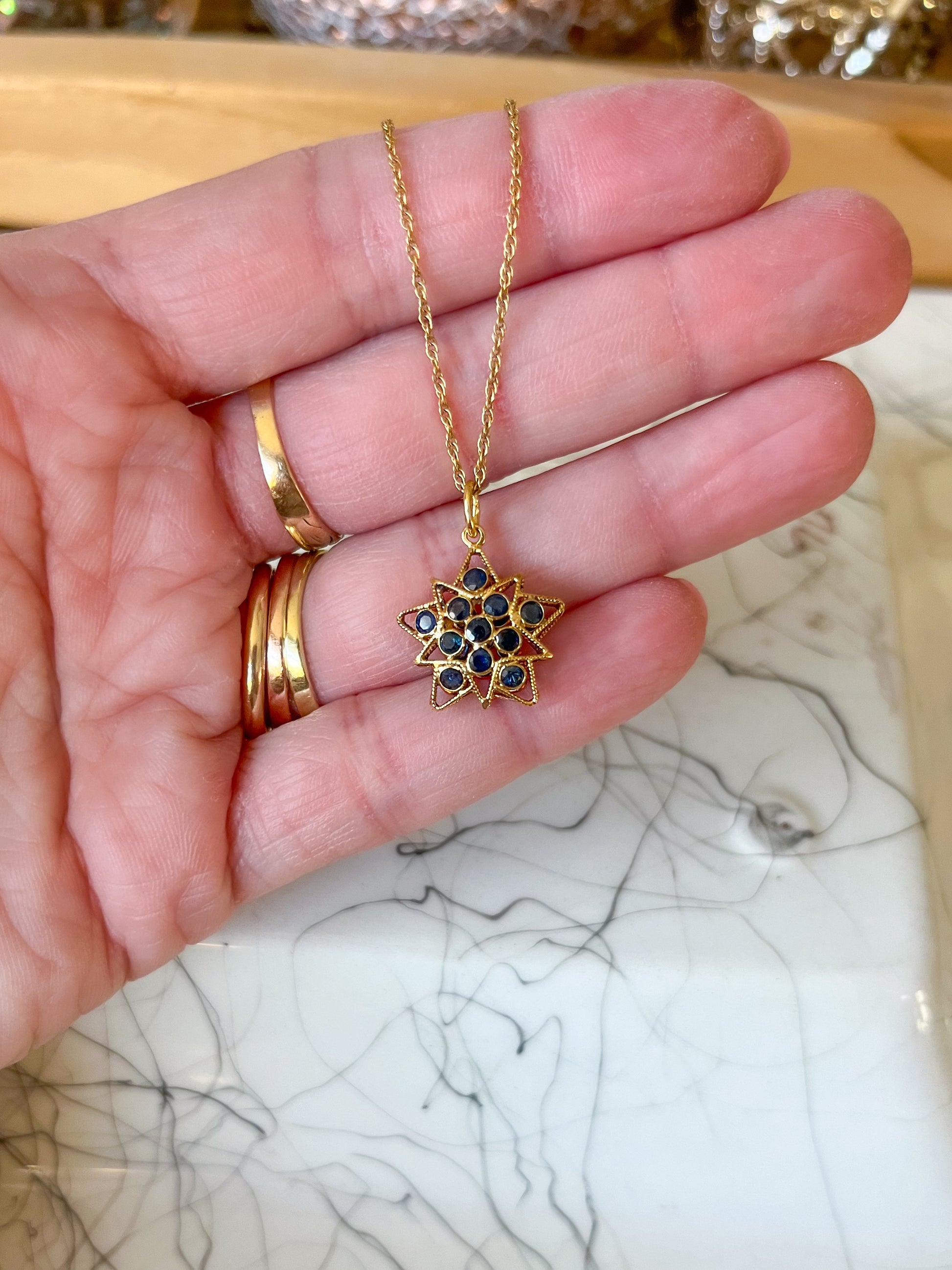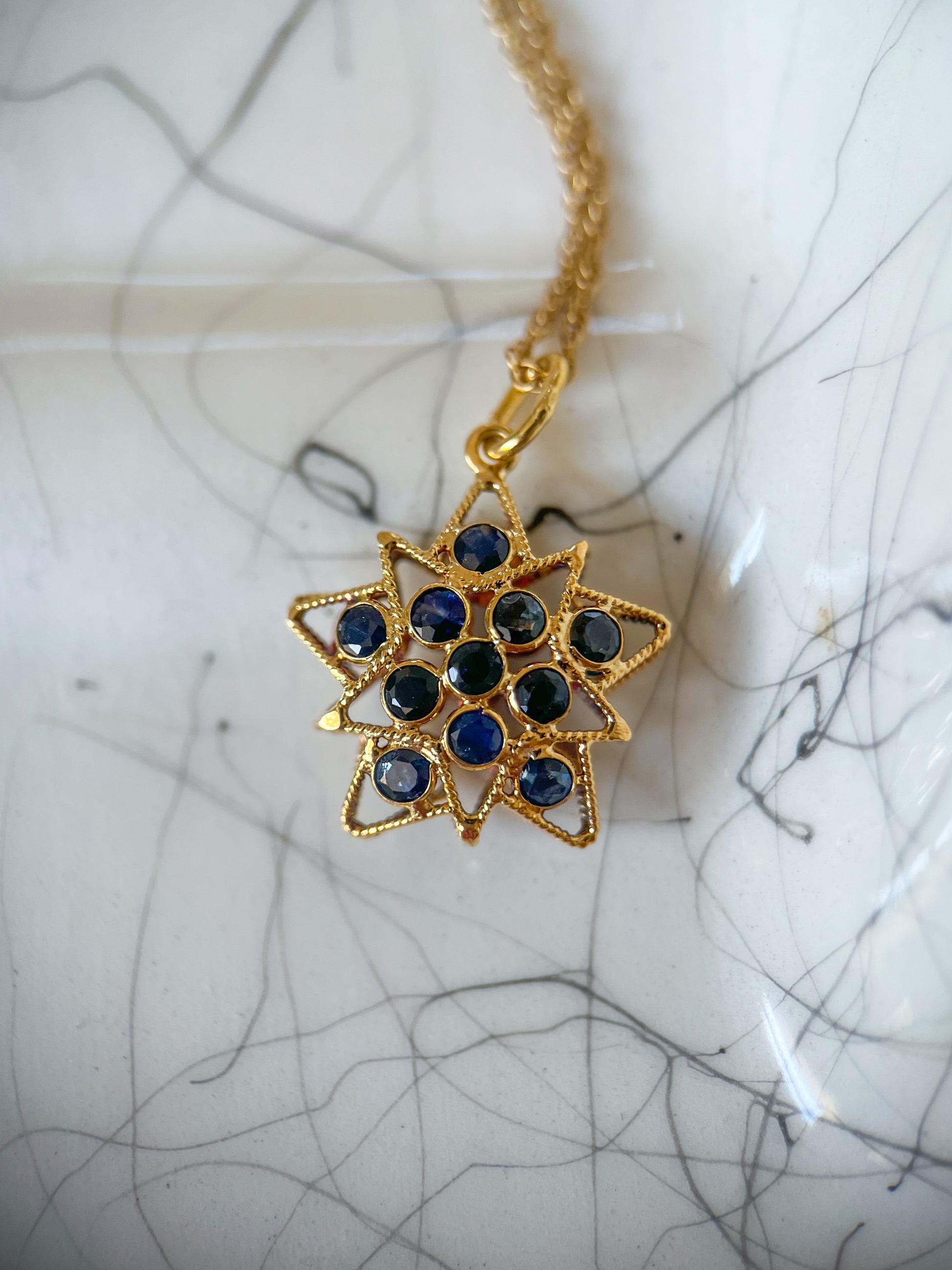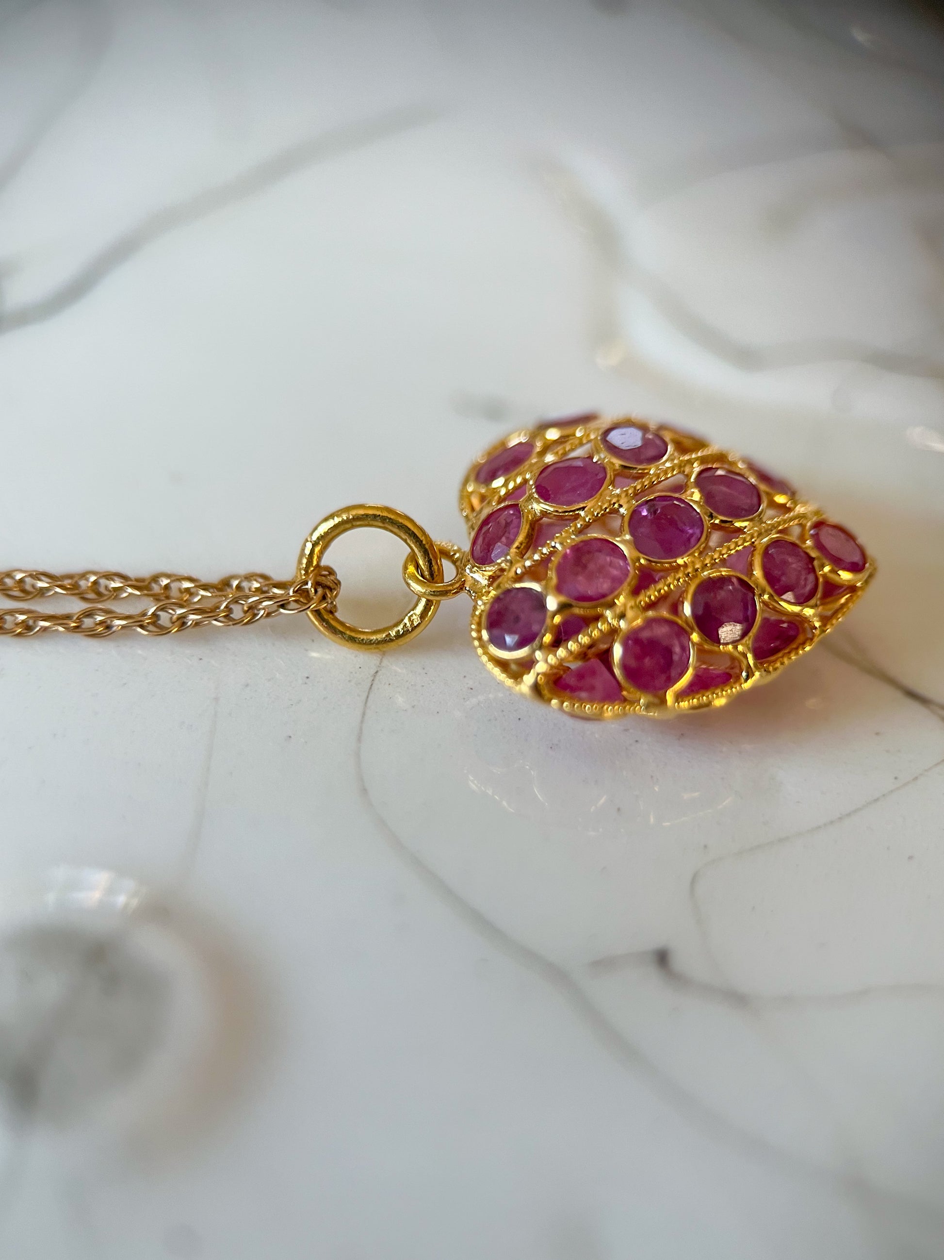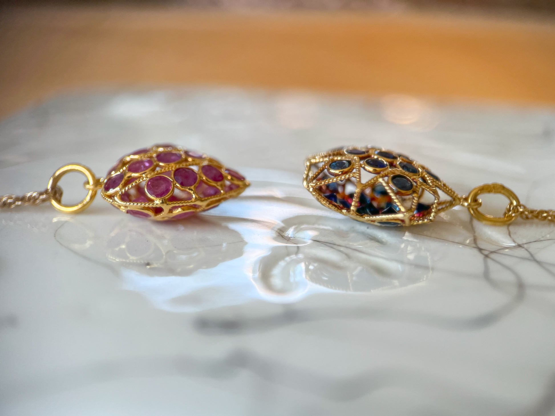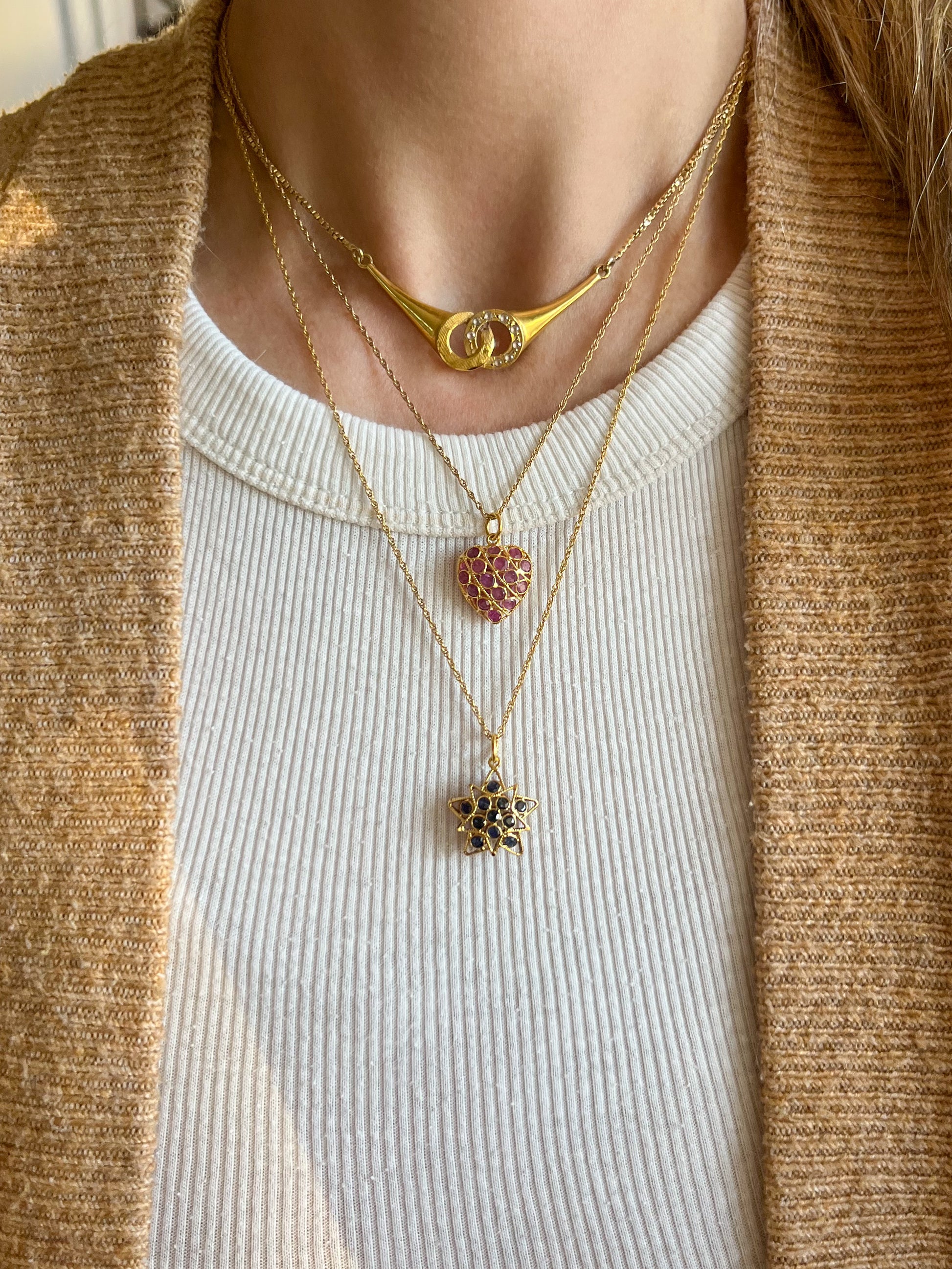 The heart is made of 18k yellow gold and natural round rubies. The star is made of 18k yellow gold and natural round sapphires. Both incredibly stunning! Chains not included.