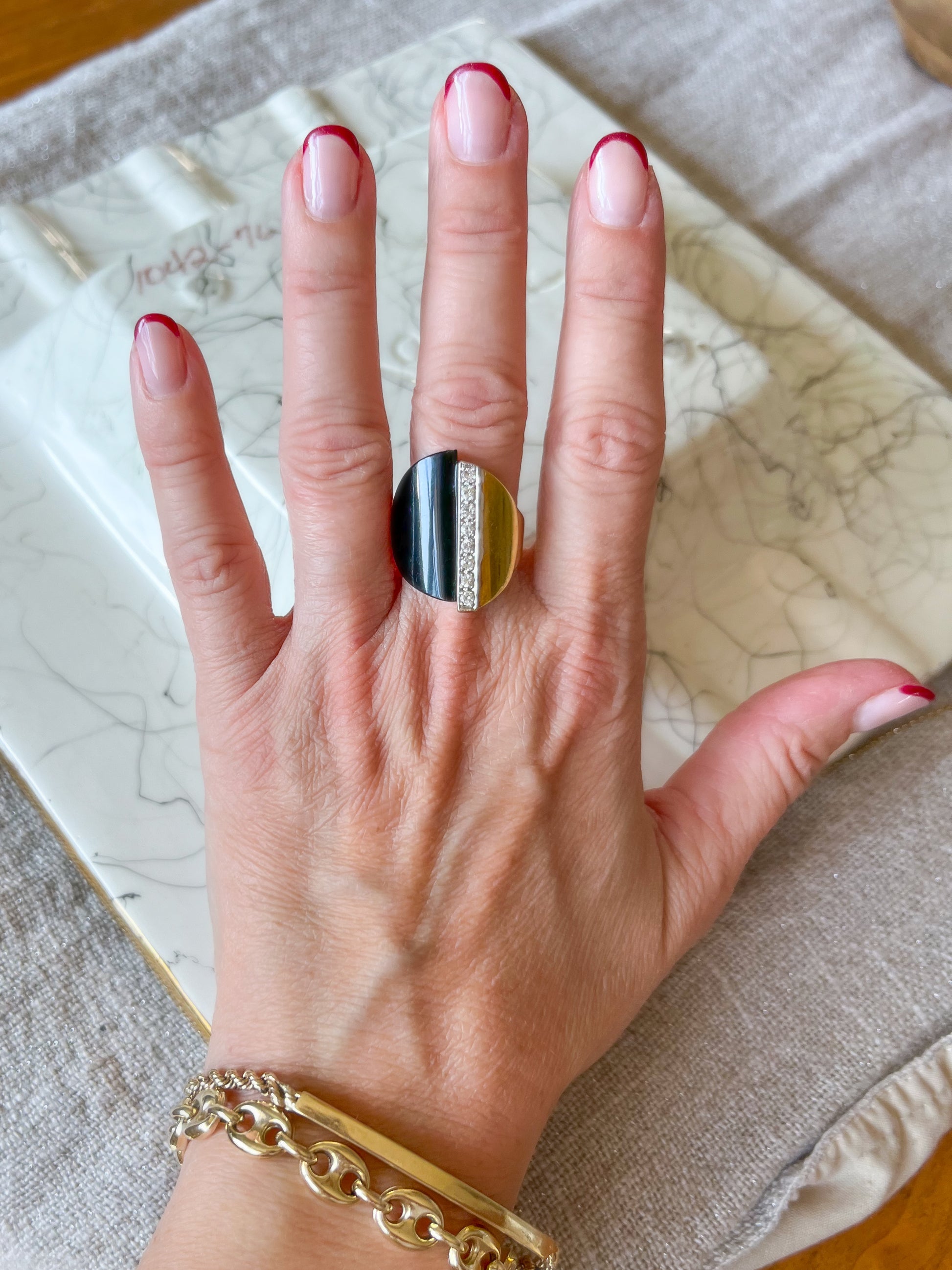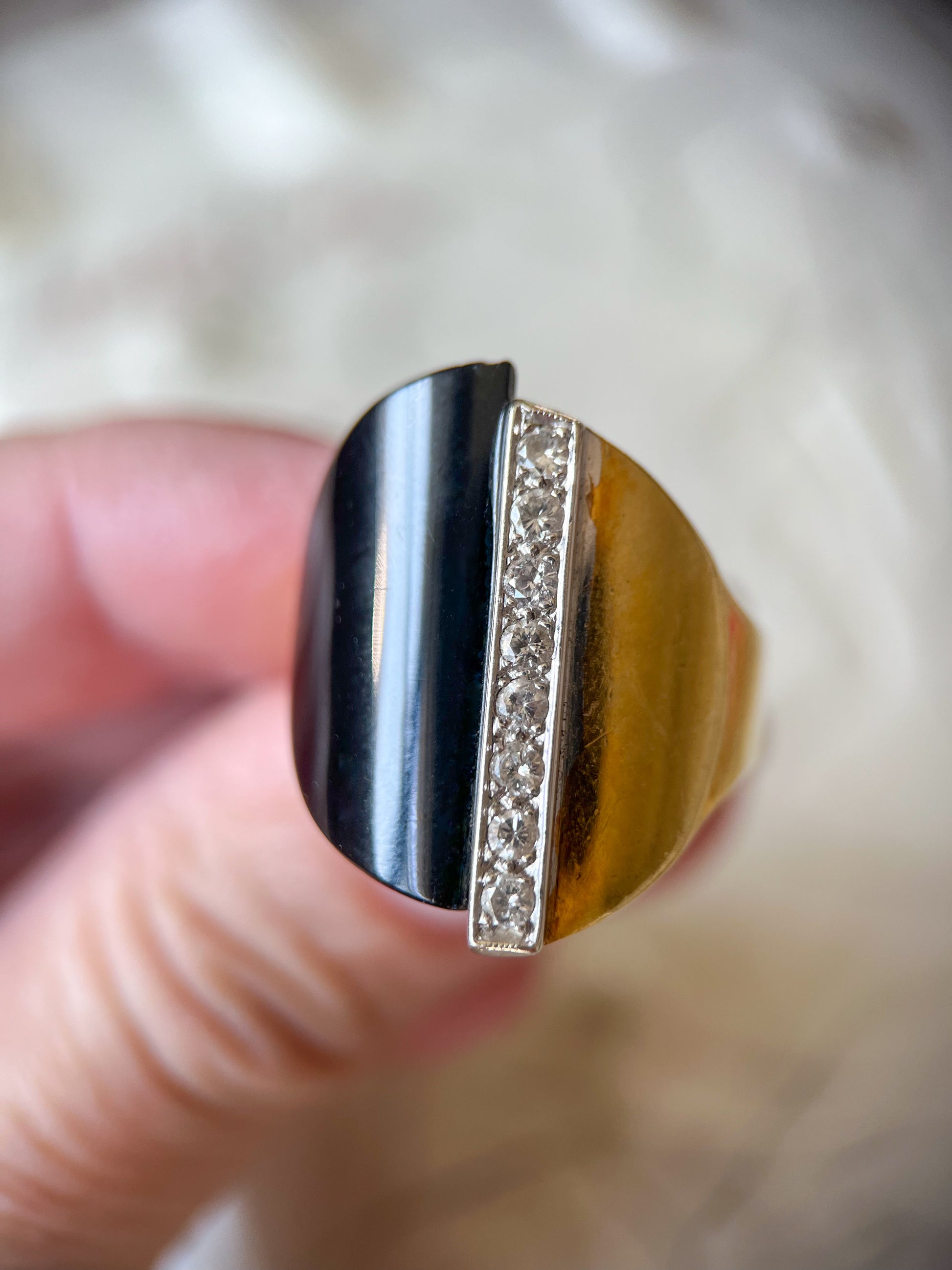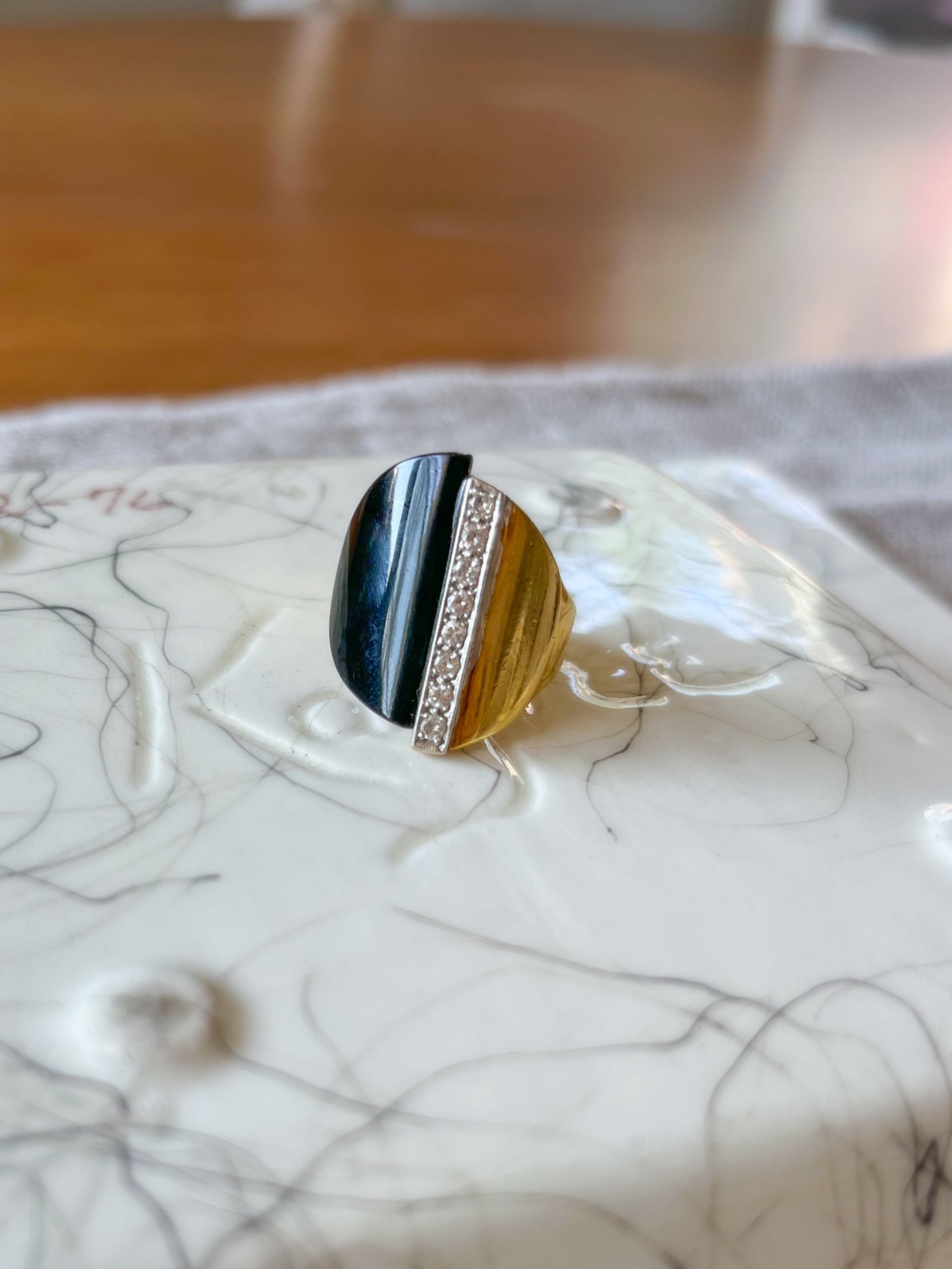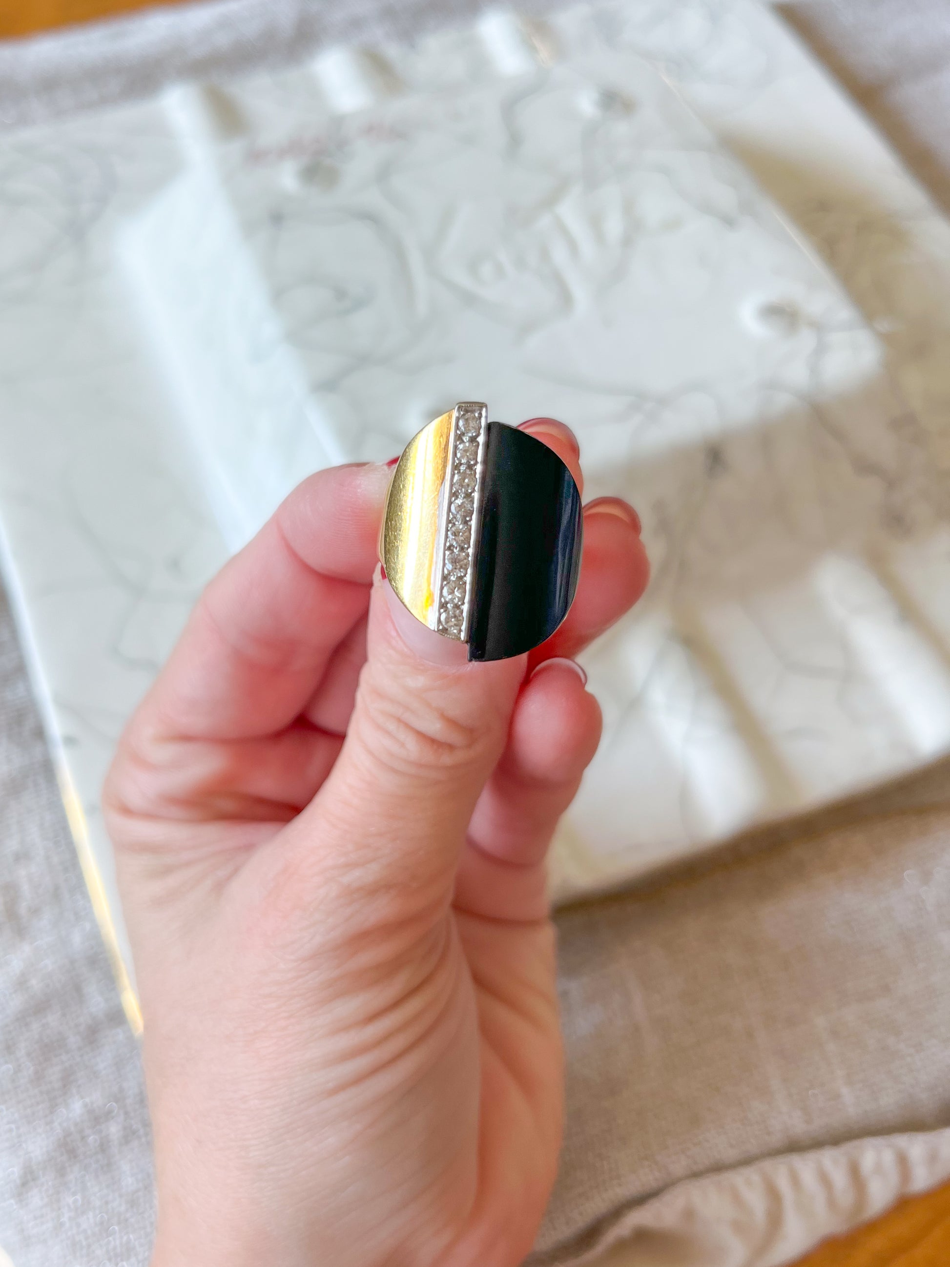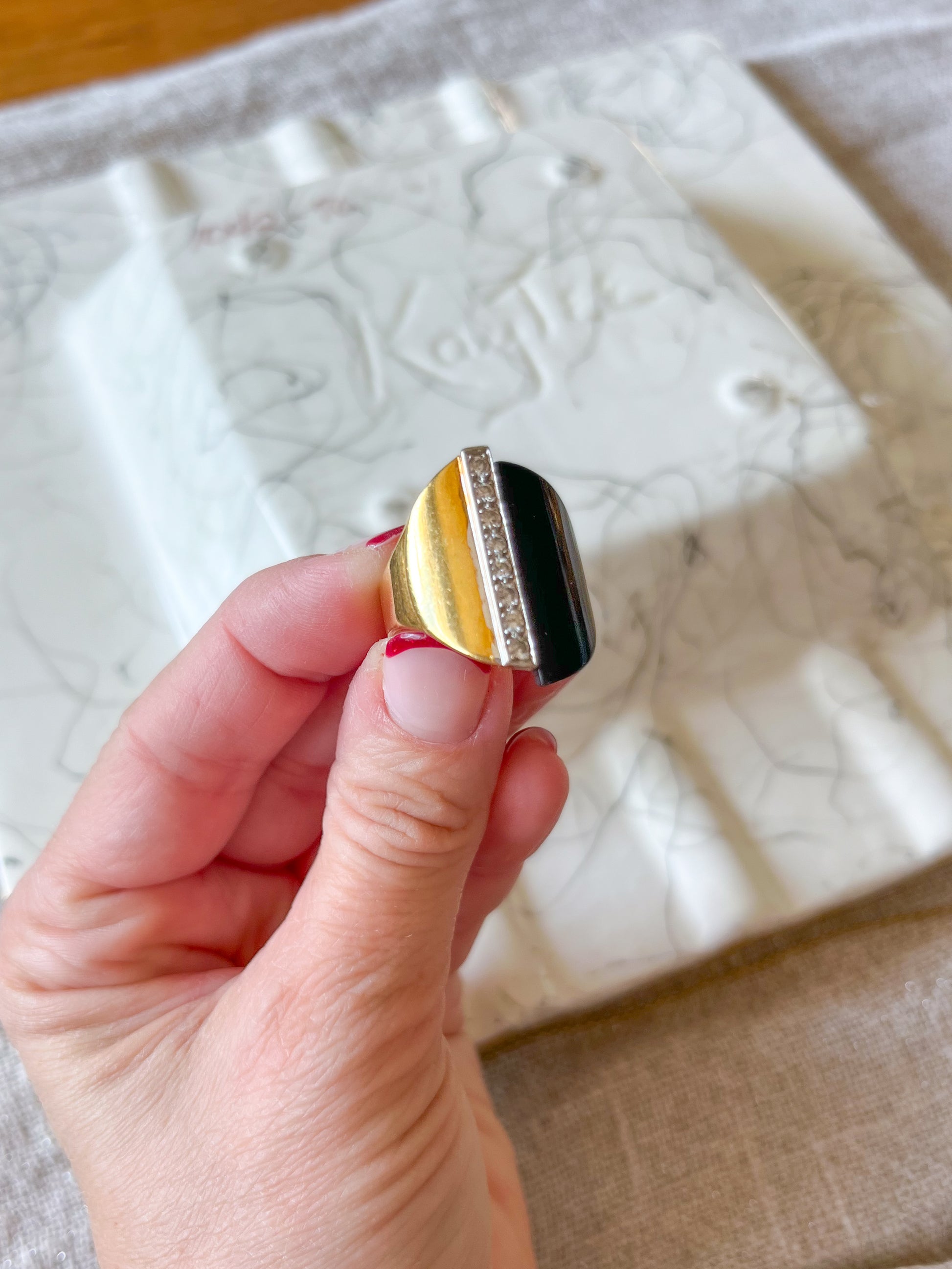 In love with this stunning onyx and diamond ring from the 60s. Can be resized at your local jeweler within reason.