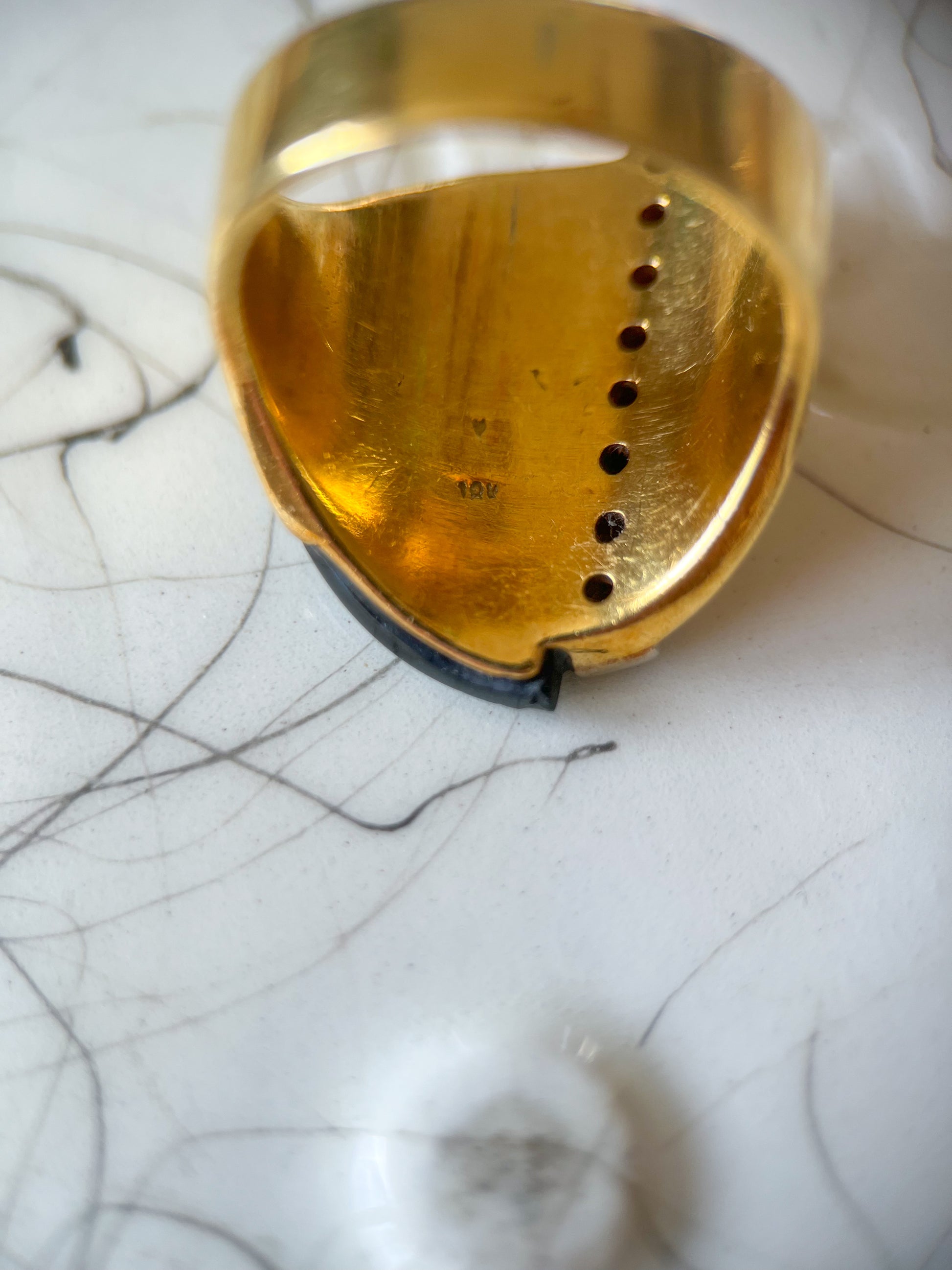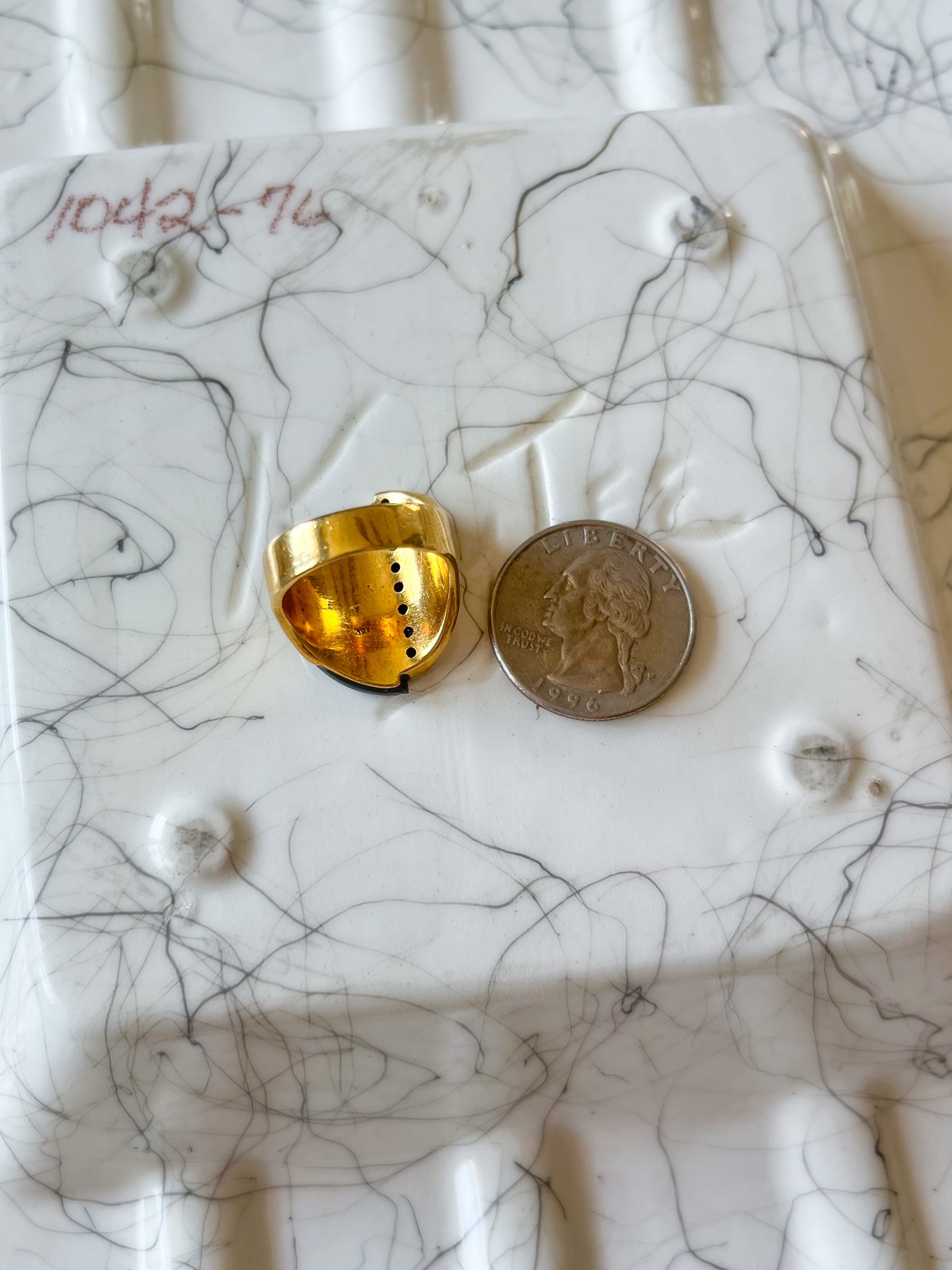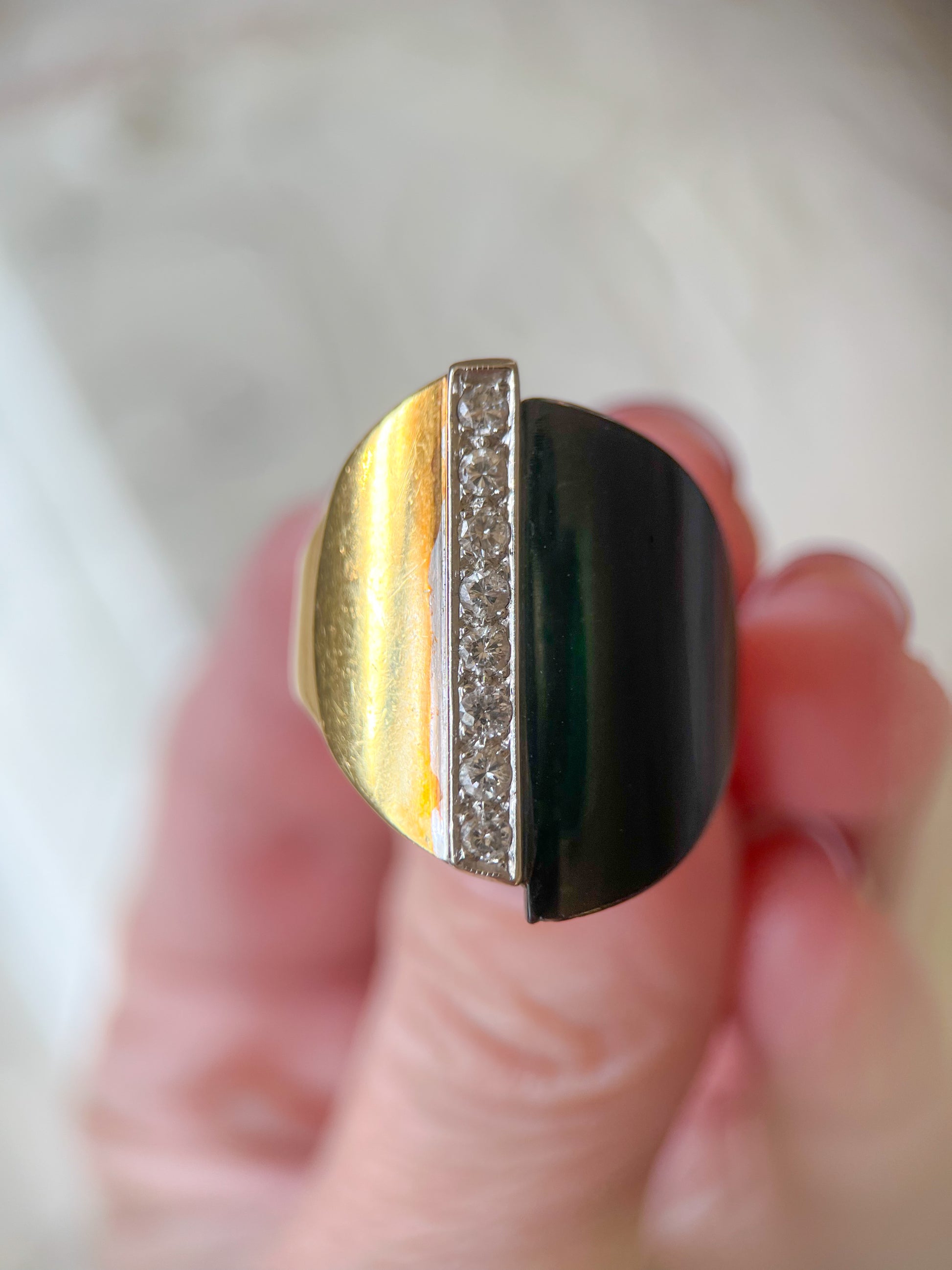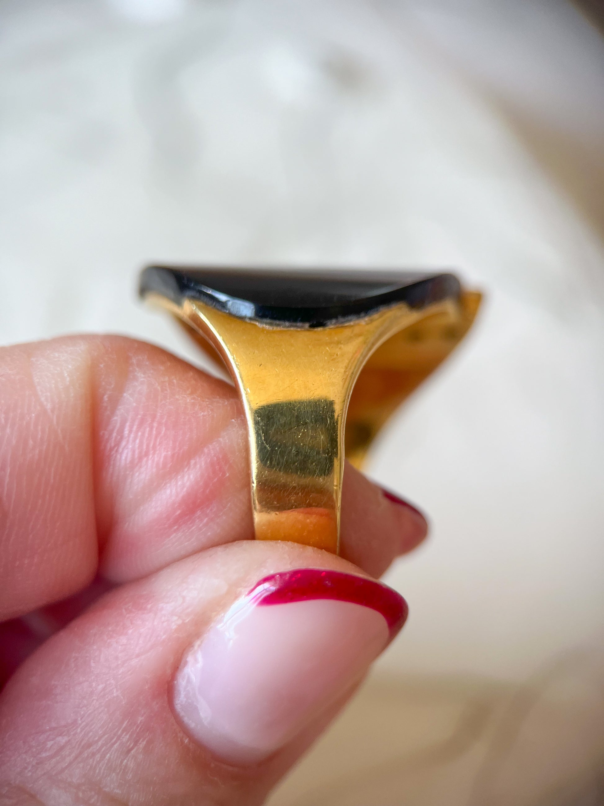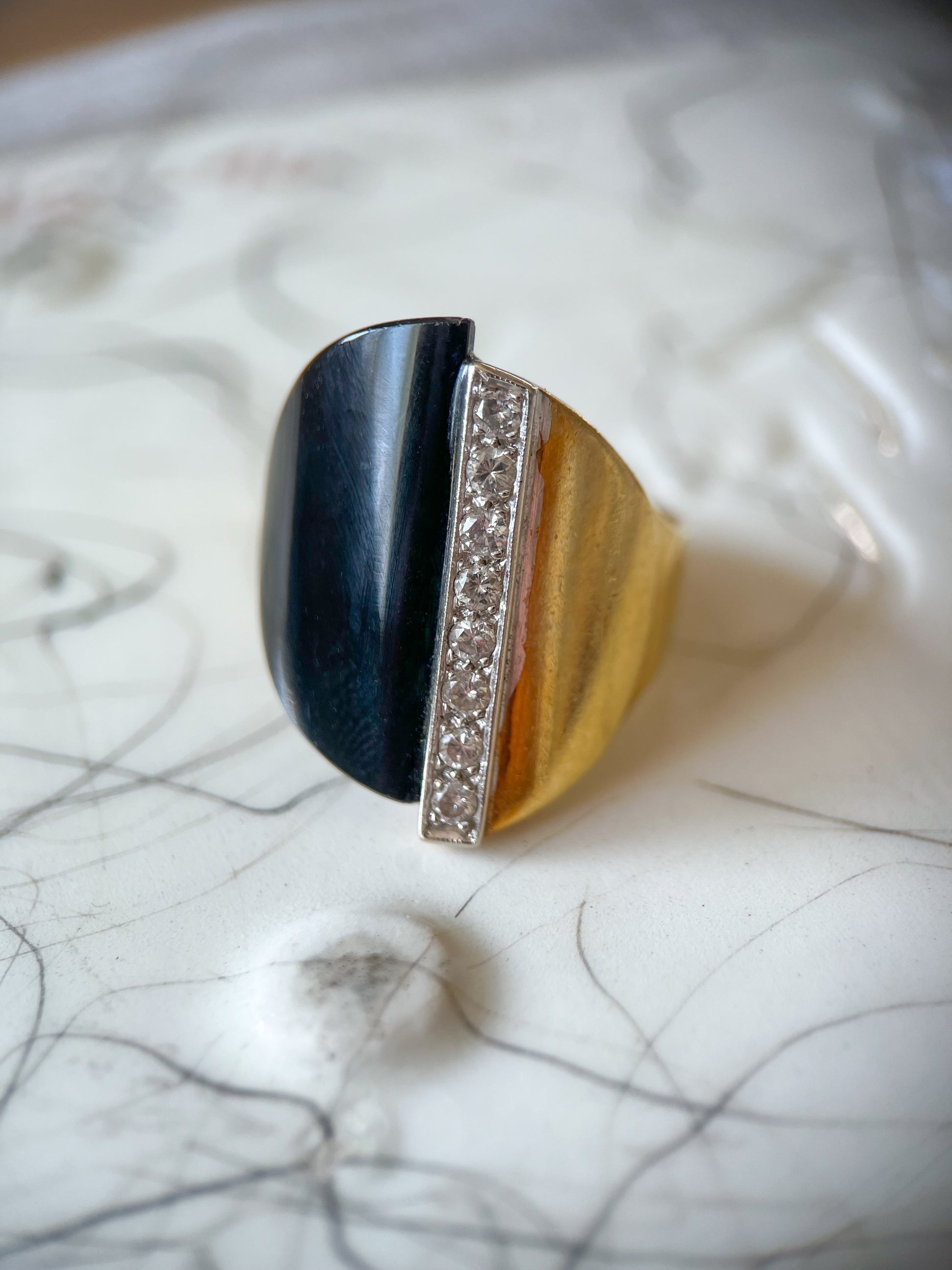 In love with this stunning onyx and diamond ring from the 60s. Can be resized at your local jeweler within reason.