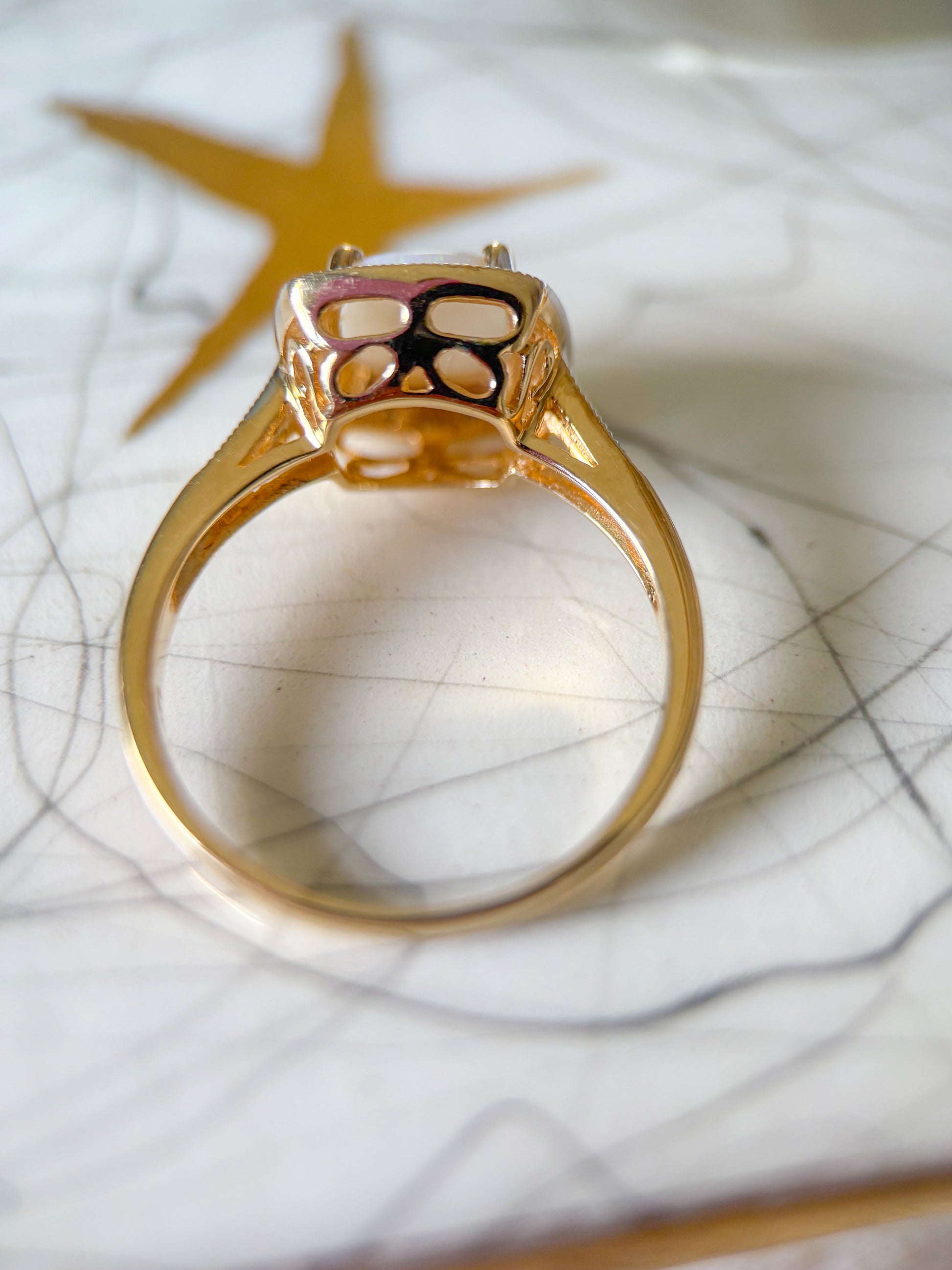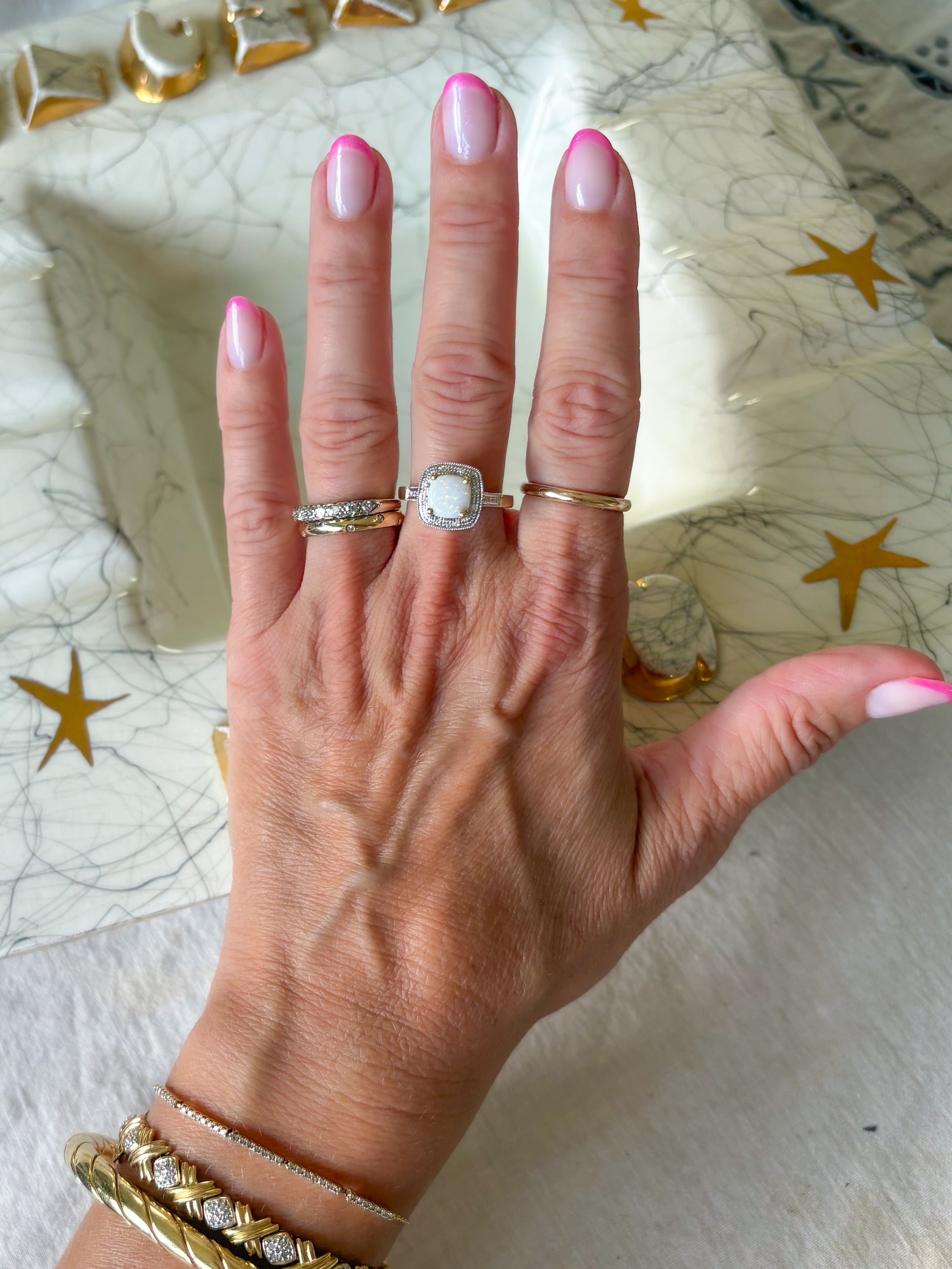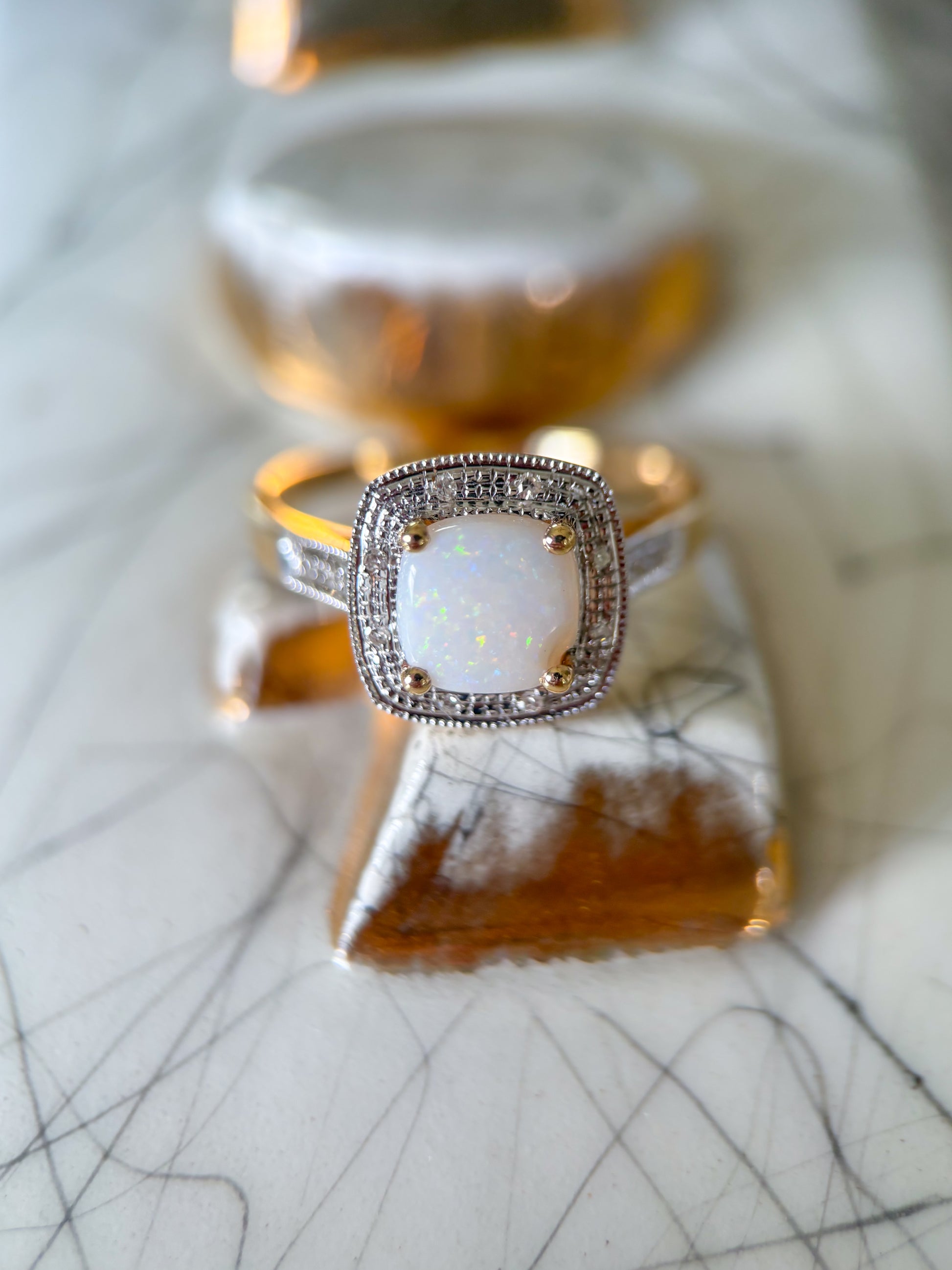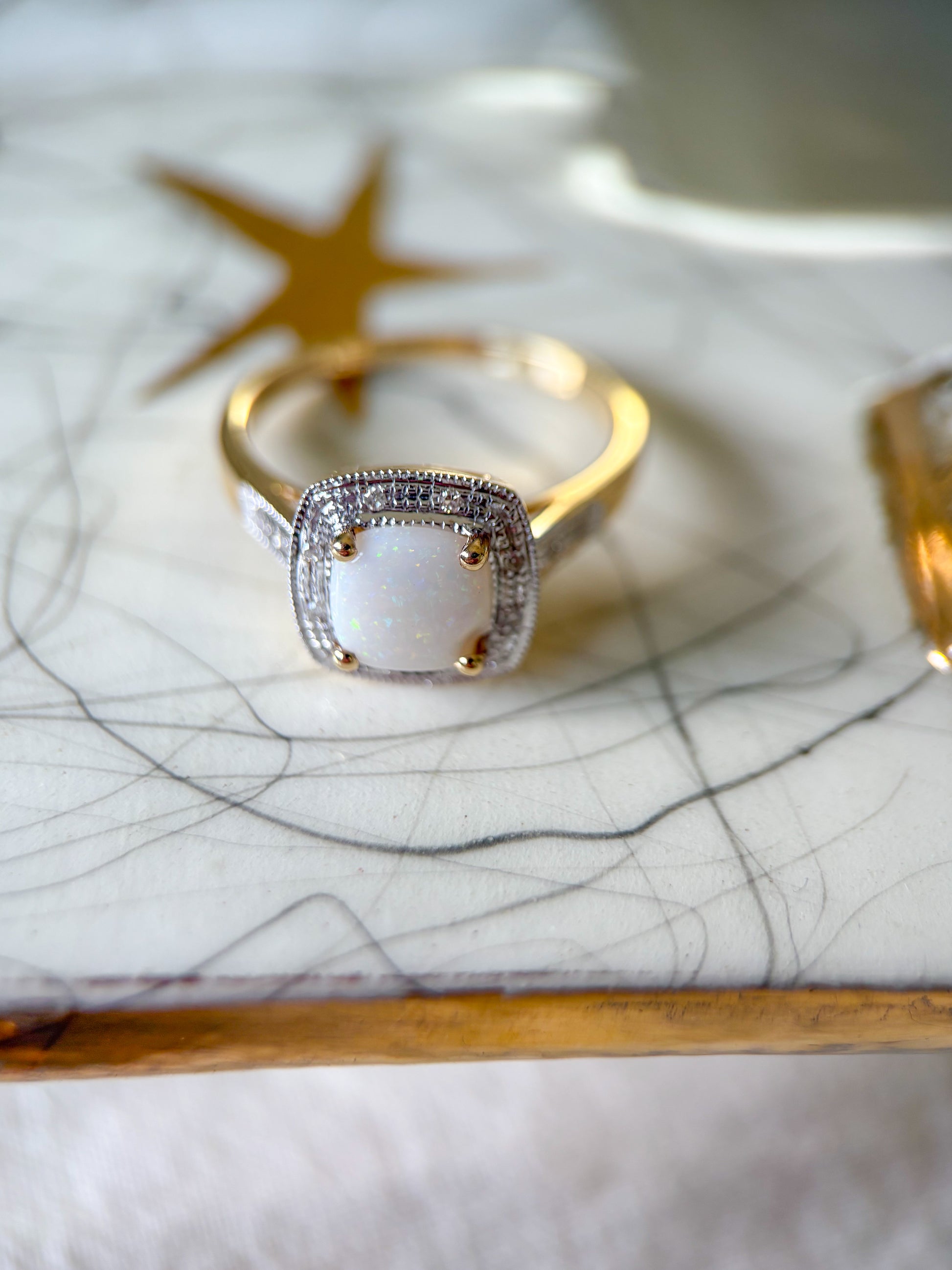 I love this one! This beautiful vintage ring features a square opal and natural diamonds. It is a size 7 and can be resized at your local jeweler.
