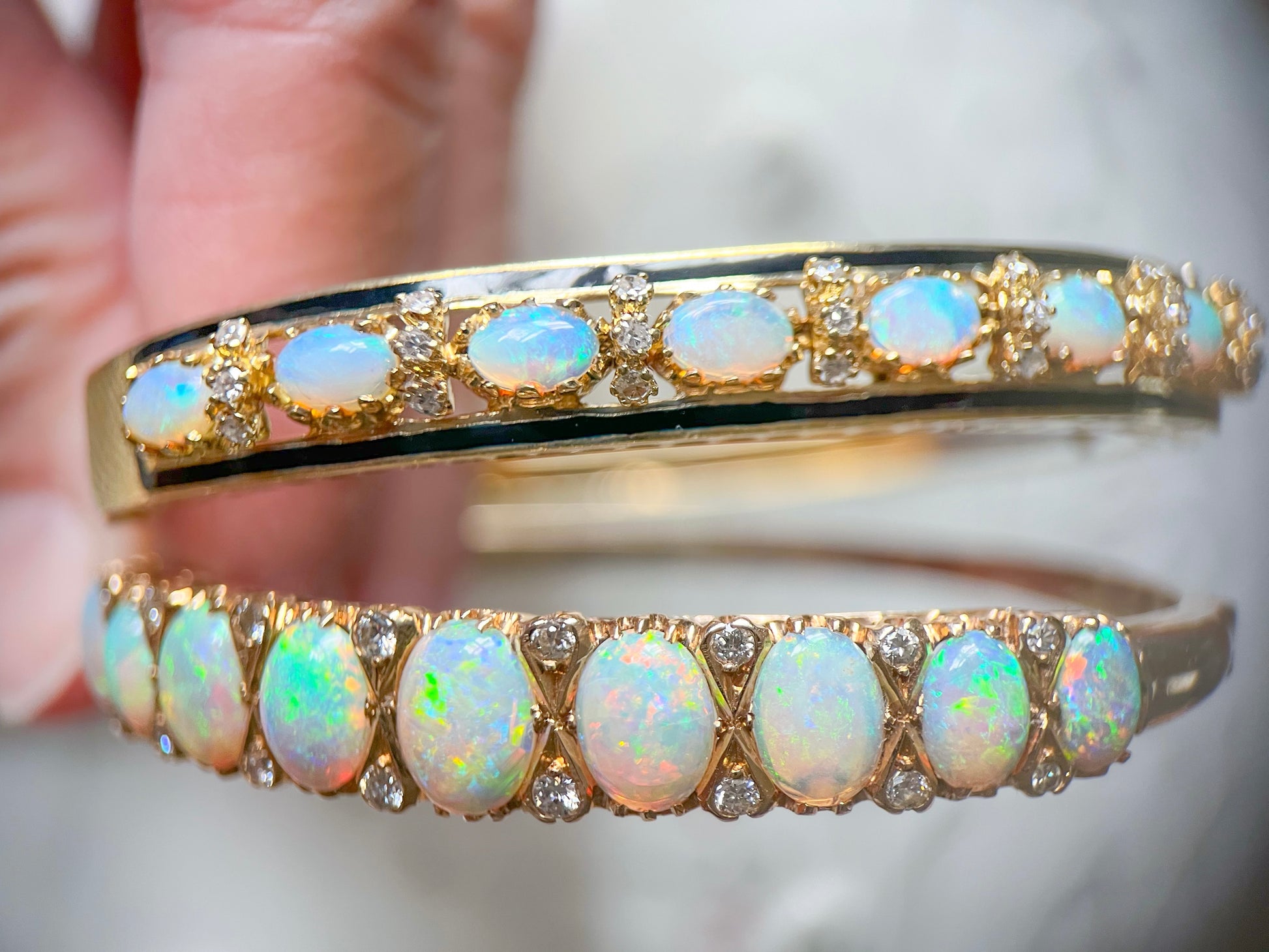 Vintage Opal, Natural Diamond and Enamel 14k Yellow Gold Bangle