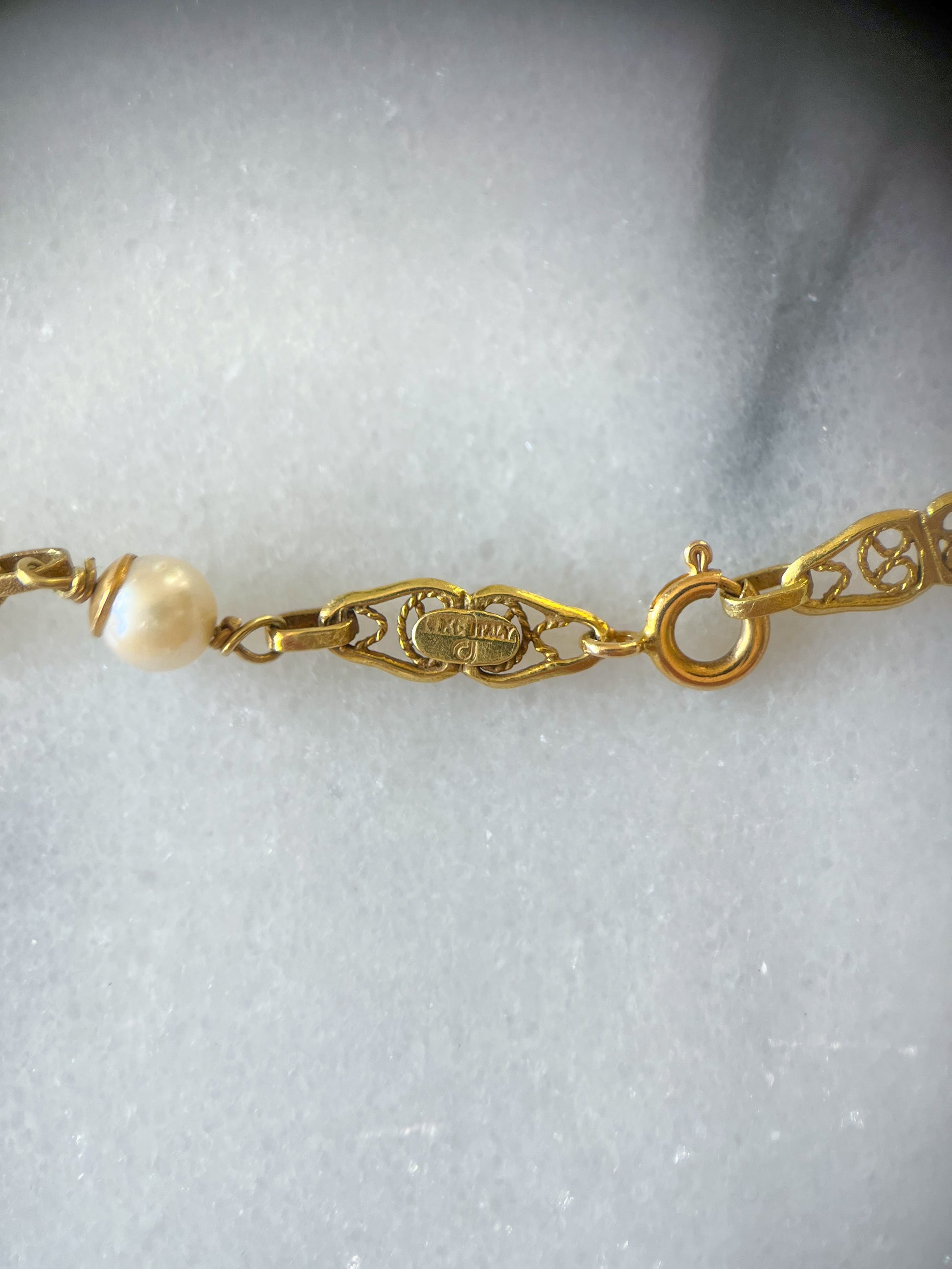 Two beautiful vintage, yellow gold chains with pearls. One is made with 14k yellow gold and one is 18k yellow gold.