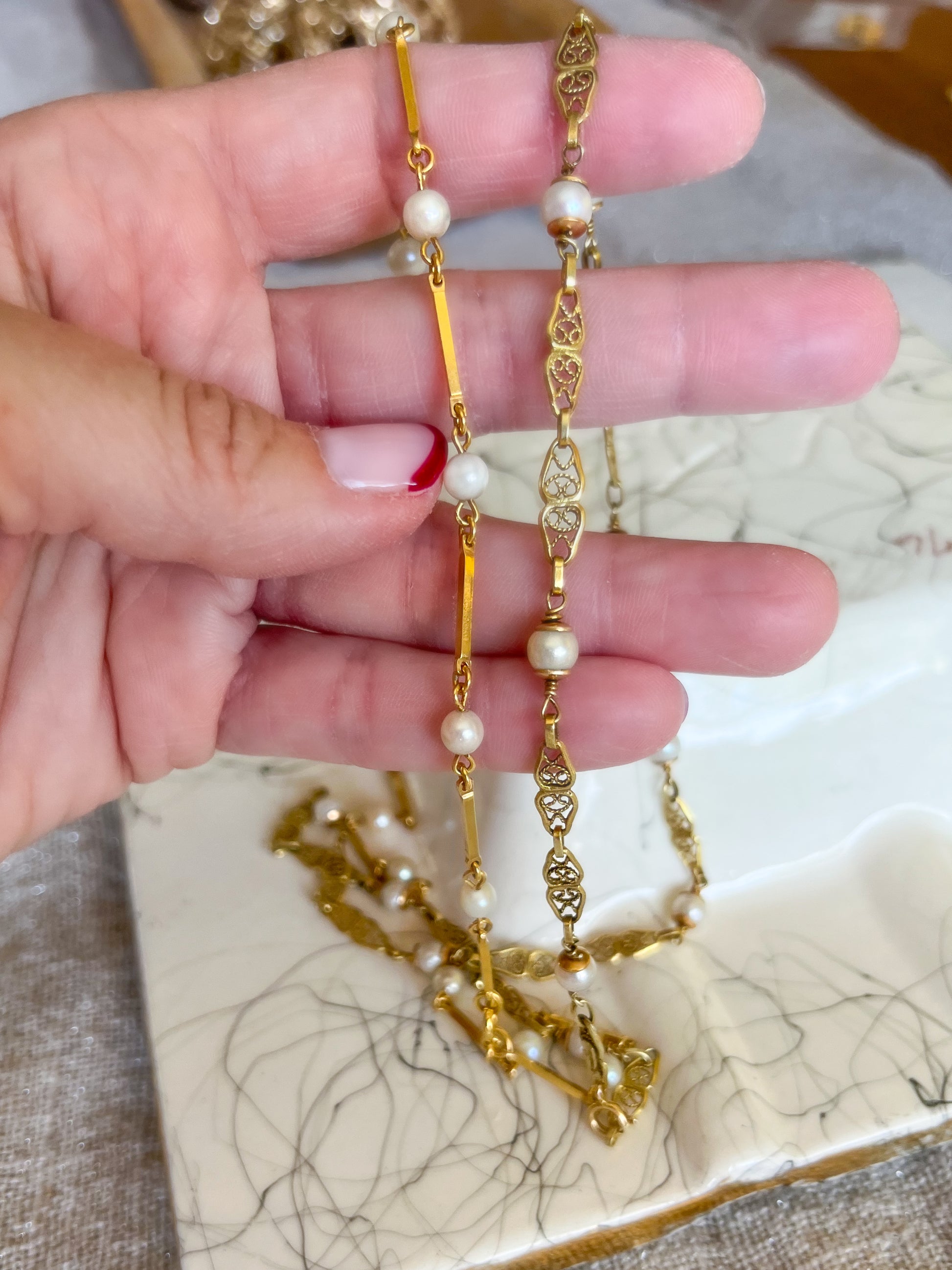 Vintage Pearl and Chain Necklaces in 14k and 18k Yellow Gold