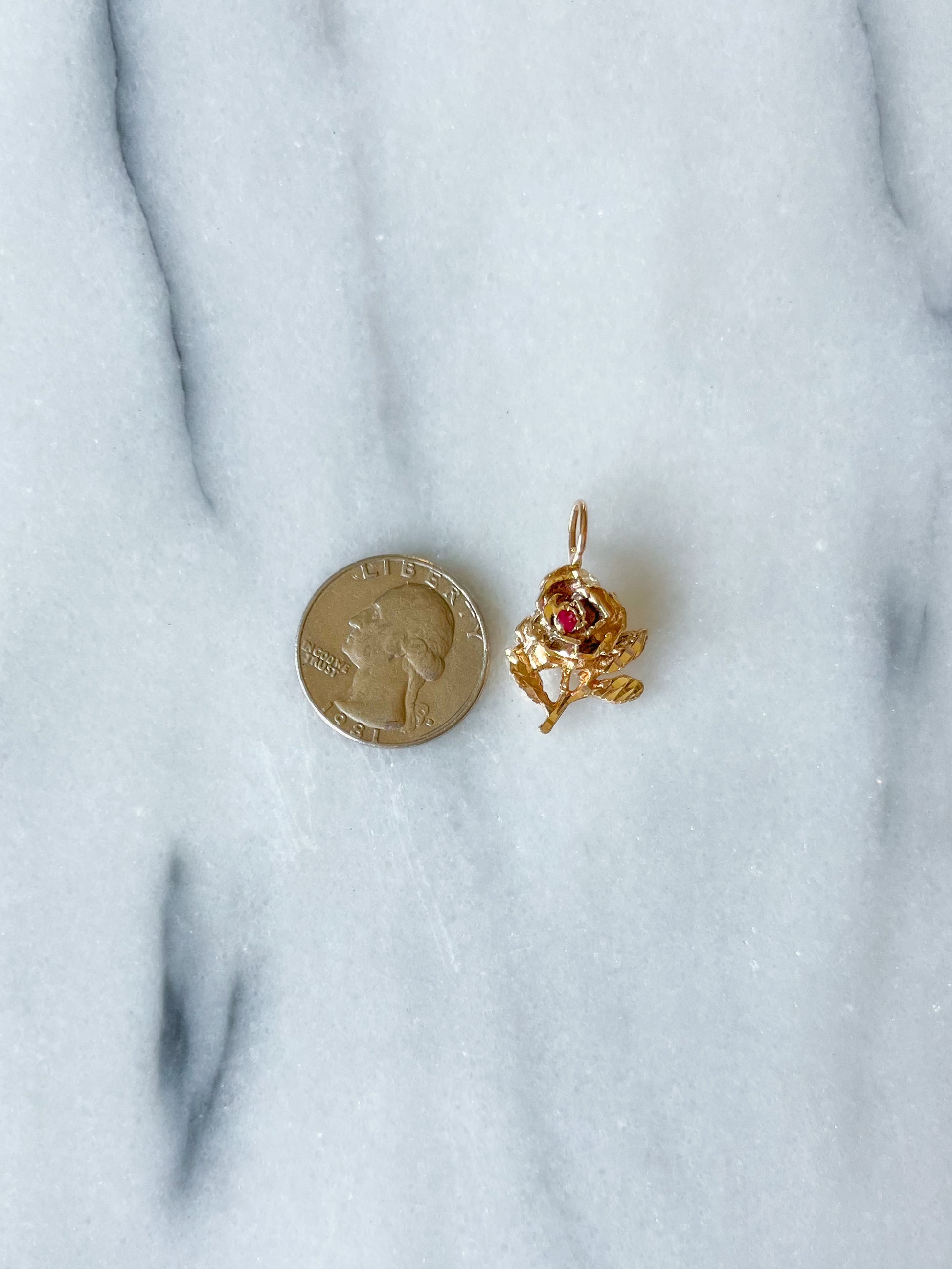 Vintage, 14k yellow gold and natural ruby rose charm. This beauty used to be a pin that we converted into a charm. It weighs 3.60 grams. Chain not included.