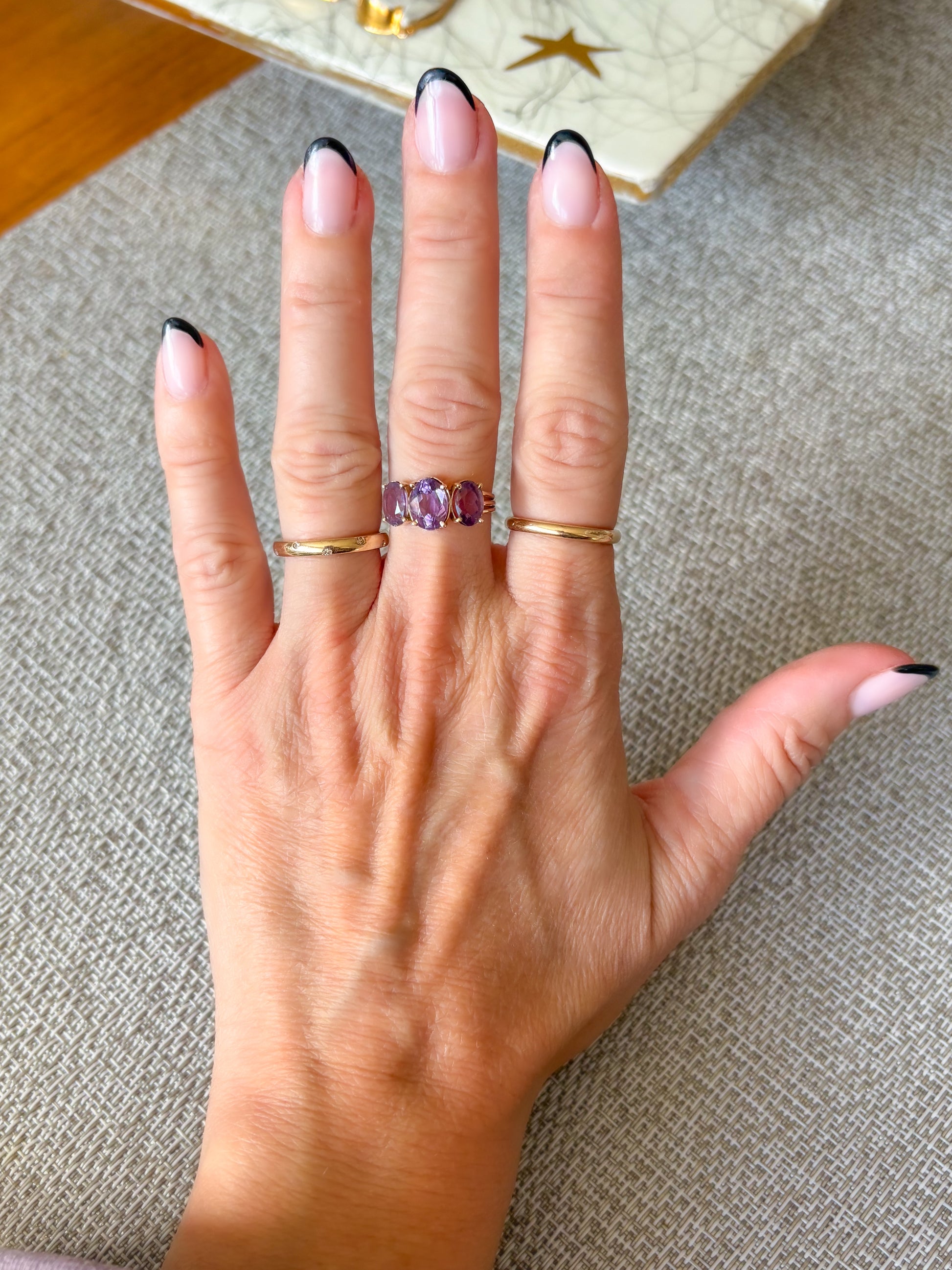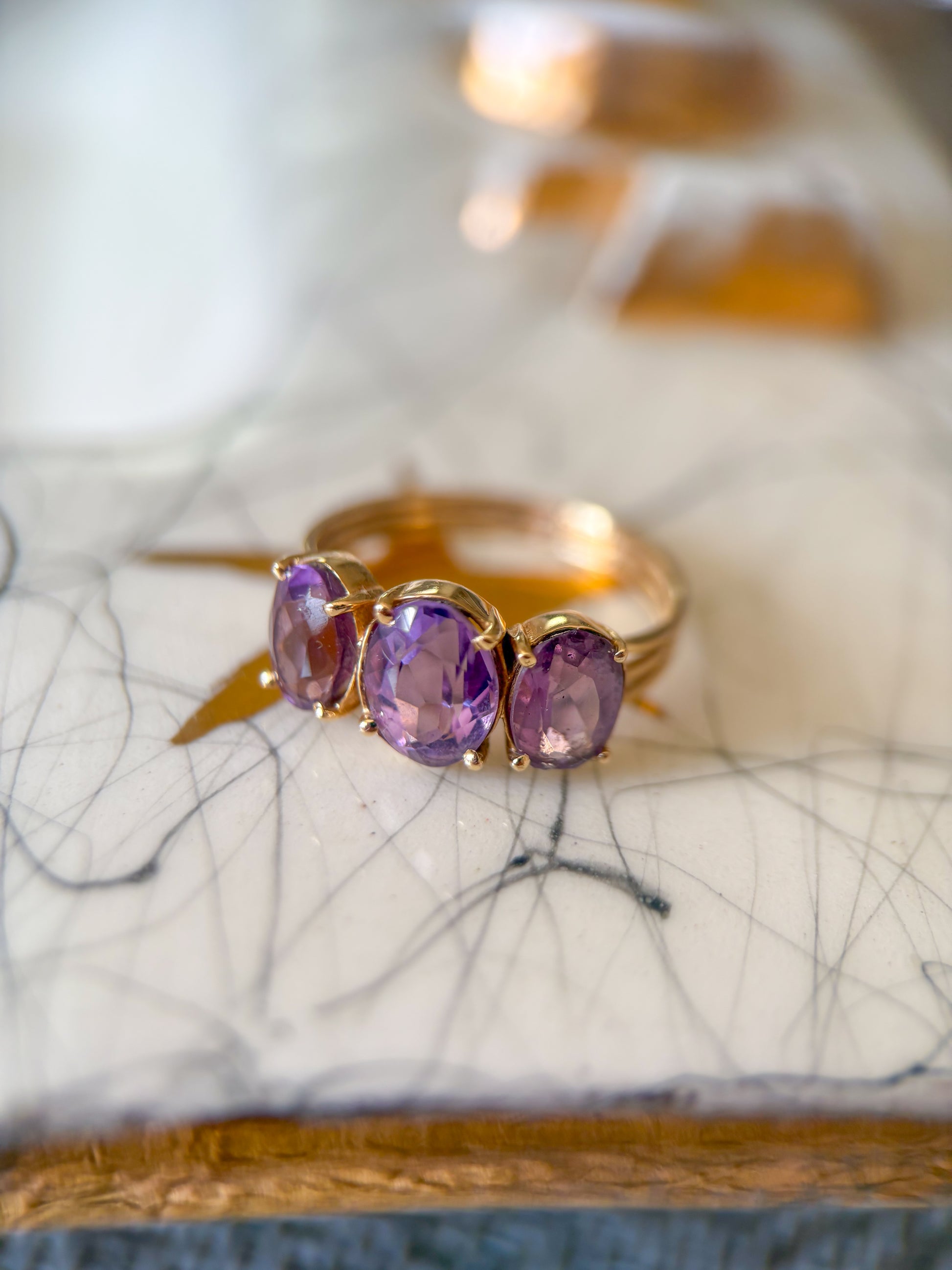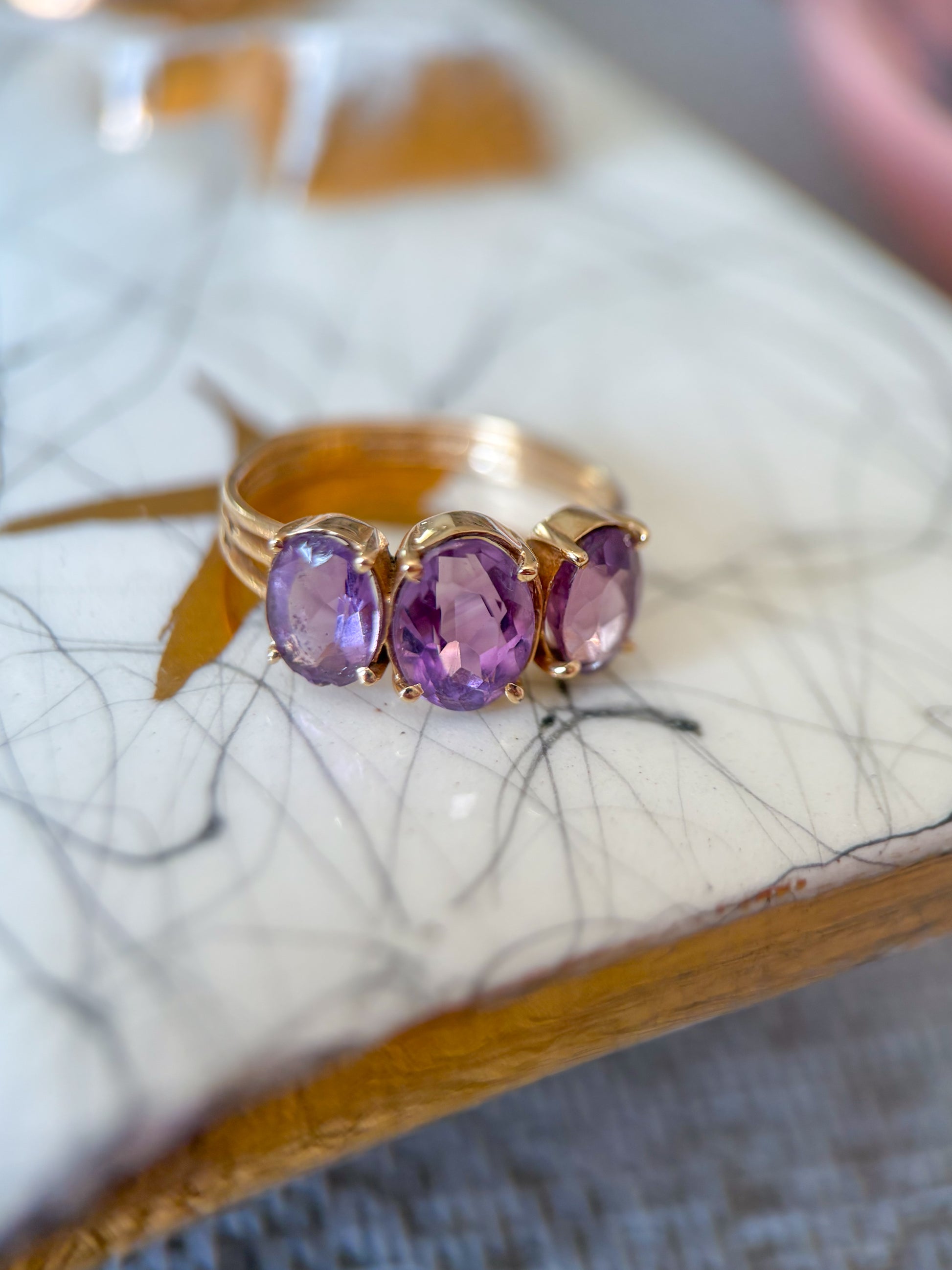 Loving this 14k yellow gold, vintage, 3 stone, semi precious amethyst ring featuring 3 oval light purple amethysts. Ring is a size 5 and can be resized at your local jeweler.