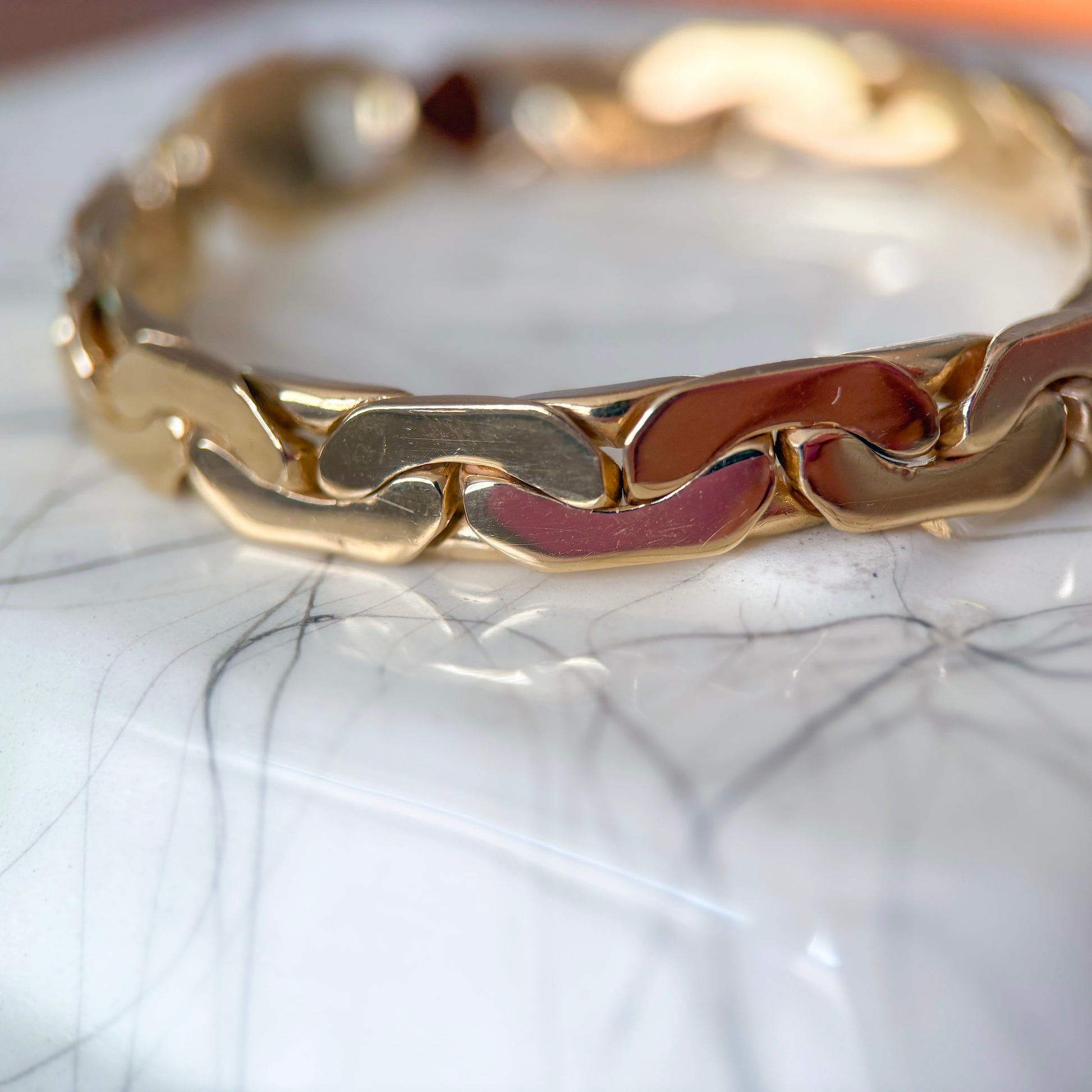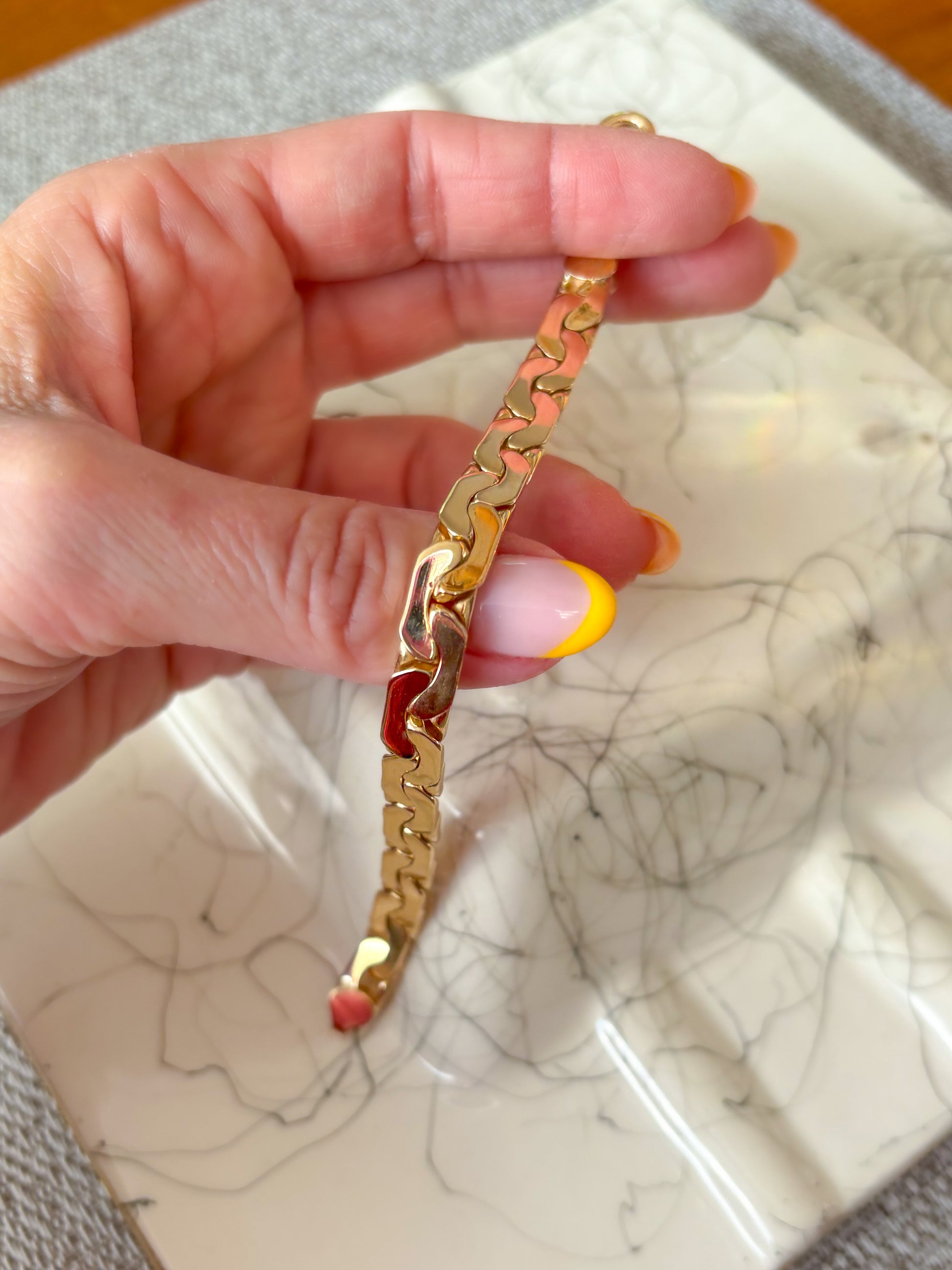 This heavy hitter is just incredible. 🤩 This C link, vintage bracelet was actually made out of a necklace and is from the 1970s. It weighs over 30 grams and is 14k yellow gold. It is solid, heavy and simply stunning. Please note: This bracelet is made of solid 14k yellow gold - chain and both end caps. The lobster claw is made of 10k yellow gold.Â
