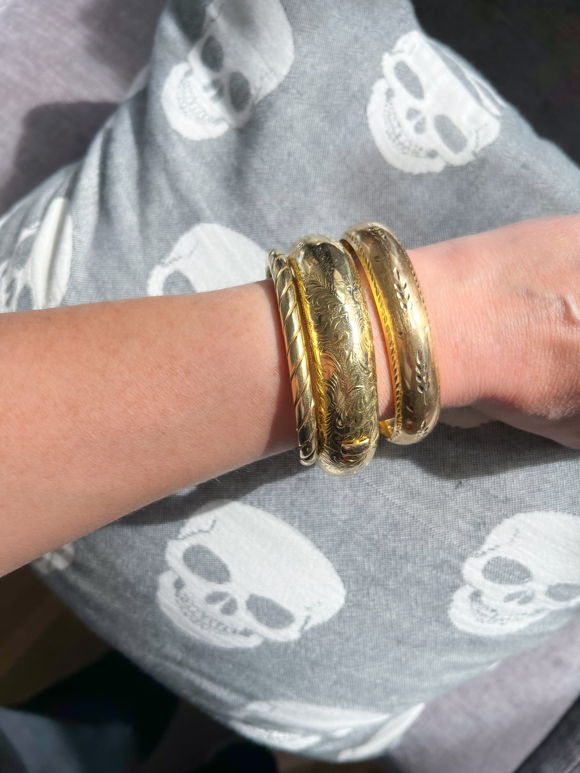 Super chunky, 14k yellow gold bangle with beautiful floral designs throughout.