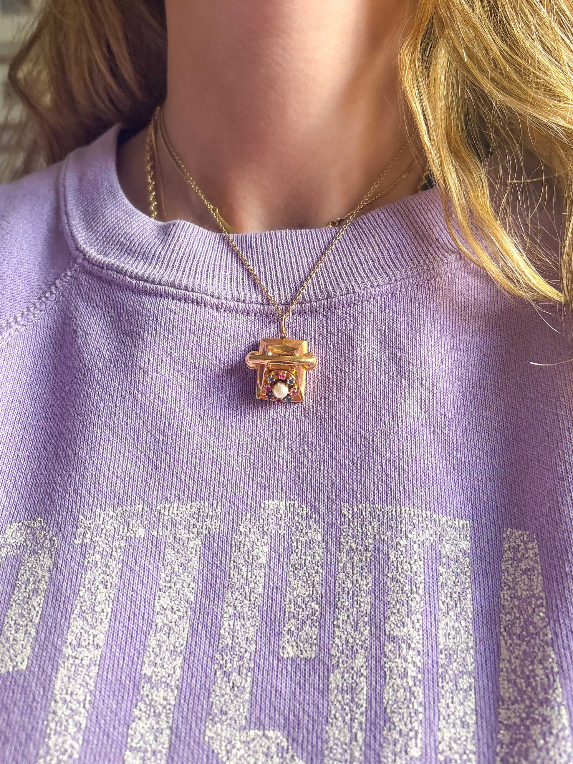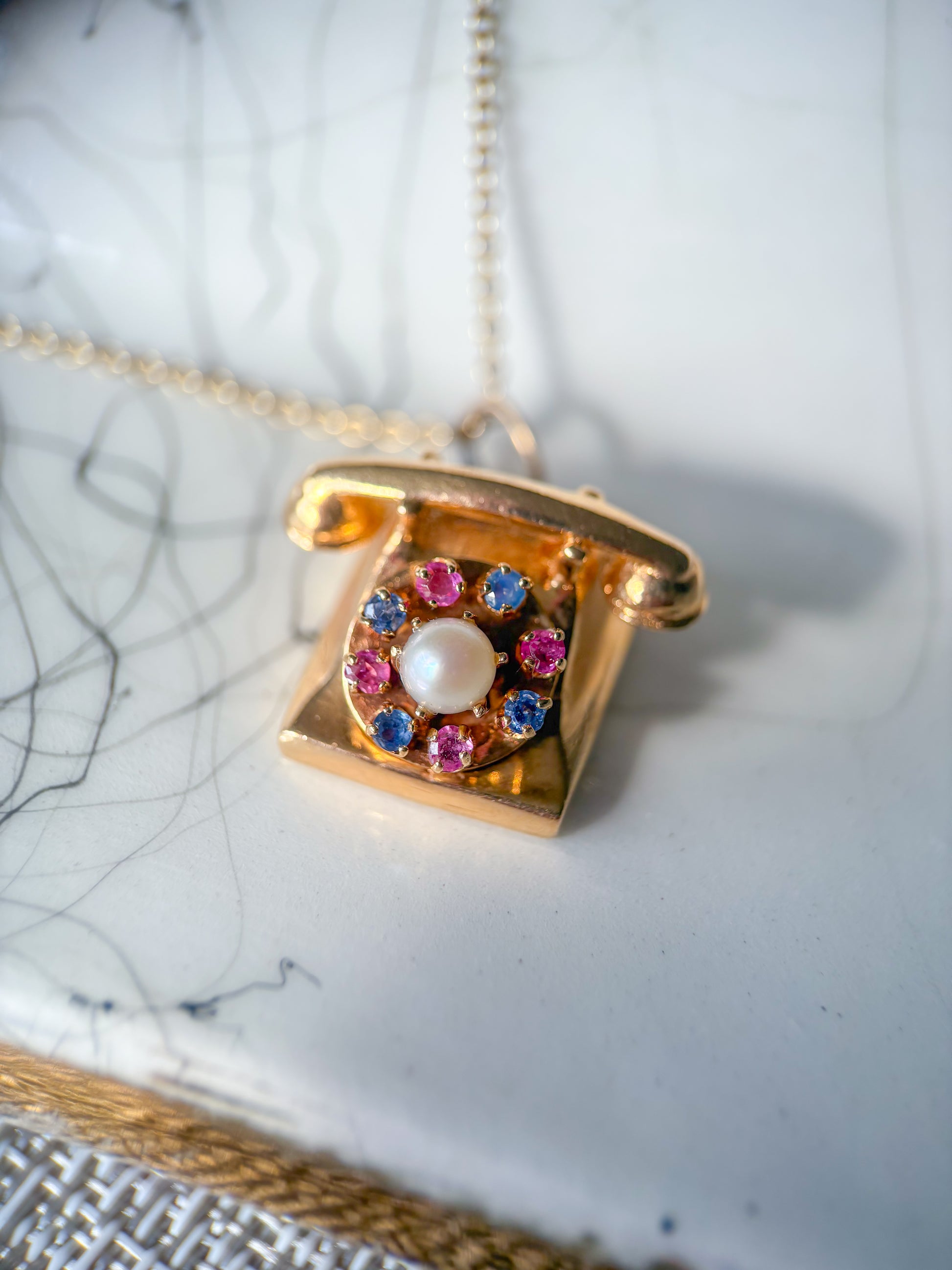 Vintage Telephone with Natural Rubies, Sapphires and a Pearl 14k Yellow Gold Charm