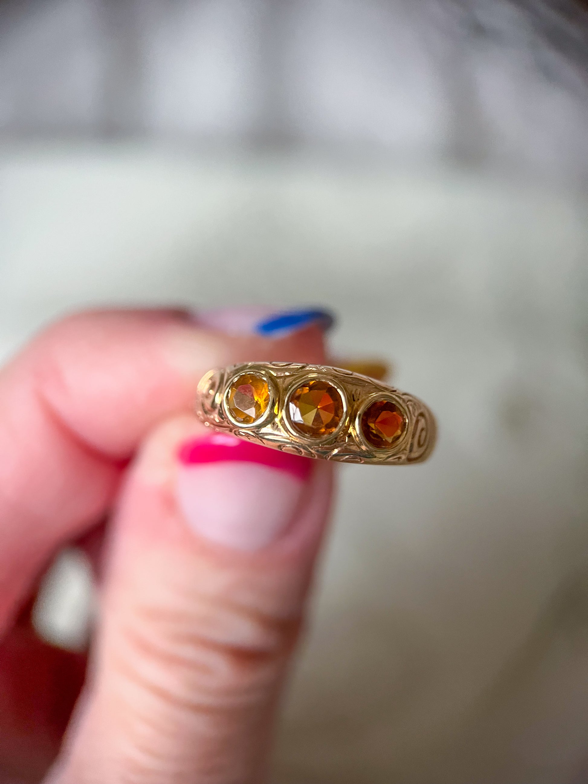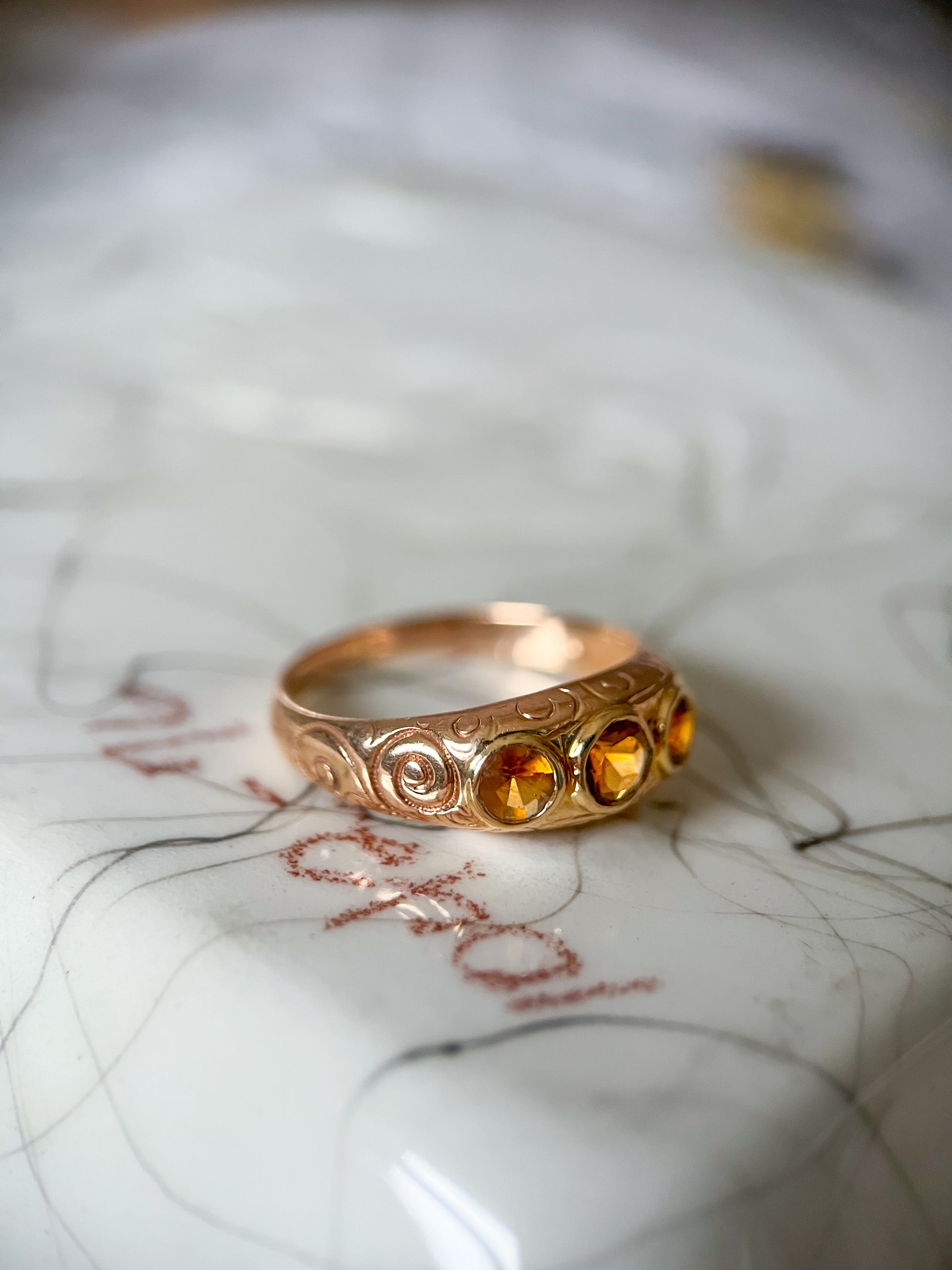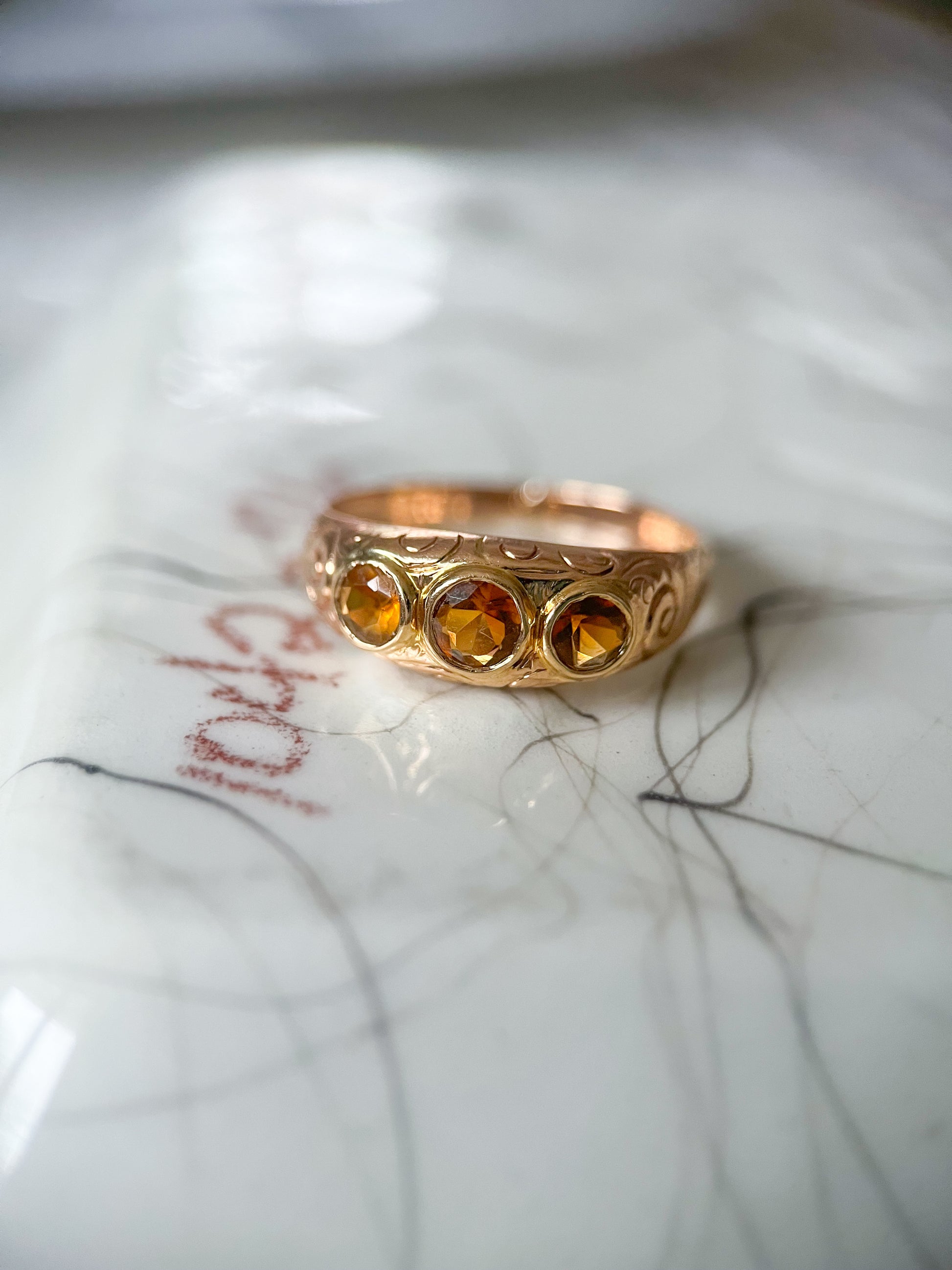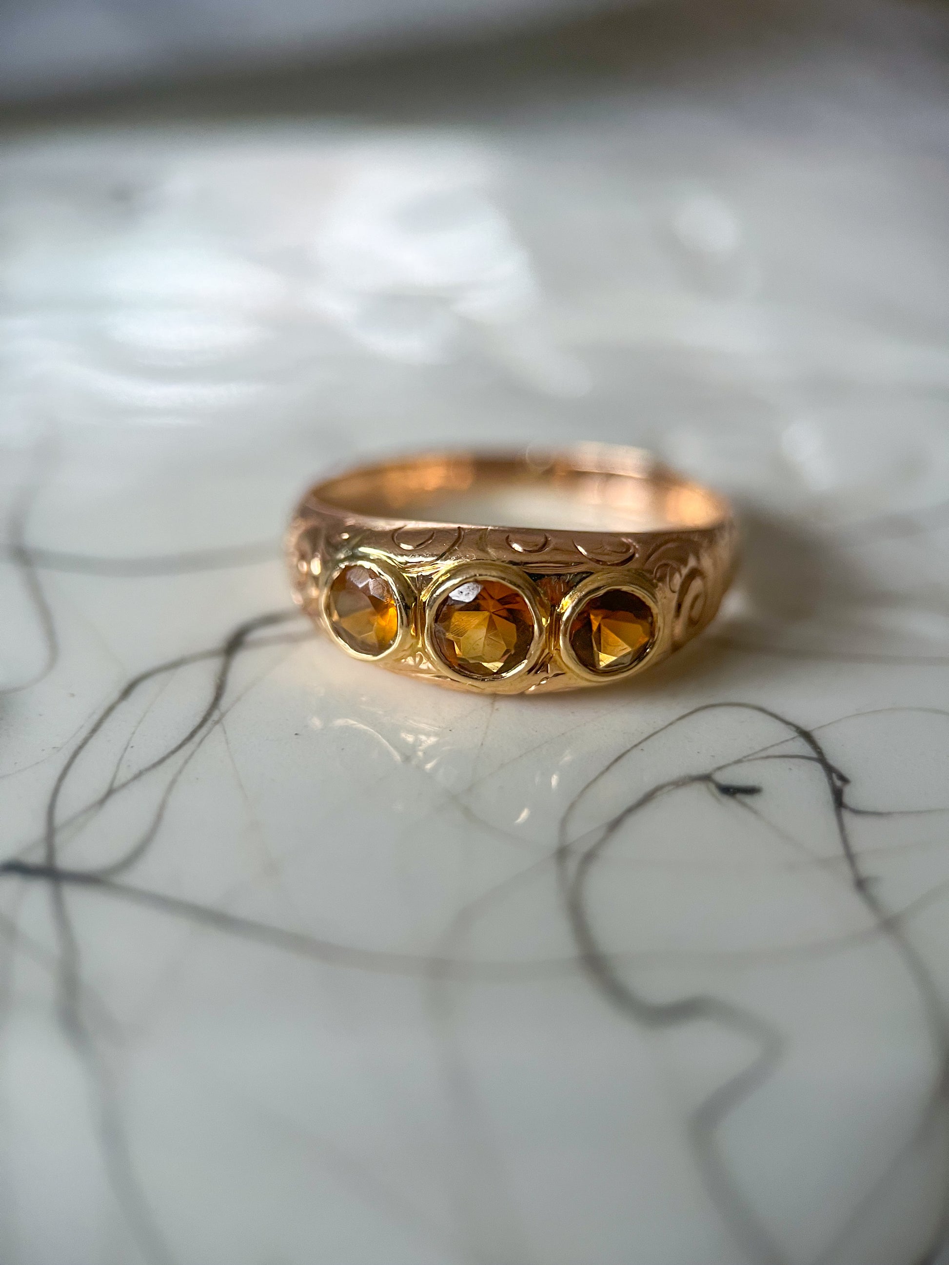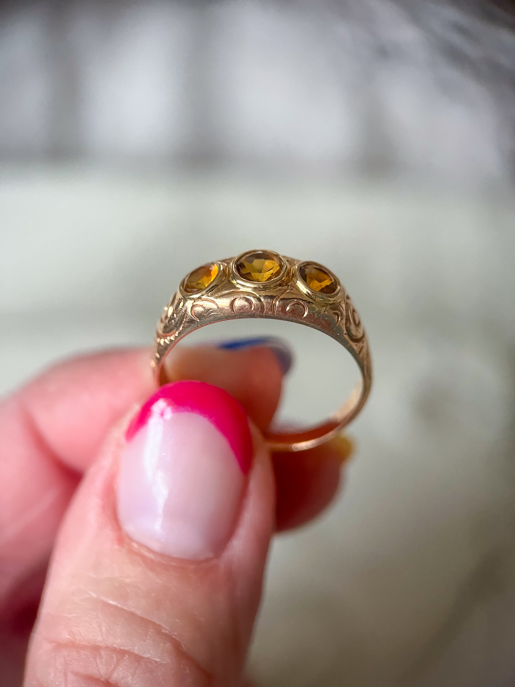 Absolutely stunning, vintage (possibly antique) 10k yellow gold and natural citrine ring. This ring features 3 round citrine, on a beautifully etched slight dome ring. The hallmarks have disappeared, but stones were tested and gold was acid tested.