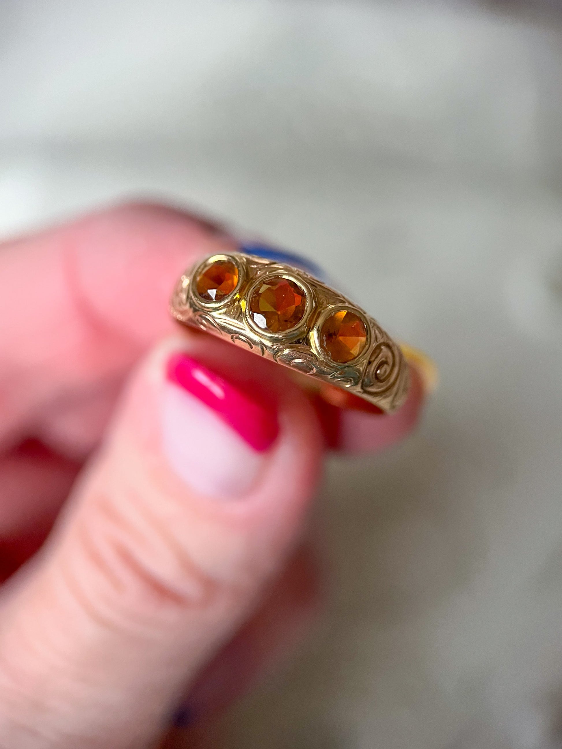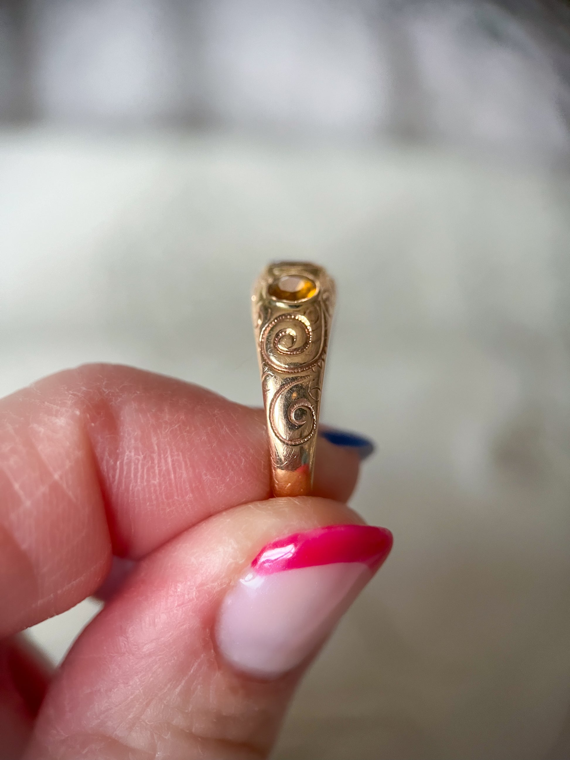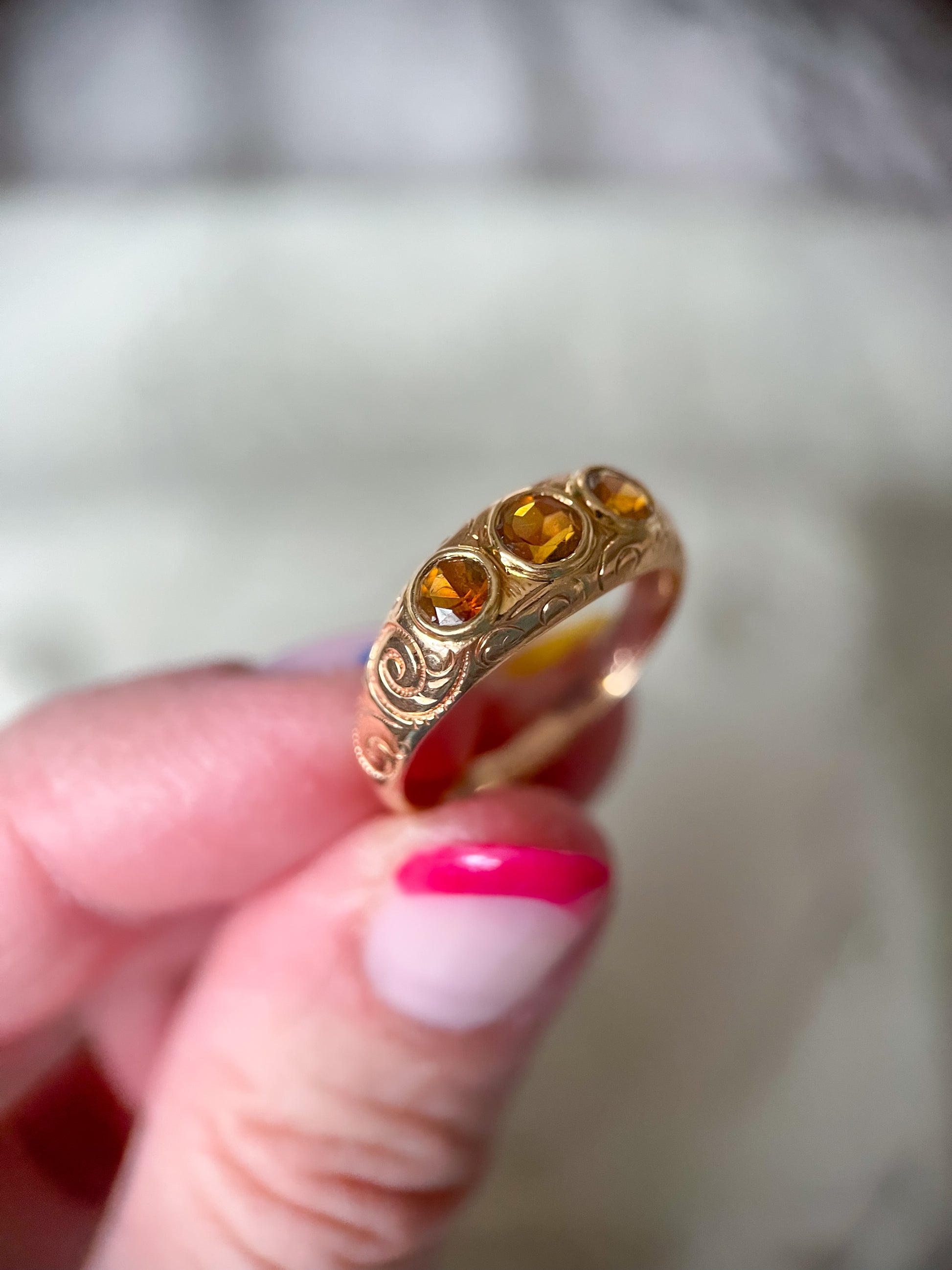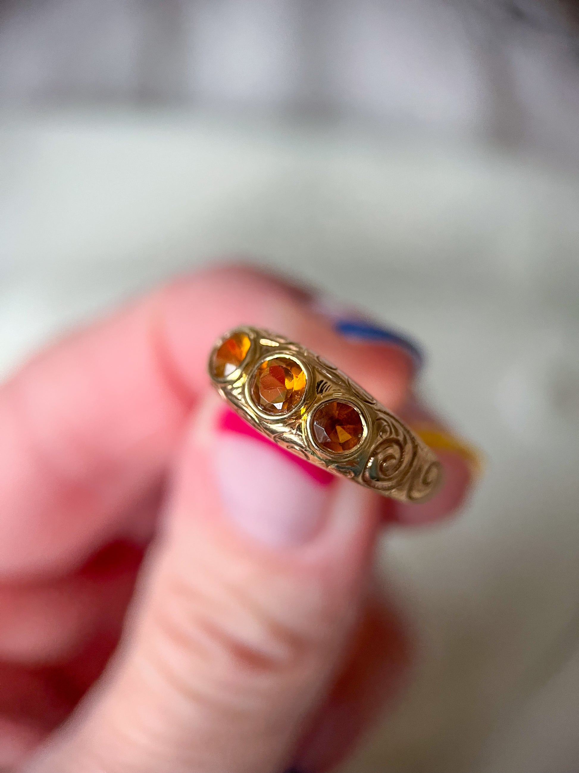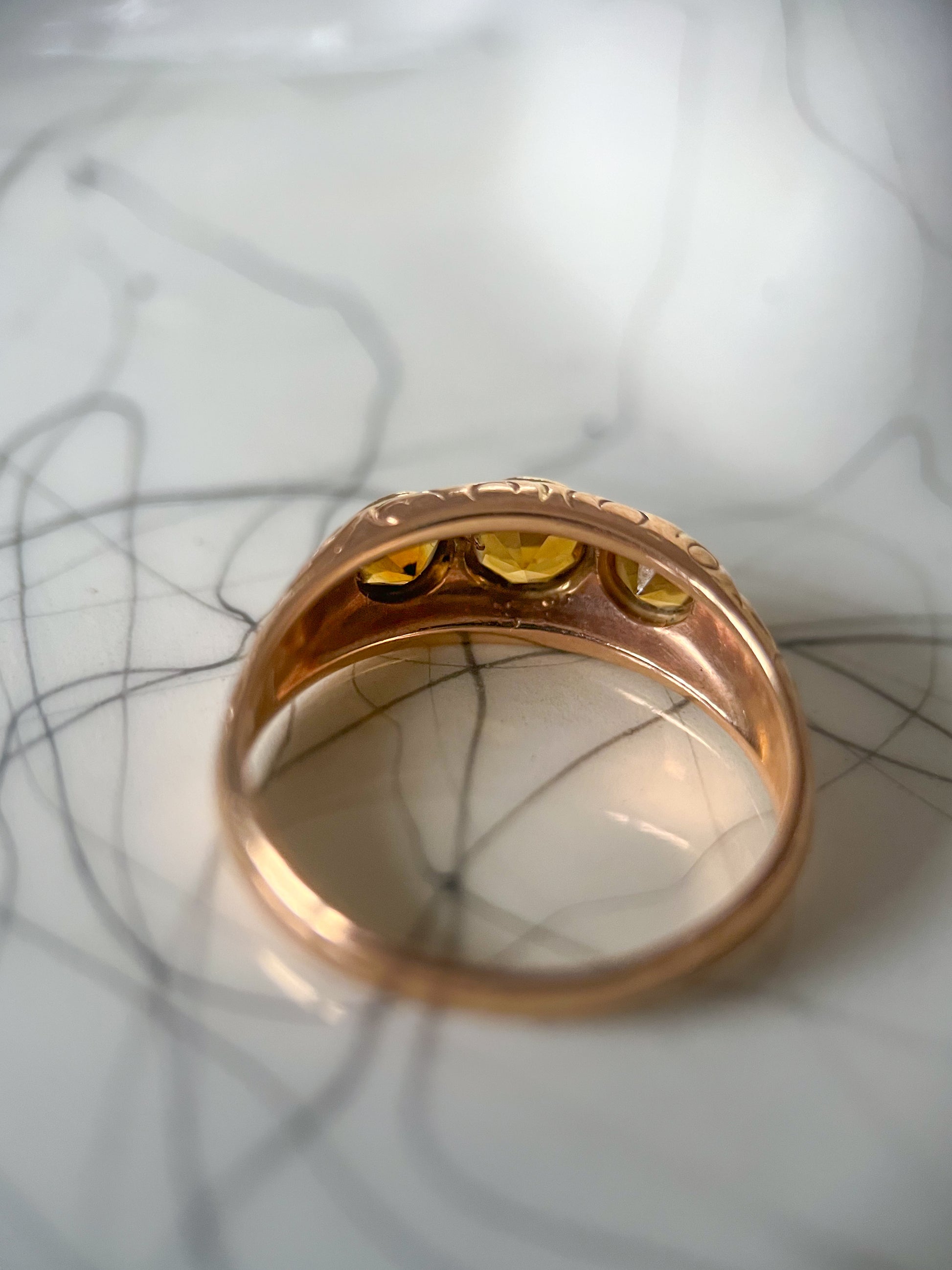Absolutely stunning, vintage (possibly antique) 10k yellow gold and natural citrine ring. This ring features 3 round citrine, on a beautifully etched slight dome ring. The hallmarks have disappeared, but stones were tested and gold was acid tested.