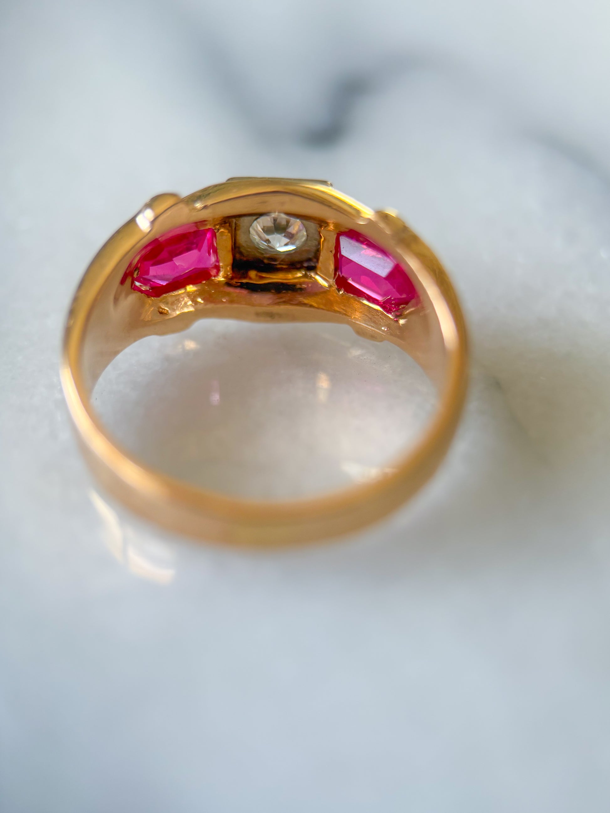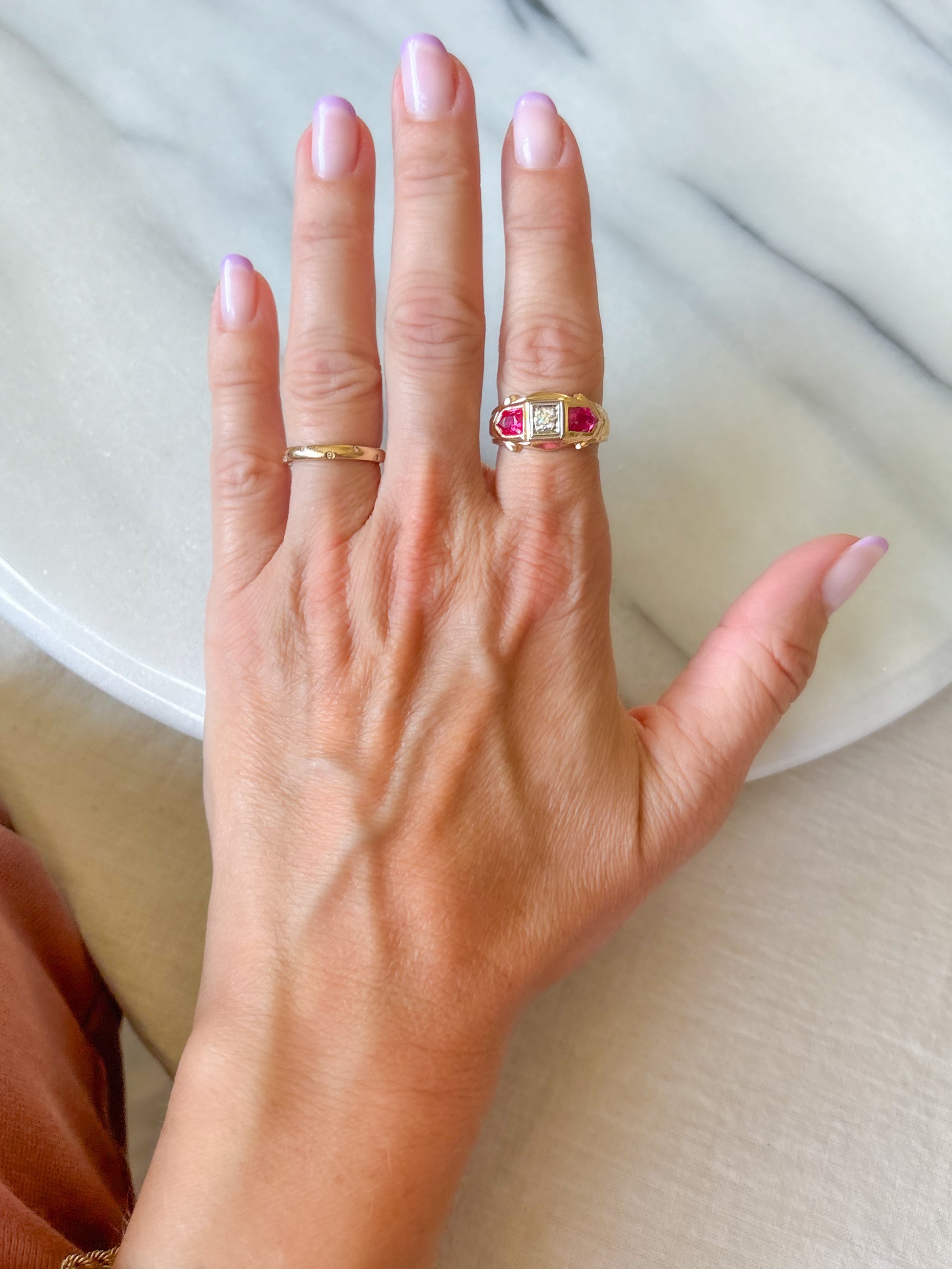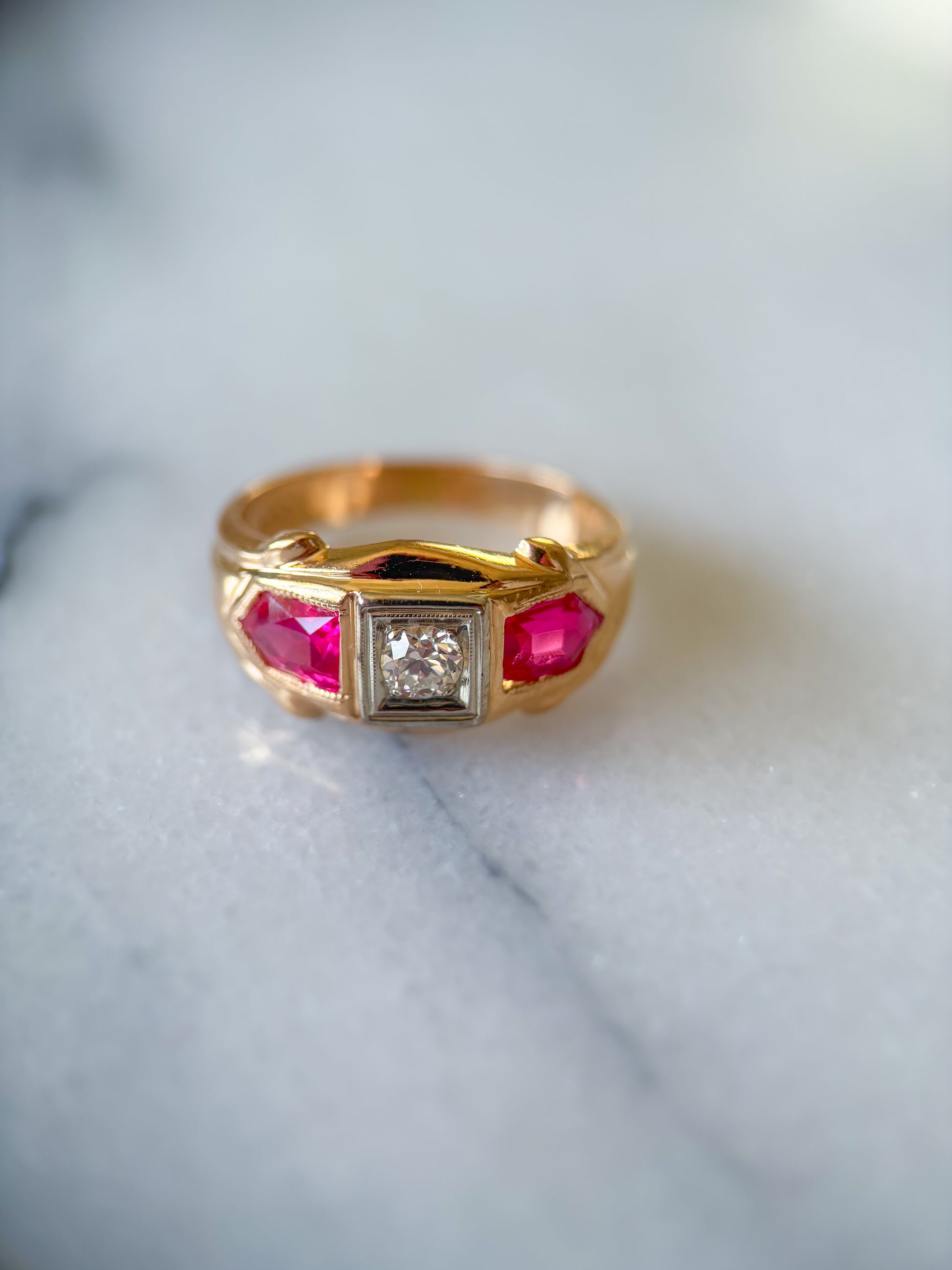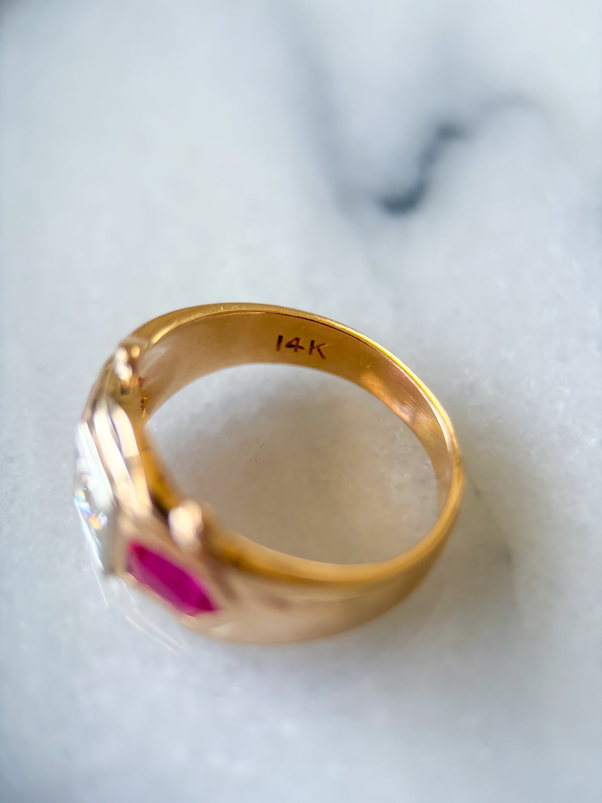 Love this vintage, 14k yellow gold ring featuring one natural round diamond and two semi precious rubies. This ring weighs over 5 grams and is a size 6 3/4. This beauty can be resized at your local jeweler.