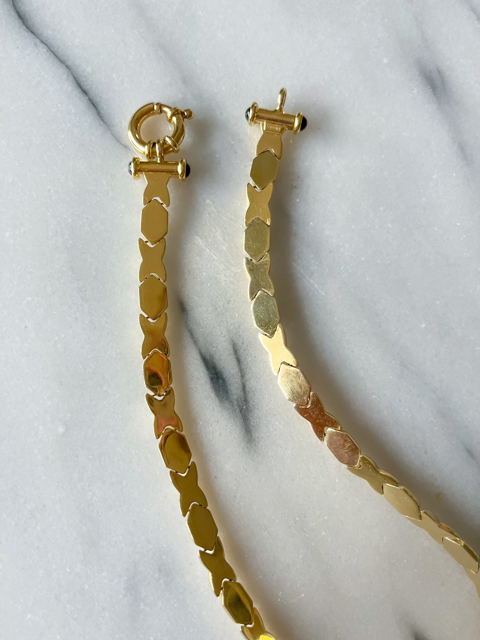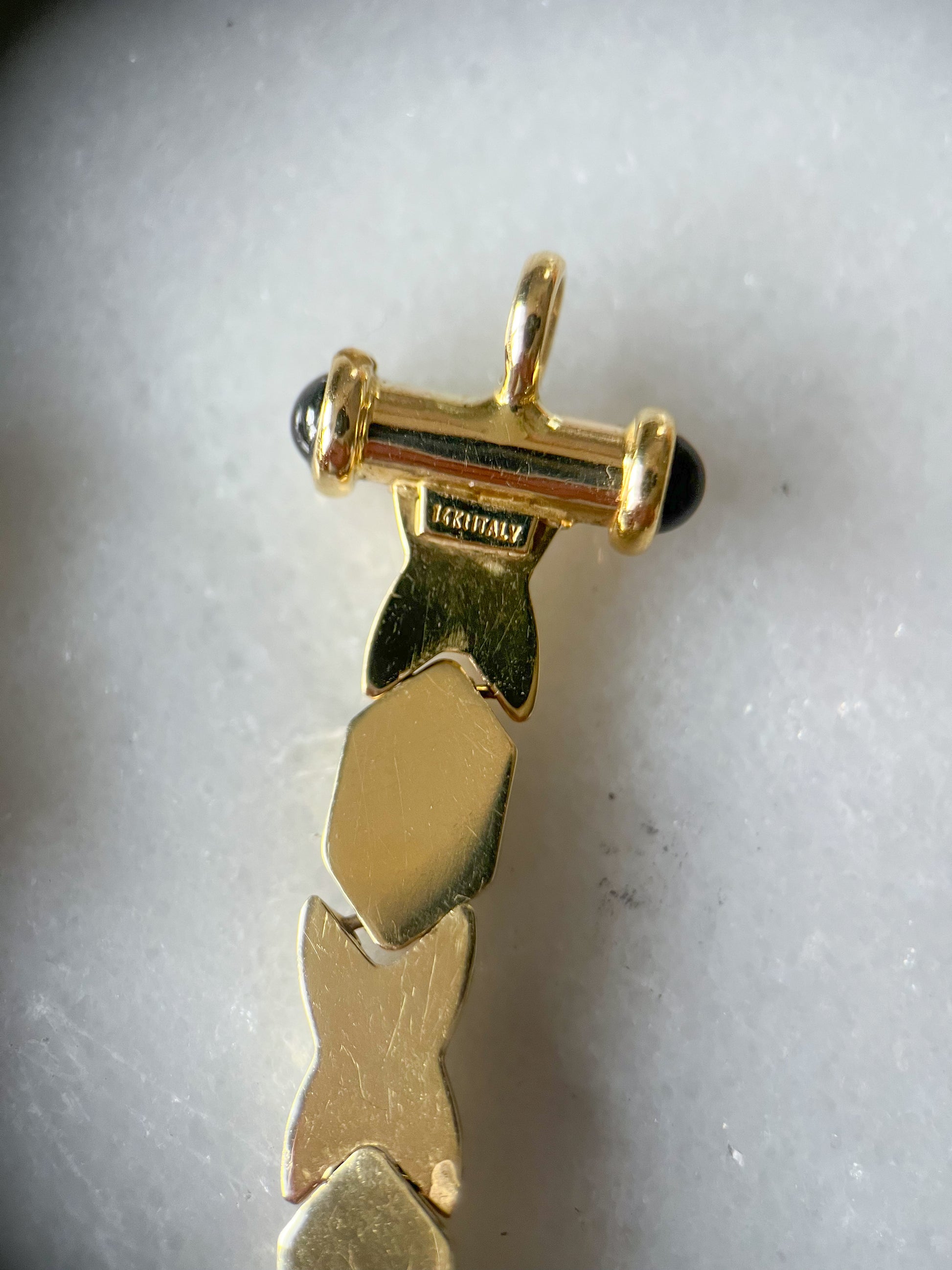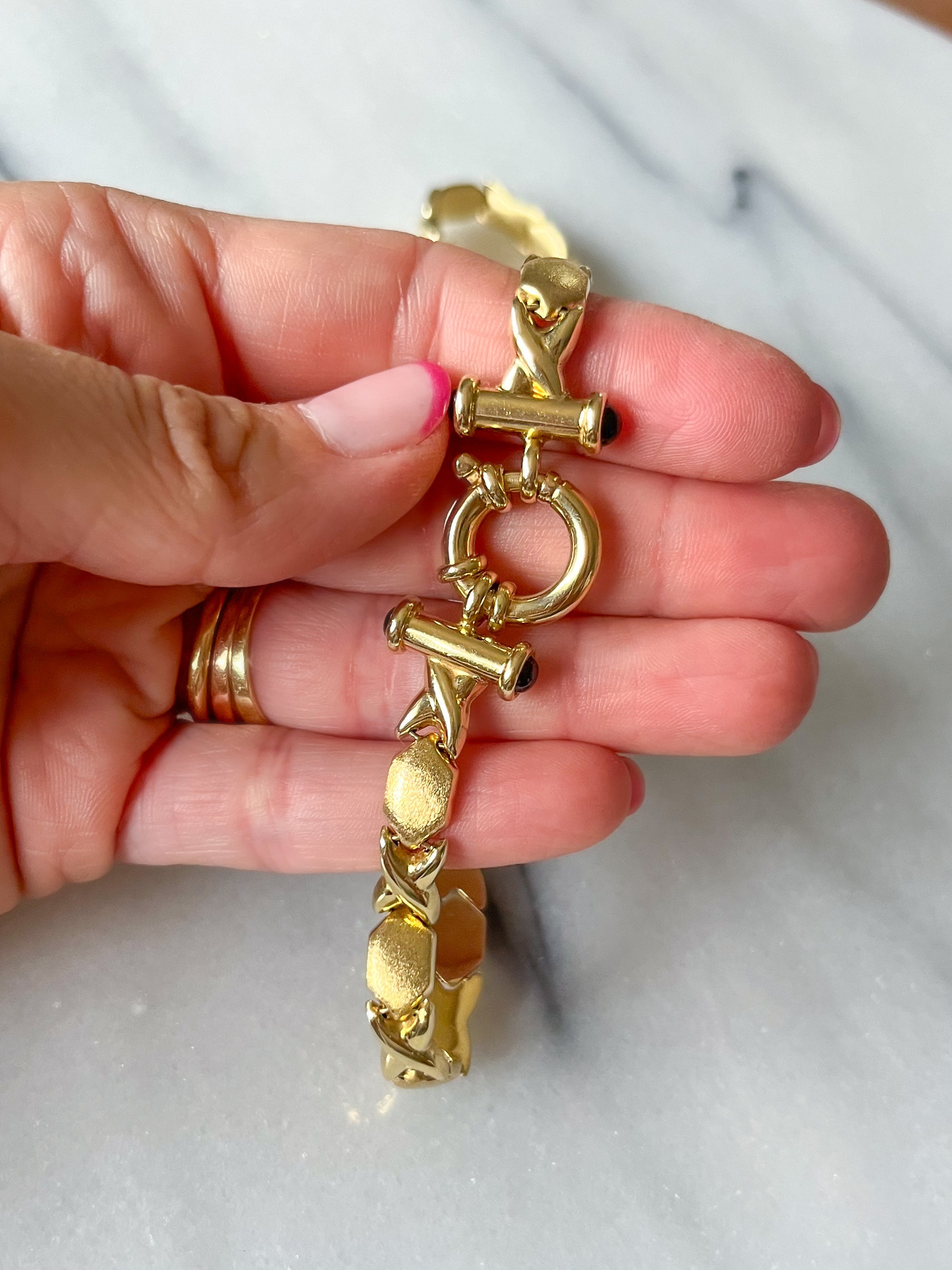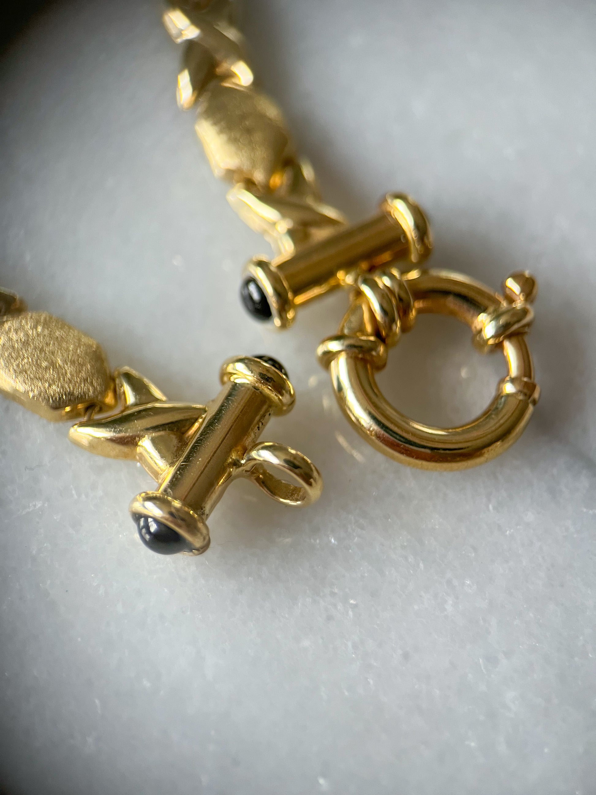 Stunning XOXO 14k yellow gold necklace with a large, super awesome spring ring and toggle clasp, with onyx cabochon accents. Wear it with the clasp in front or back, two totally different styles! Such a beautiful piece, and it has a bracelet to match!